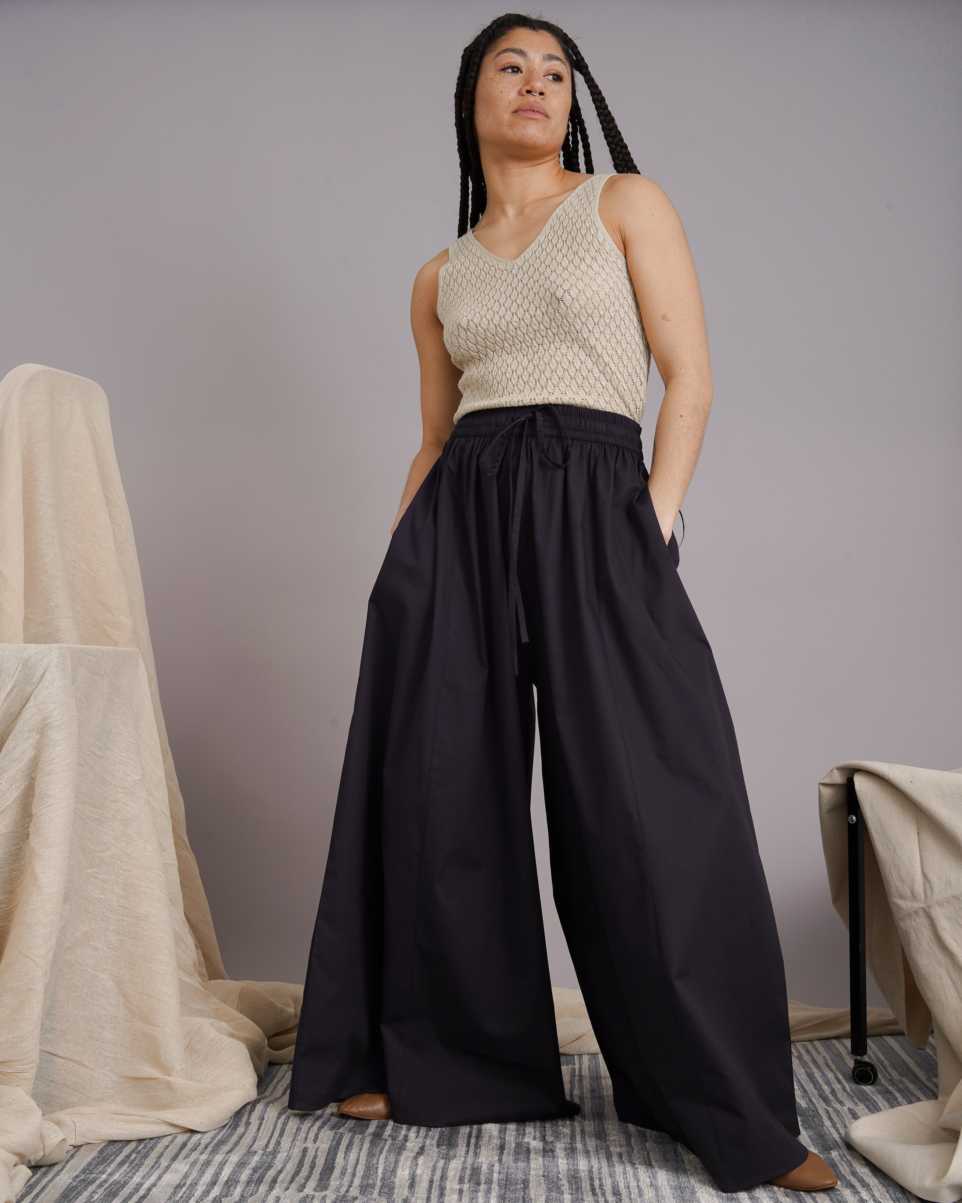 Relaxed wide-leg palazzo trousers in deadstock cotton. Elasticated drawstring waistband. Flowy, full-length silhouette. Panel-cut for movement. Side pockets. Slip-on style.
