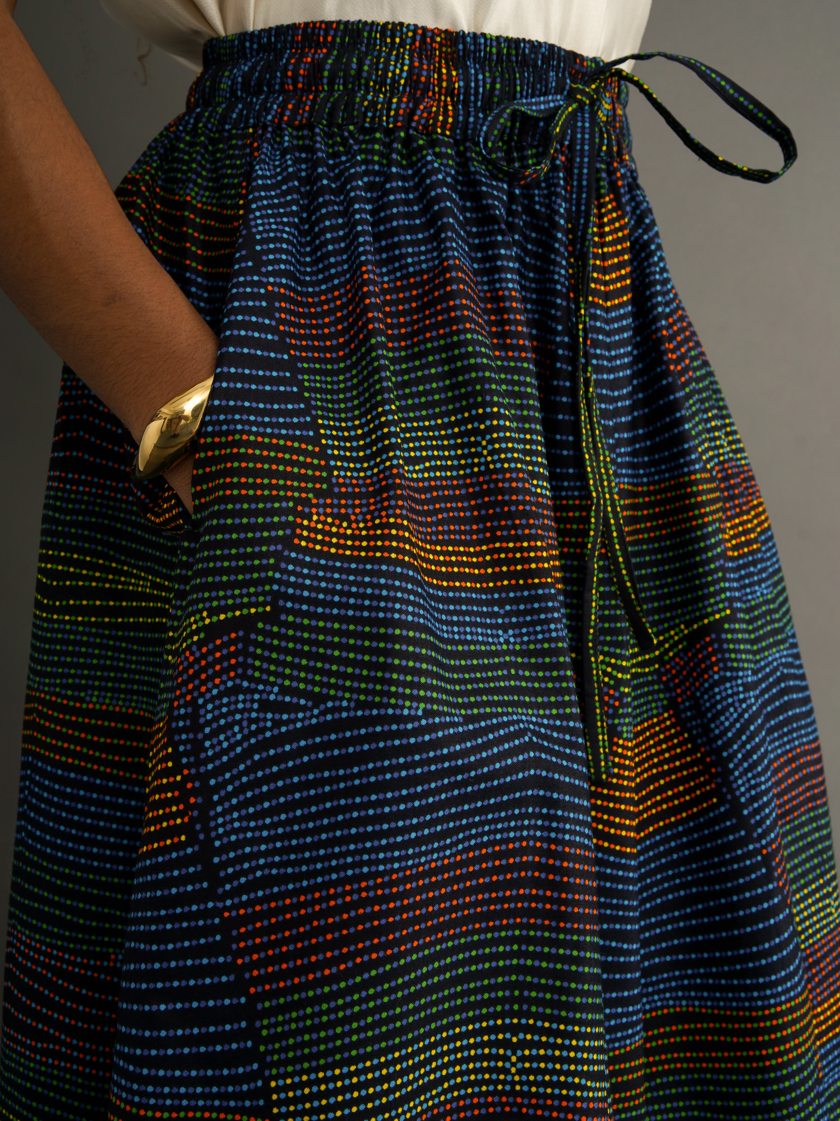 Cut from authentic Dutch wax cotton, the fabric is sourced directly from Balogun Market in Lagos, Nigeria: one of West Africa’s most historic textile markets. This isn’t mass-produced wax print. It’s the real thing: richly coloured, durable, and designed to hold its structure while softening beautifully with wear.