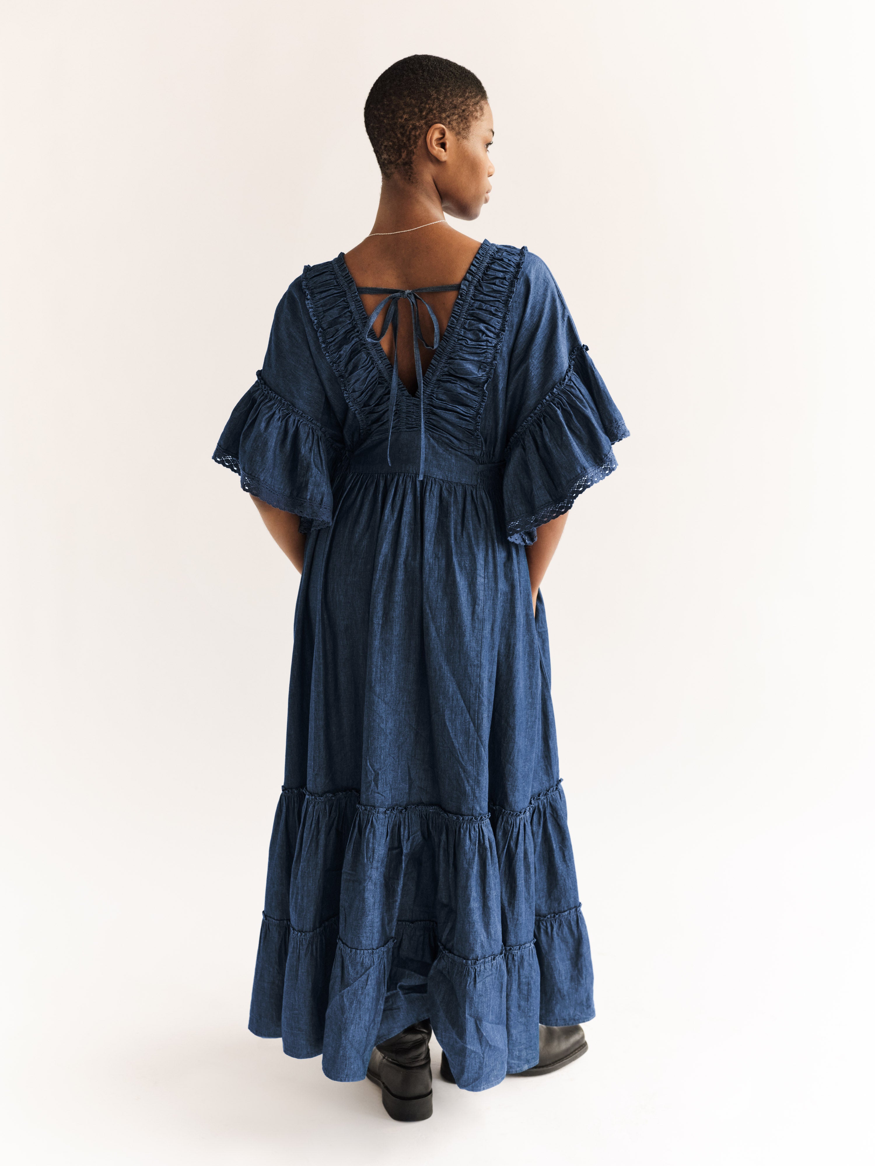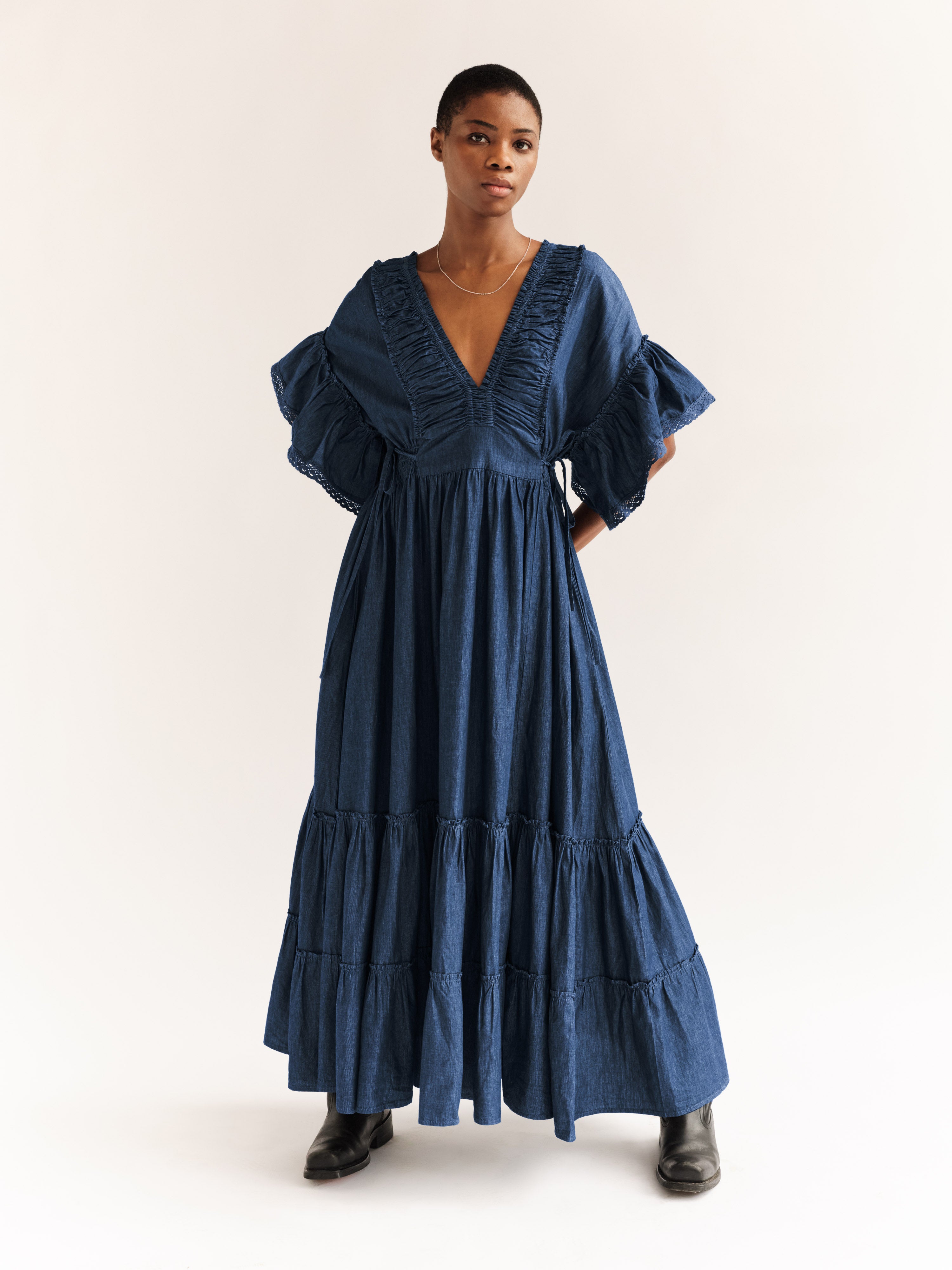 Relaxed yet refined take on denim dressing, this 100% cotton maxi dress is designed for movement and ease. Crafted in blue wash denim, it features a soft V-neckline, ruffle detailing, and voluminous tiered sleeves with lace trim. Adjustable ties at the waist and back neck create a custom fit, while the flowing tiered skirt adds effortless elegance.