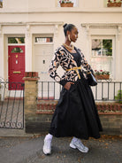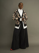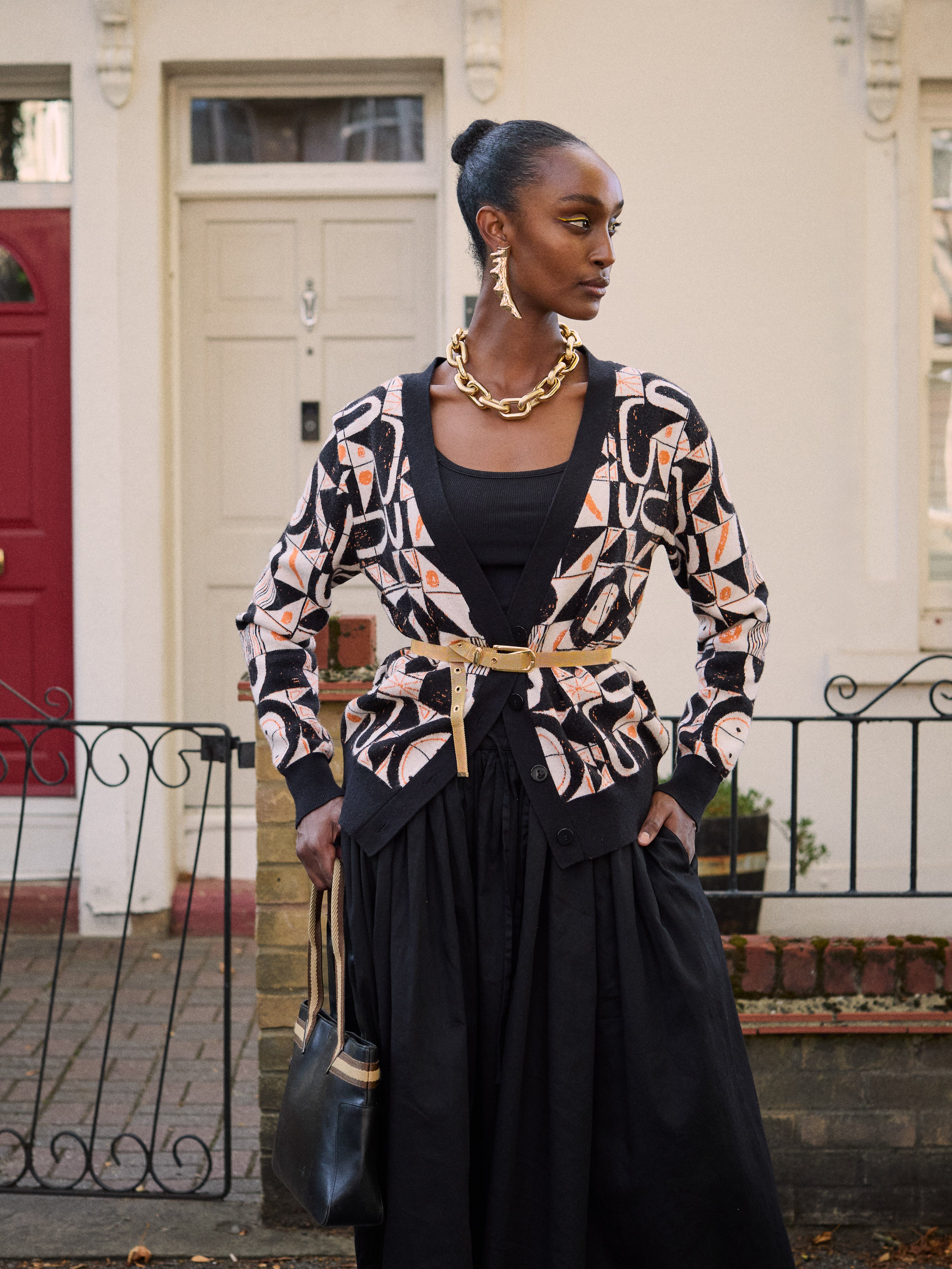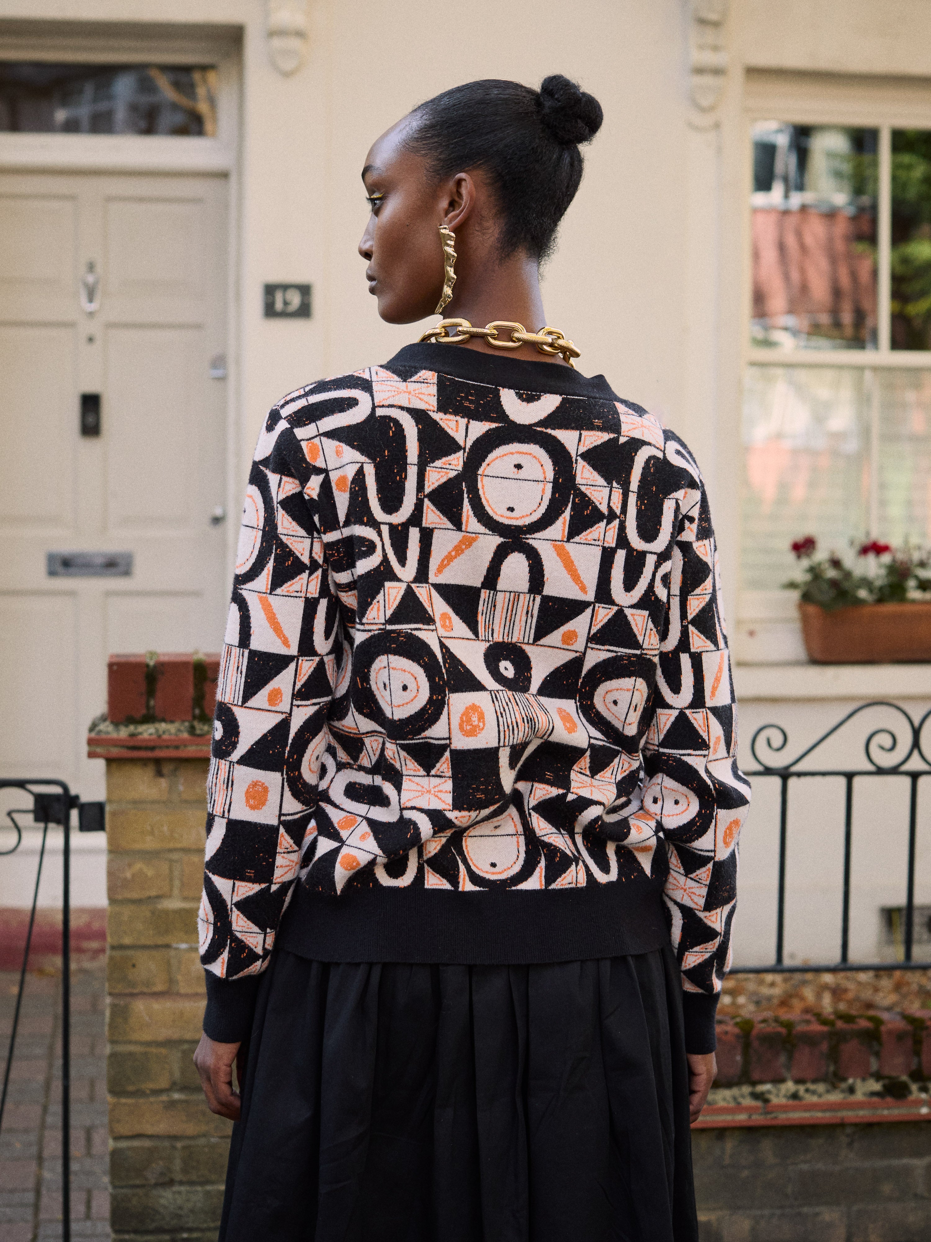 The Ada Cardigan is made for women who want to be seen. Knitted in a bold abstract print with black trims, it brings confidence to whatever you wear it with.