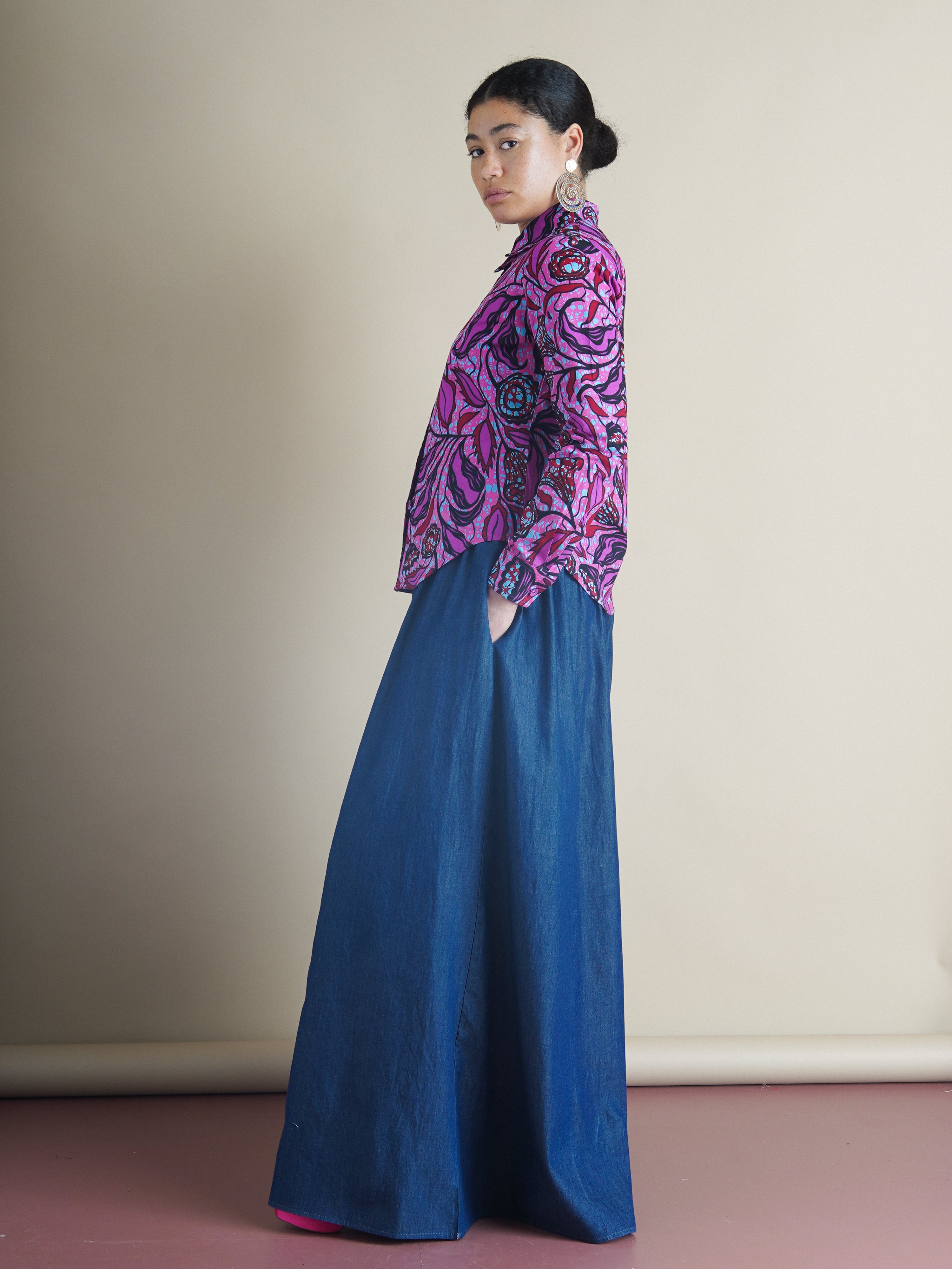 Relaxed, full-length palazzo trousers cut from soft-washed, 100% cotton denim. Lightweight yet structured, they move easily through your day with a wide-leg silhouette that balances ease and intention.