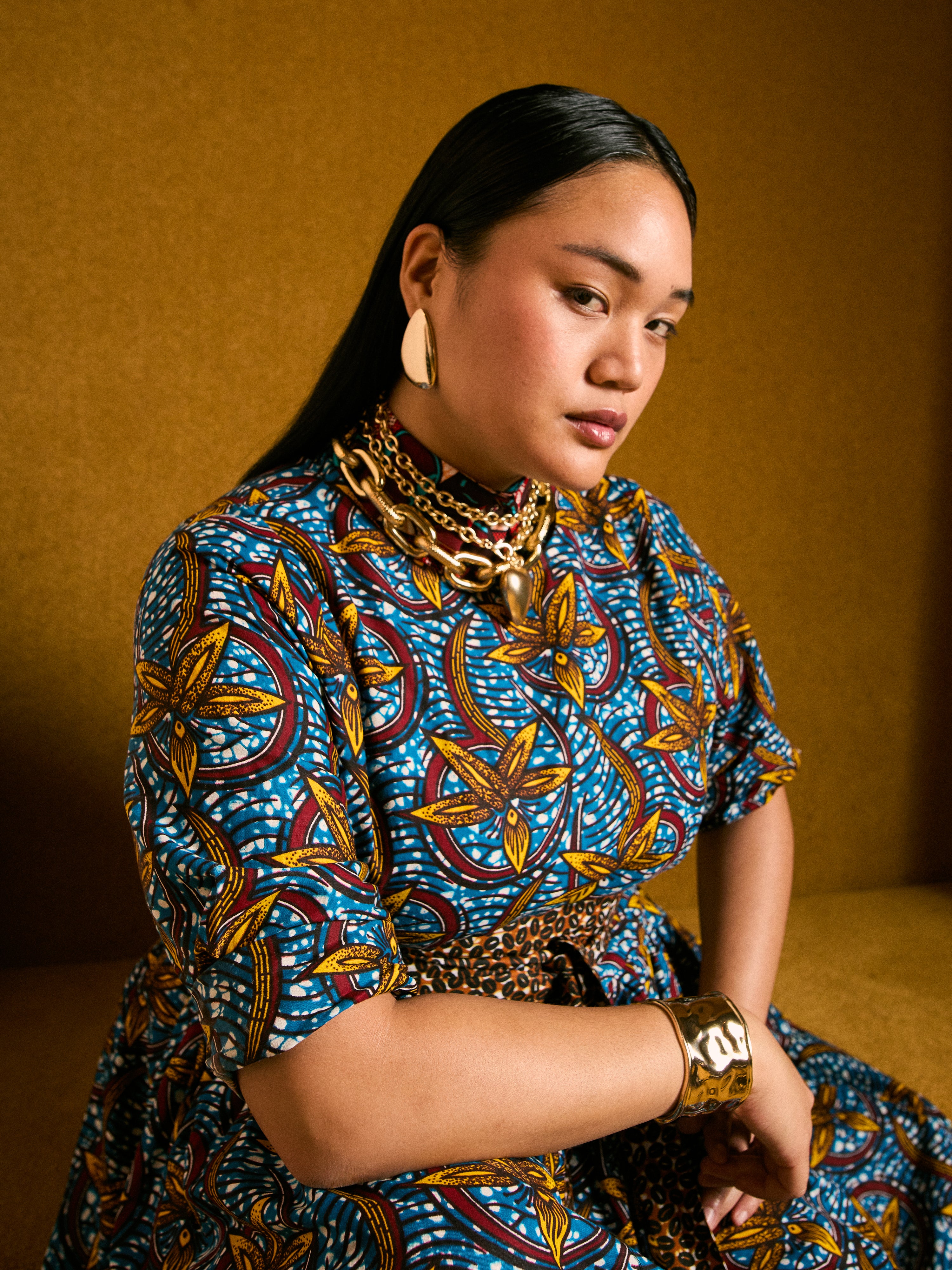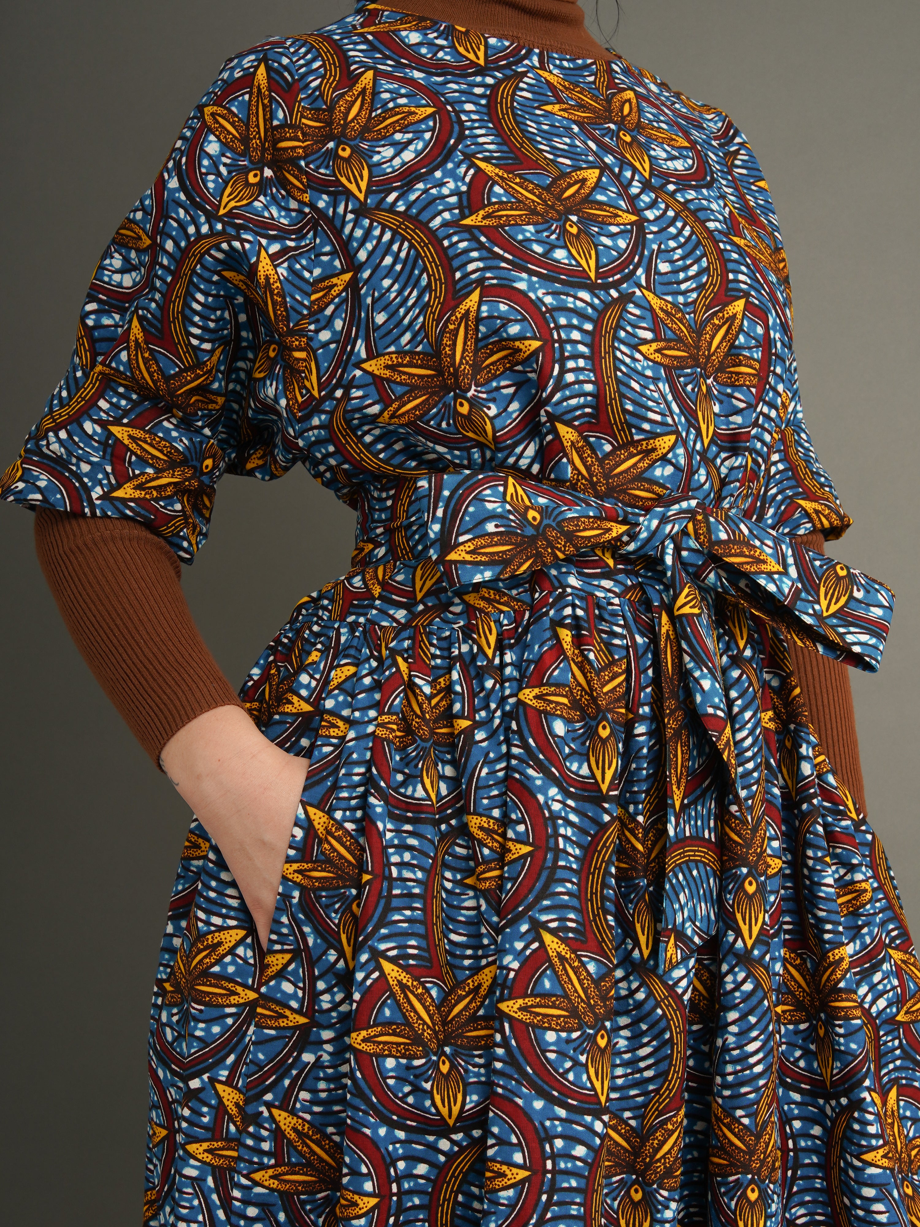 Mid-weight Dutch wax cotton with bold structure and shape. An easy, generous fit with the option to cinch at the waist. Finished with side pockets.