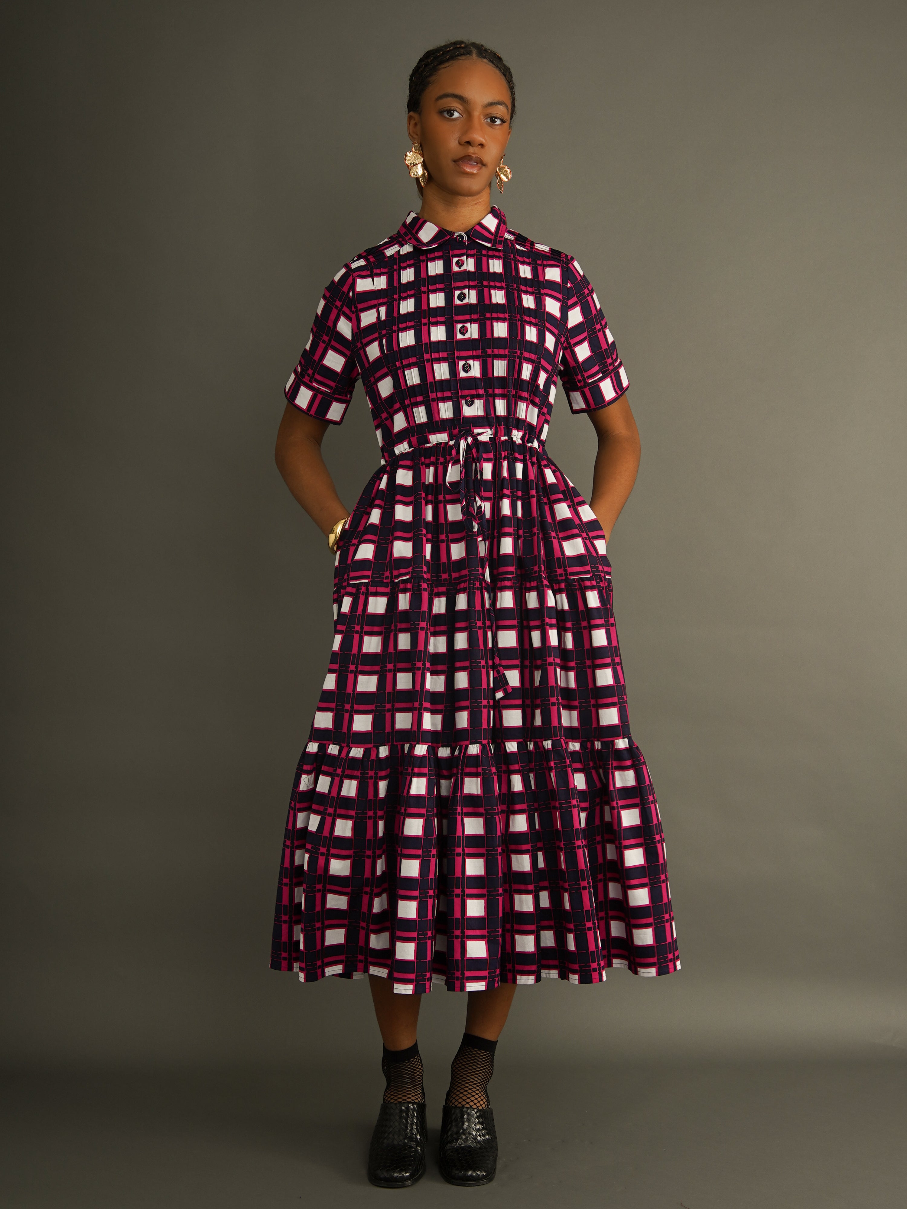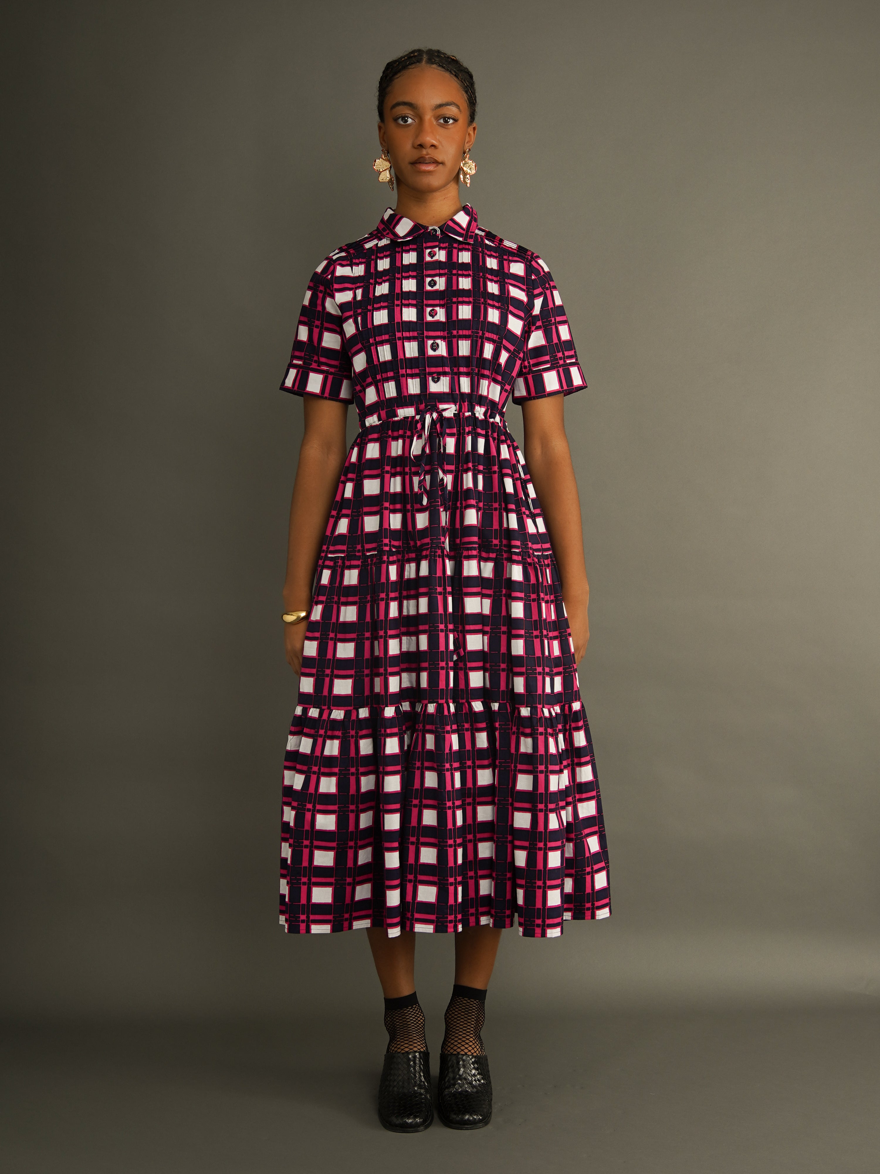 Finished with a classic shirt collar, short sleeves with turn-ups, and a layered skirt, the Aisha Dress is easy to elevate or keep relaxed. Wear it with trainers or sandals in summer, and boots when the weather turns cooler.