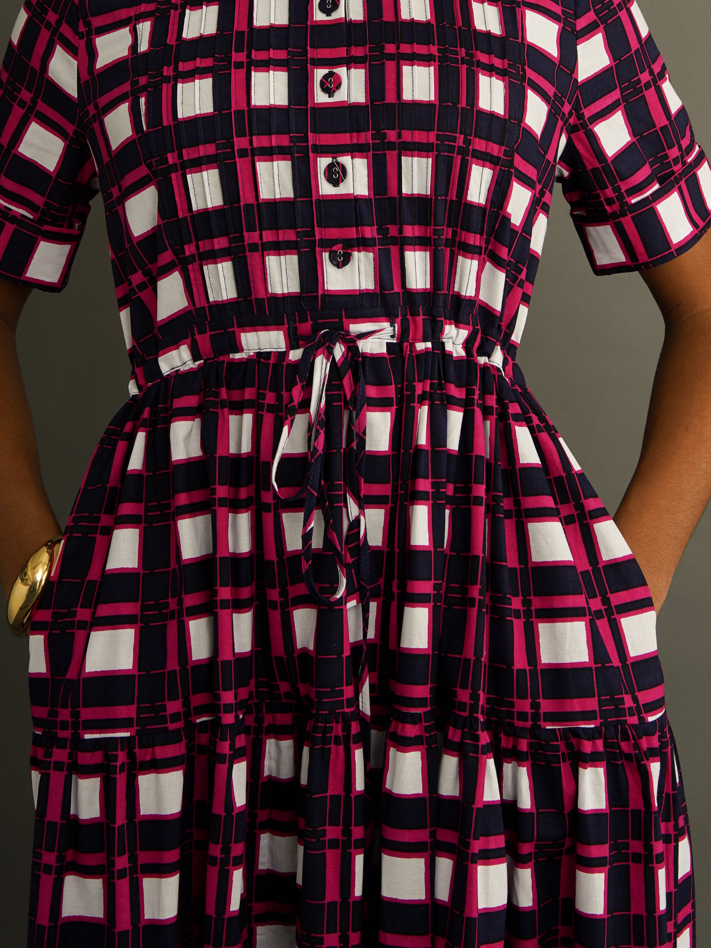 Drawstring waist for an adjustable, personalised fit. Classic shirt collar with front button fastening. Hand-sewn pintuck pleats on bodice and shoulders. Short sleeves with turn-ups. Layered skirt for movement and ease. Crafted from mid-weight, structured 100% cotton