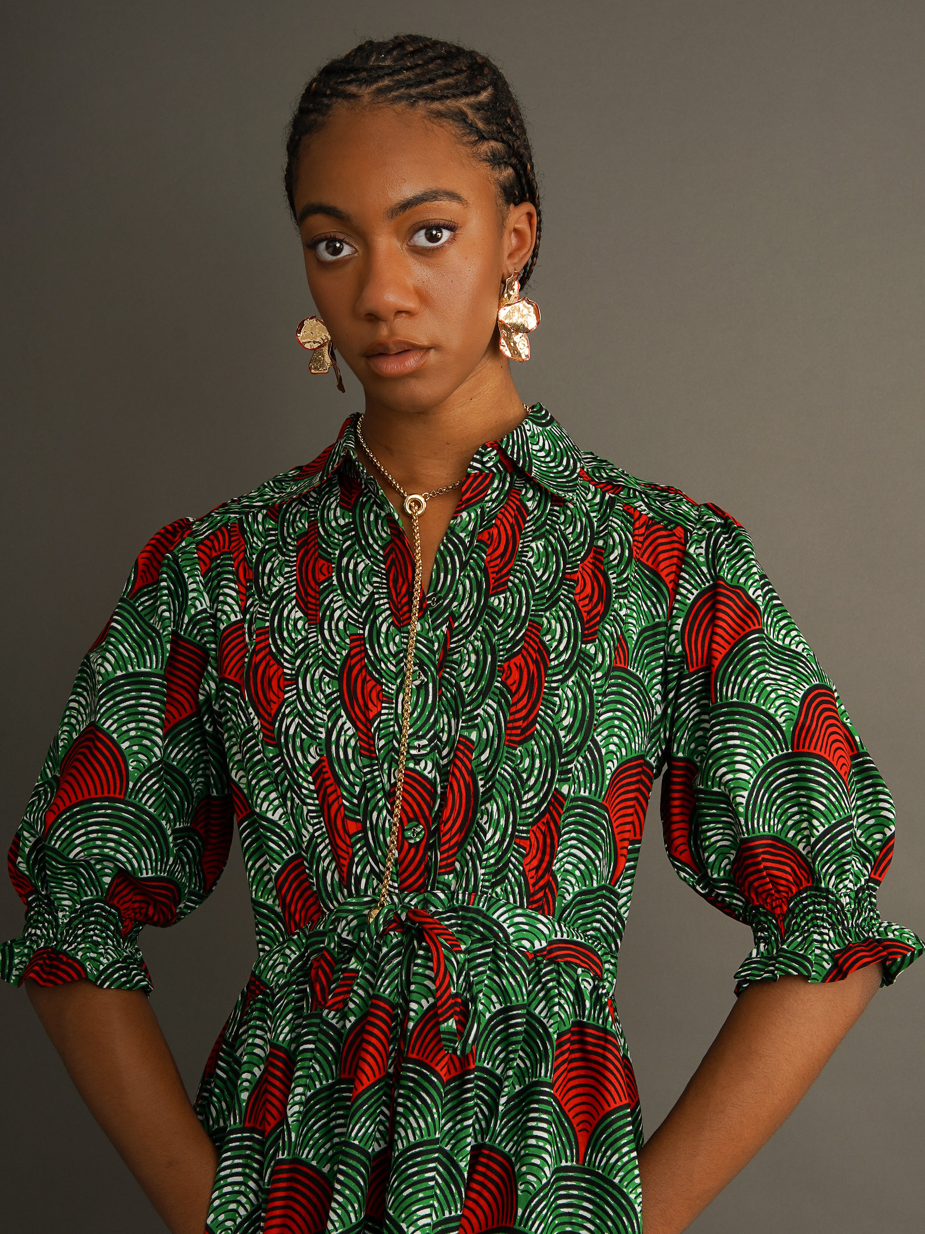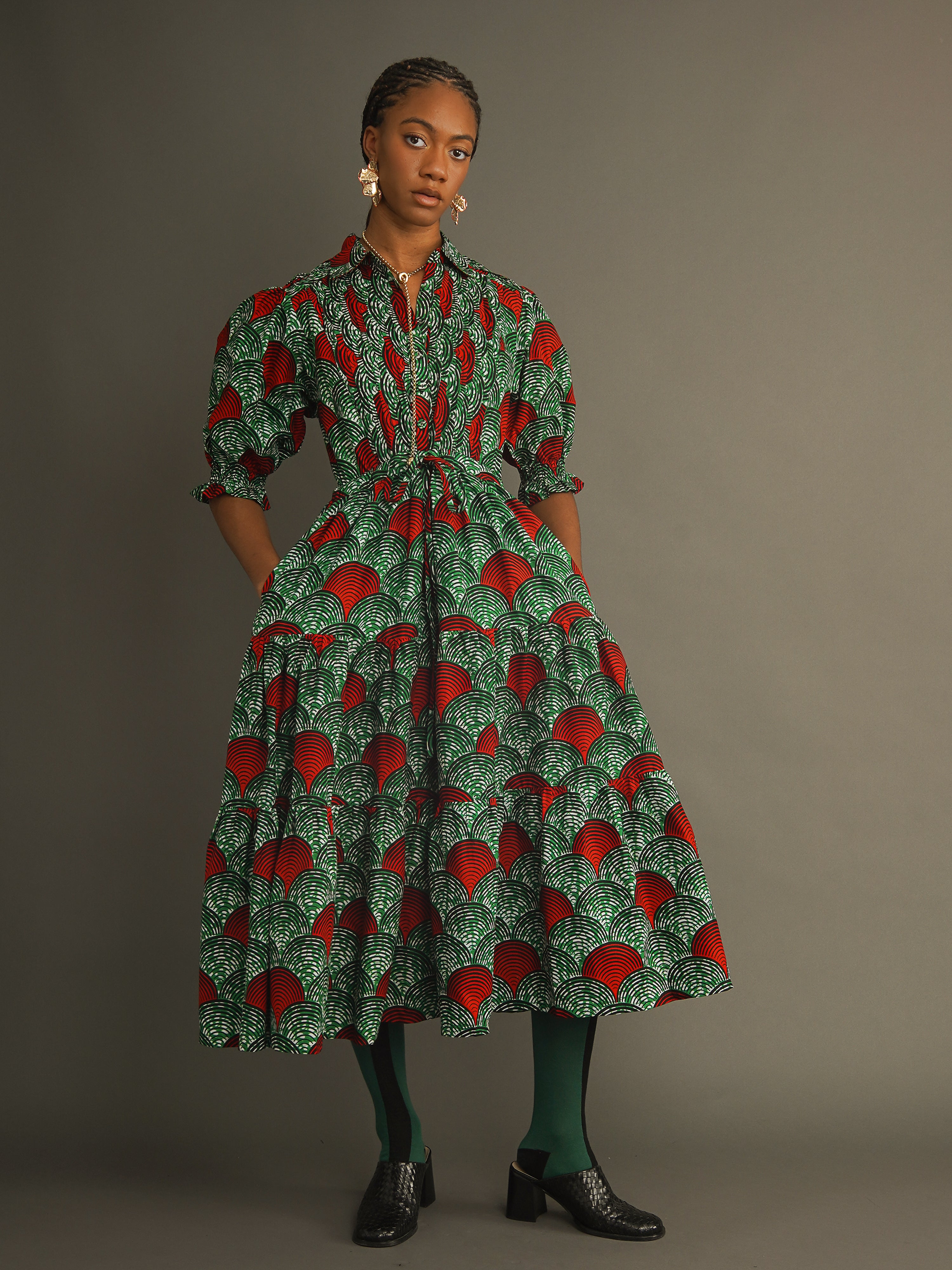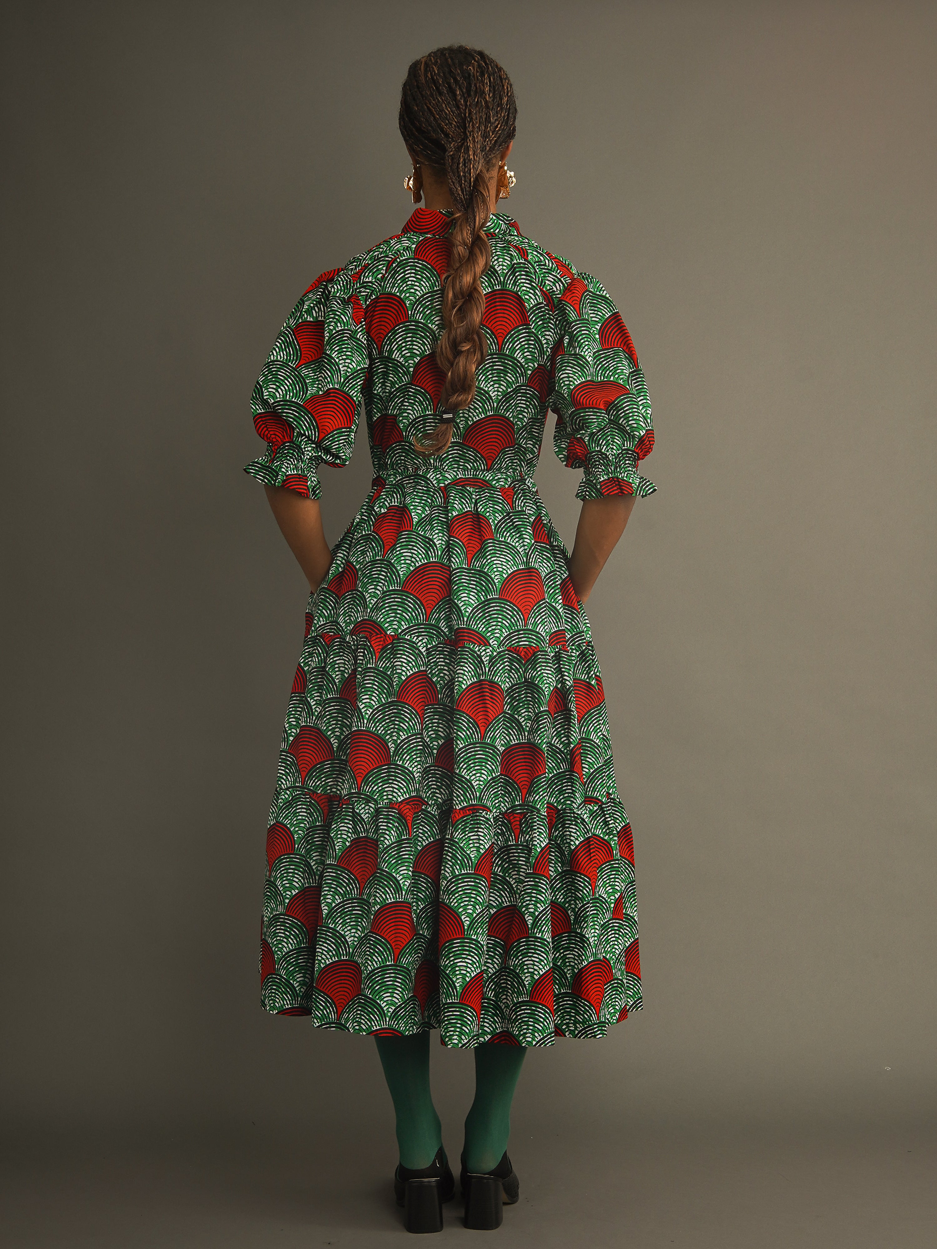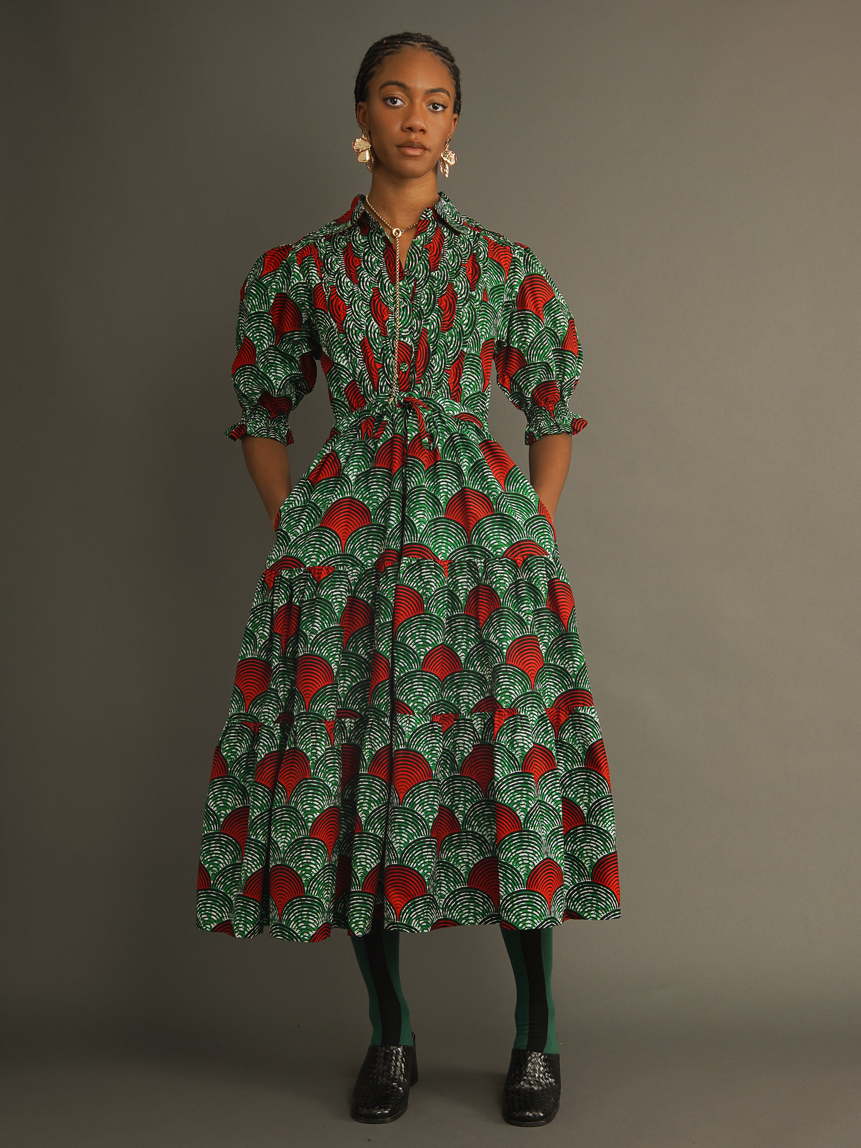 A signature Kemi Telford silhouette, the Akure Drawstring Dress is cut from lightweight 100% Dutch wax cotton — soft, breathable, and full of character. The hand-sewn pintucks across the bodice and shoulders add quiet detail, while the adjustable drawstring waist creates a flattering, comfortable fit.
