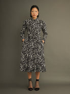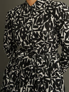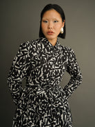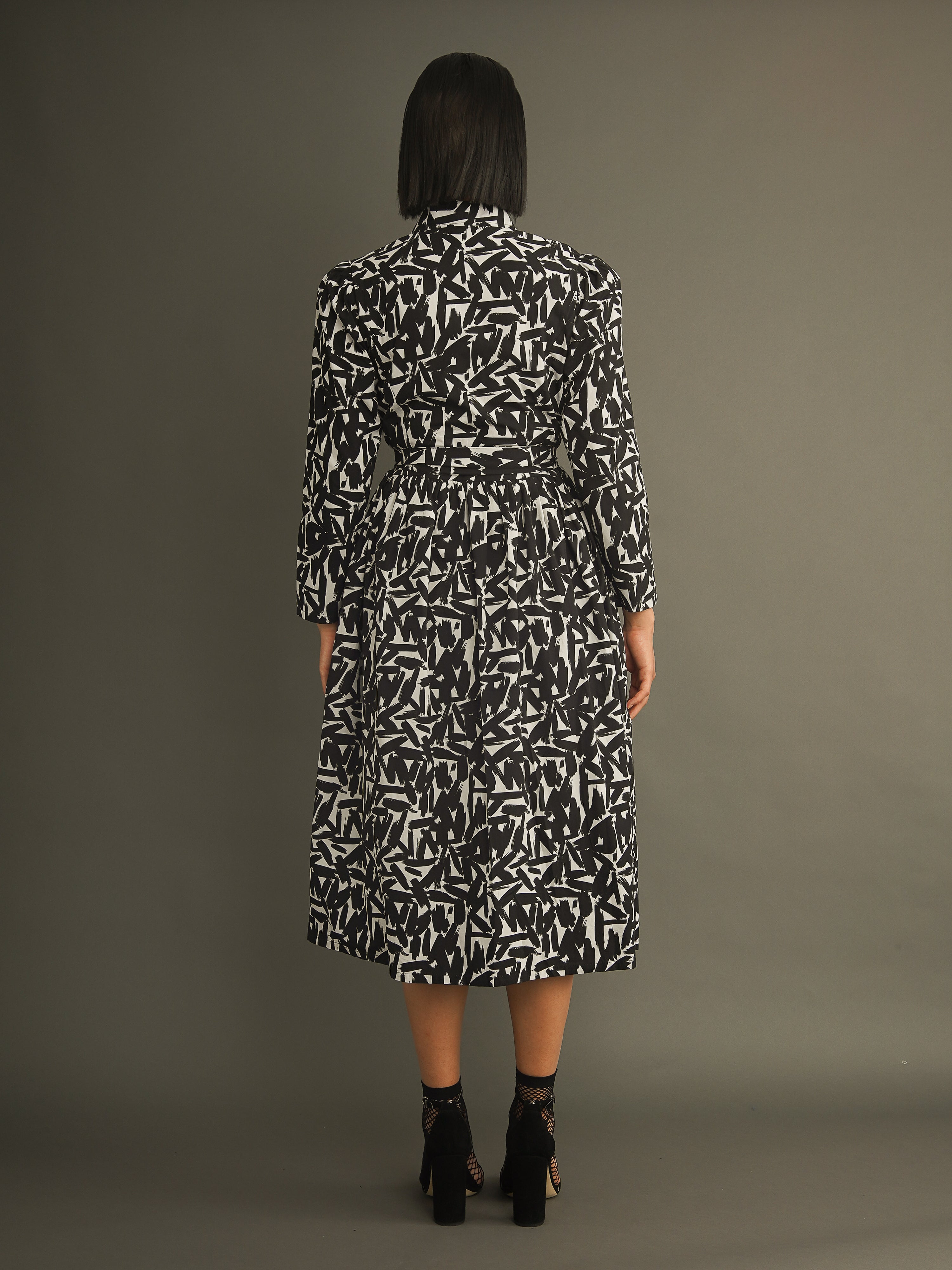 The Amina Dress is cut from soft-yet-structured cotton poplin, printed with an abstract black-and-white brushstroke motif that feels like movement on fabric. A piece that speaks before you do.