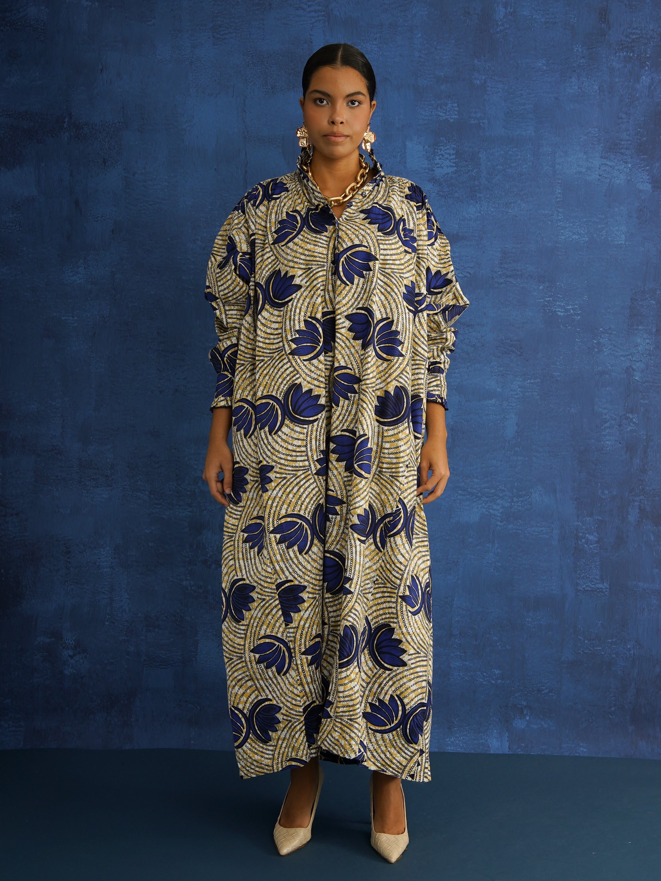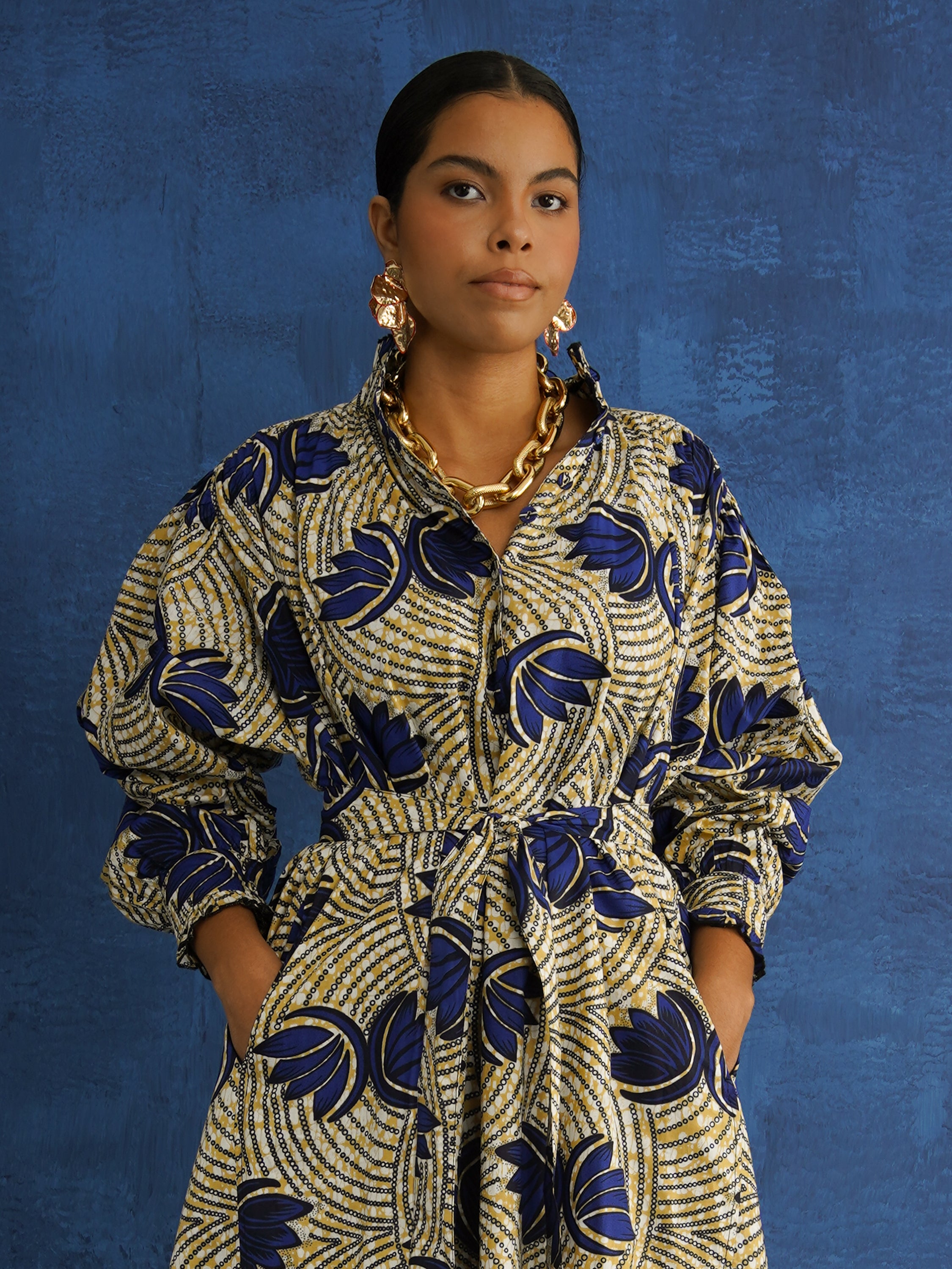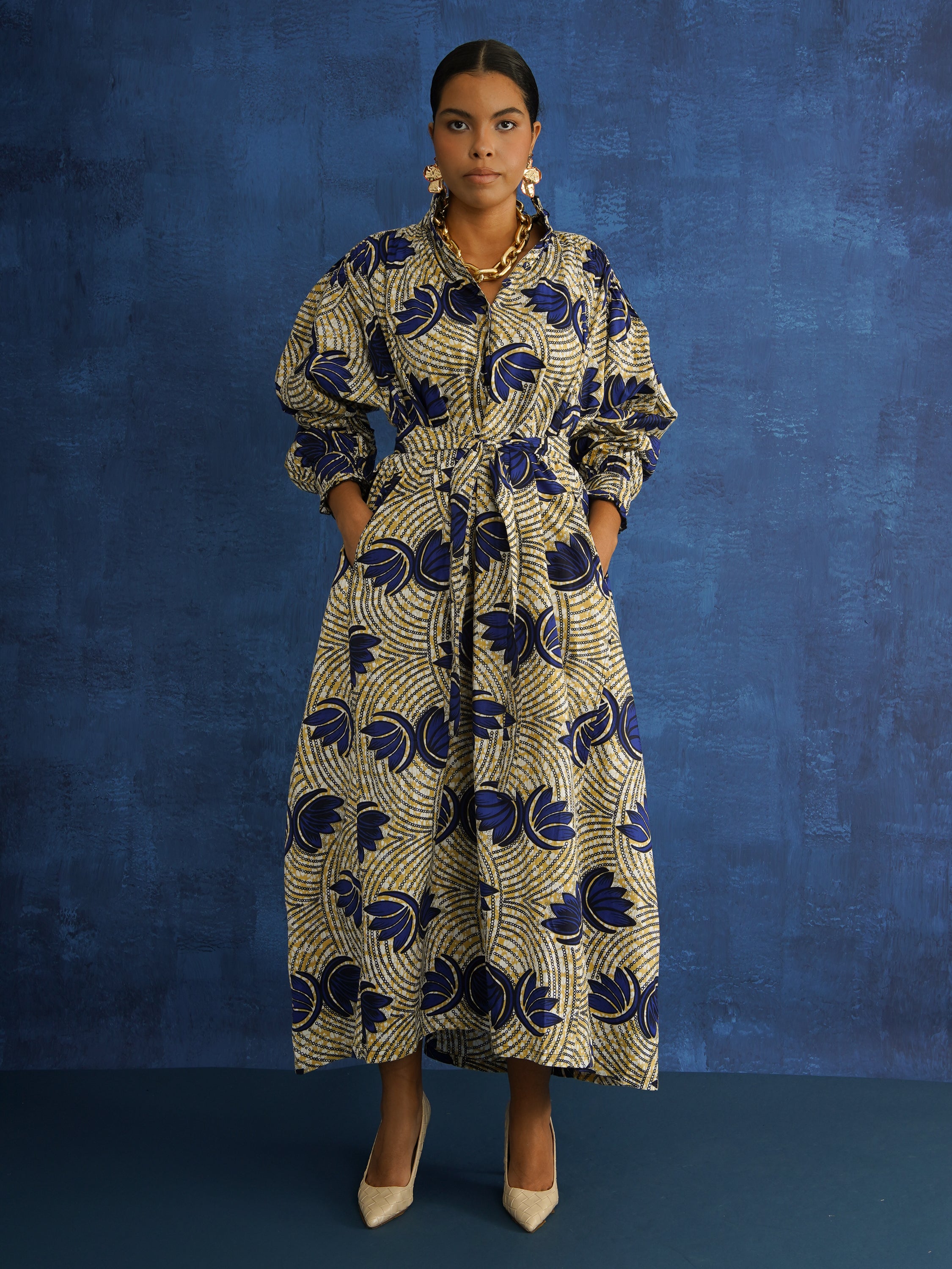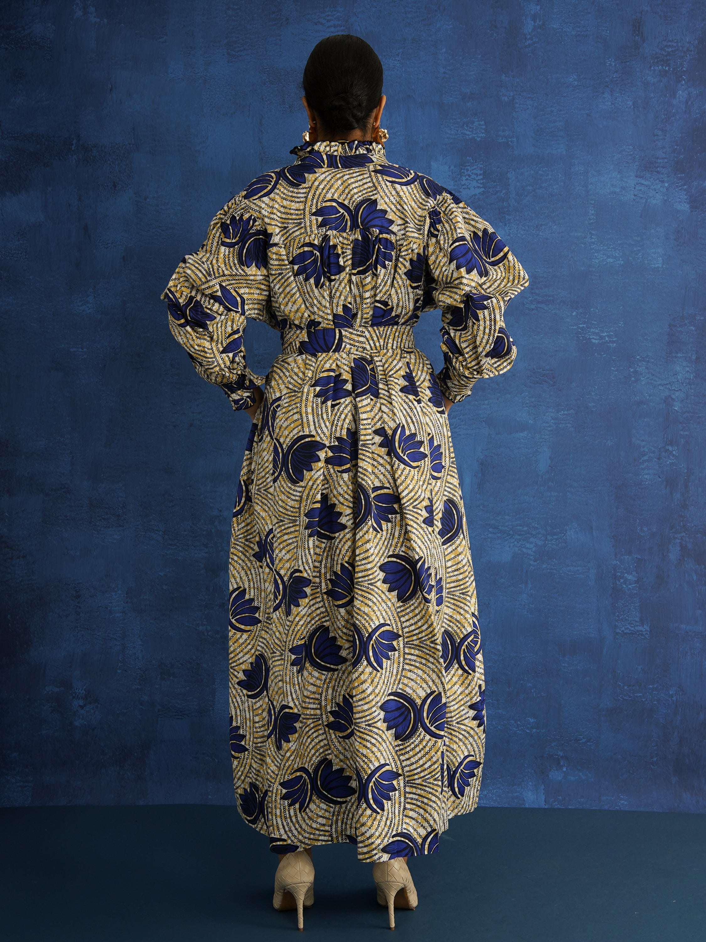 Crafted from 100% mid-weight Dutch wax cotton, this one-of-a-kind piece blends sculptural shape with everyday ease. The vibrant cloth gives structure, allowing the voluminous silhouette to hold its form while still moving with you.