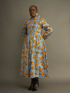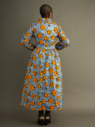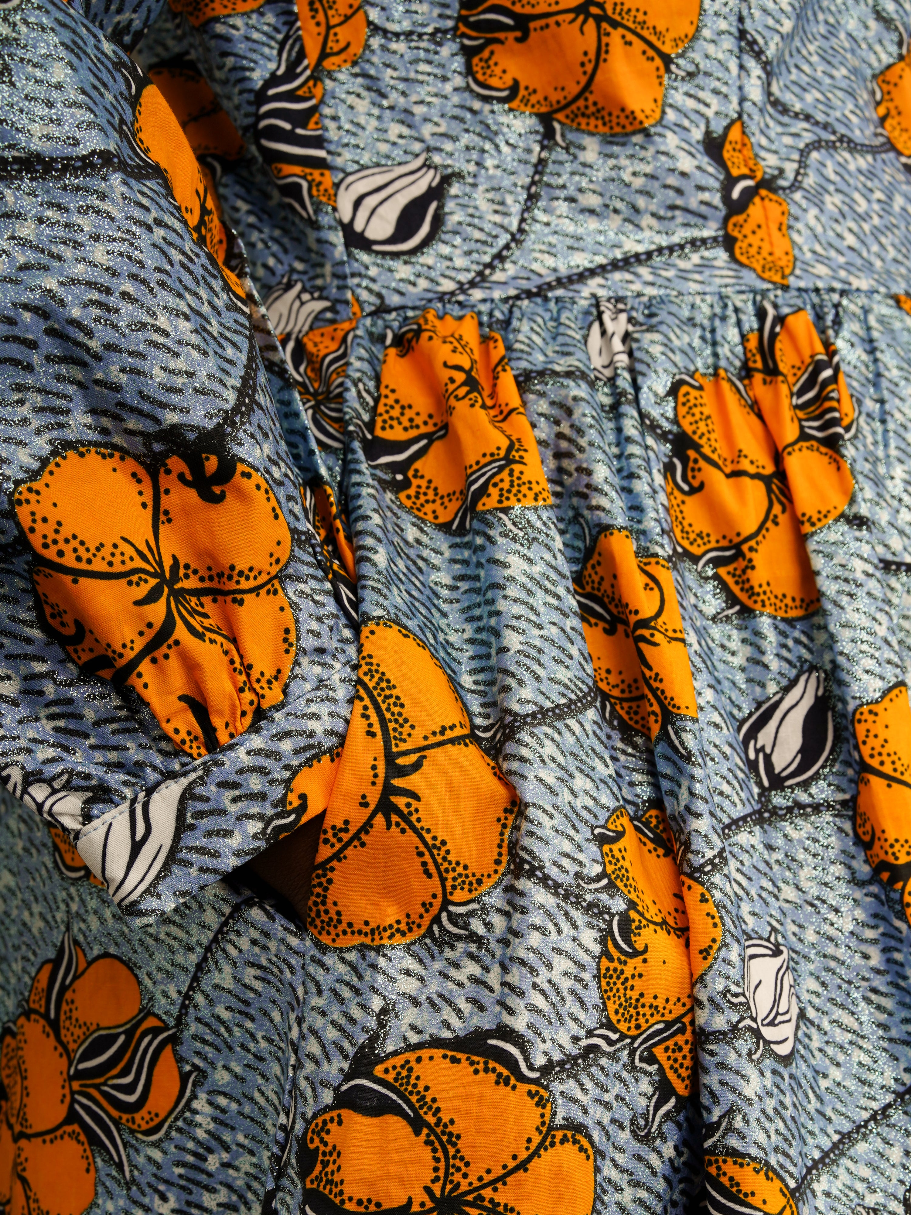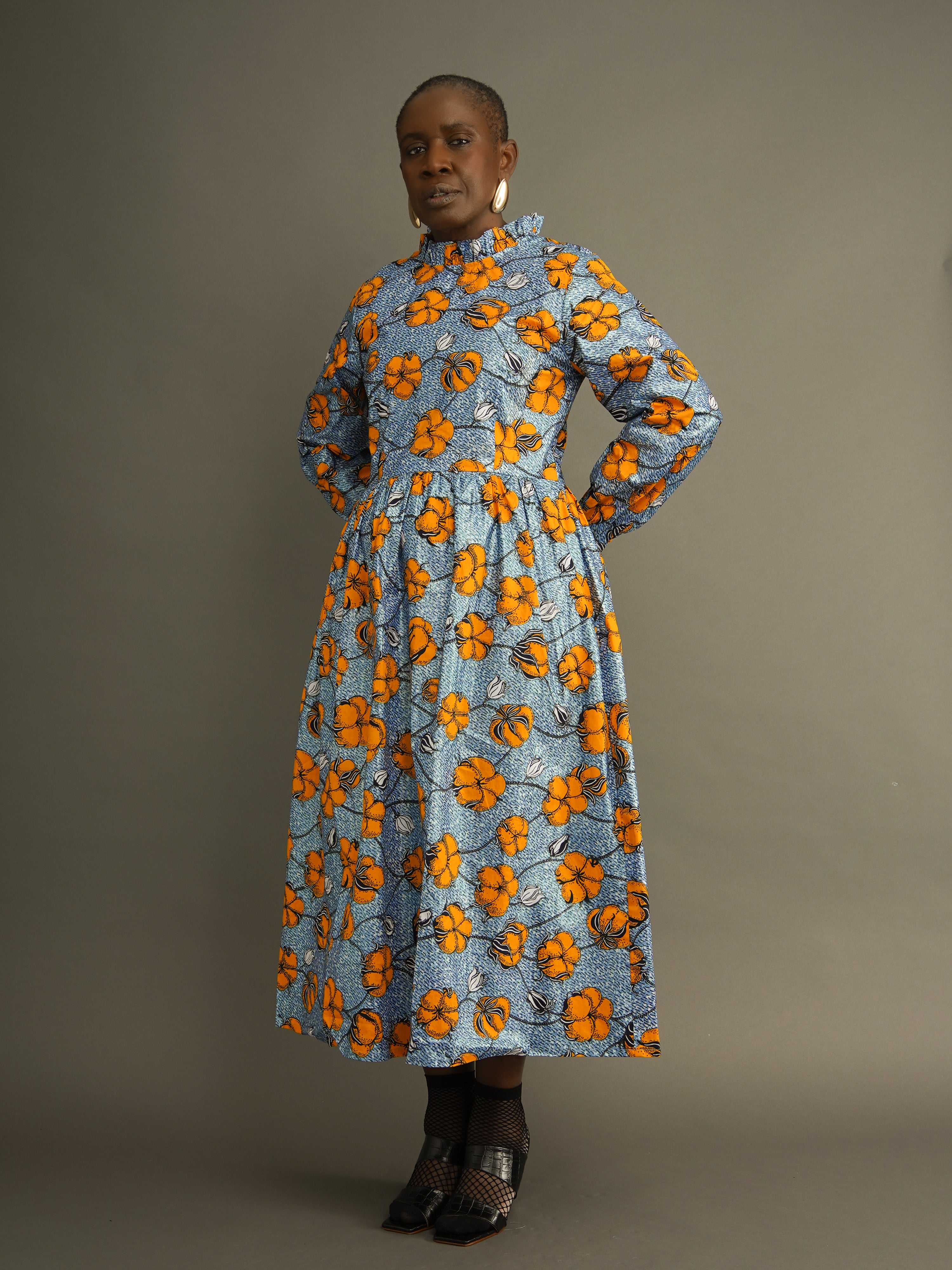 Crafted from 100% Structured cotton golden wax fabric, this dress combines bold colours with a subtle sparkle that catches the light beautifully. The fitted bodice and structured design create a flattering silhouette, while the ruffle neck and full-length sleeves add just the right amount of drama.