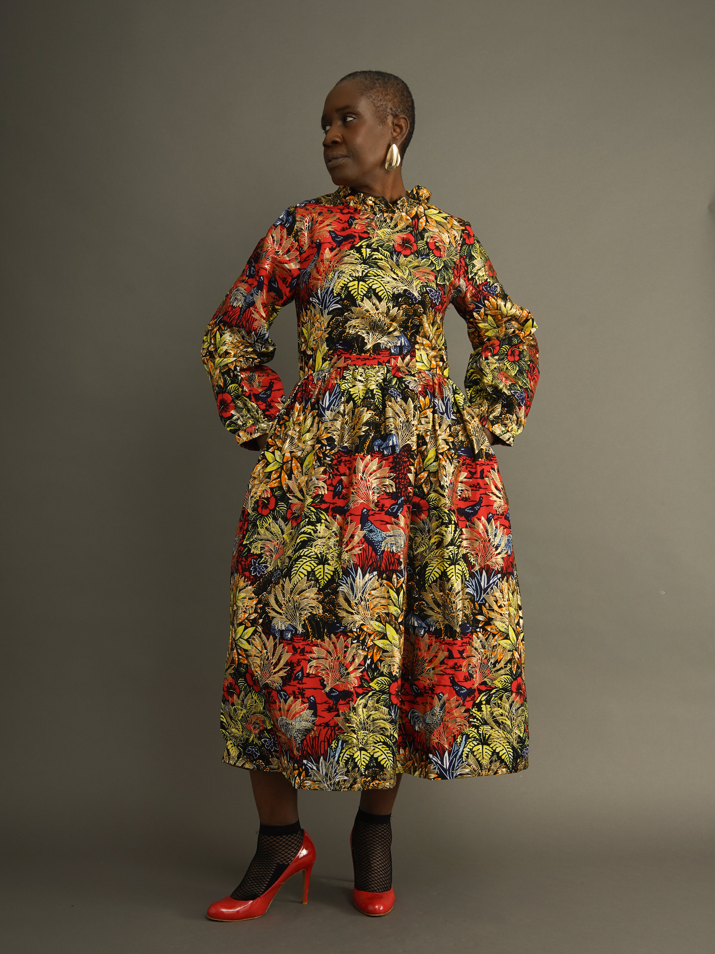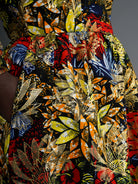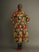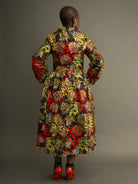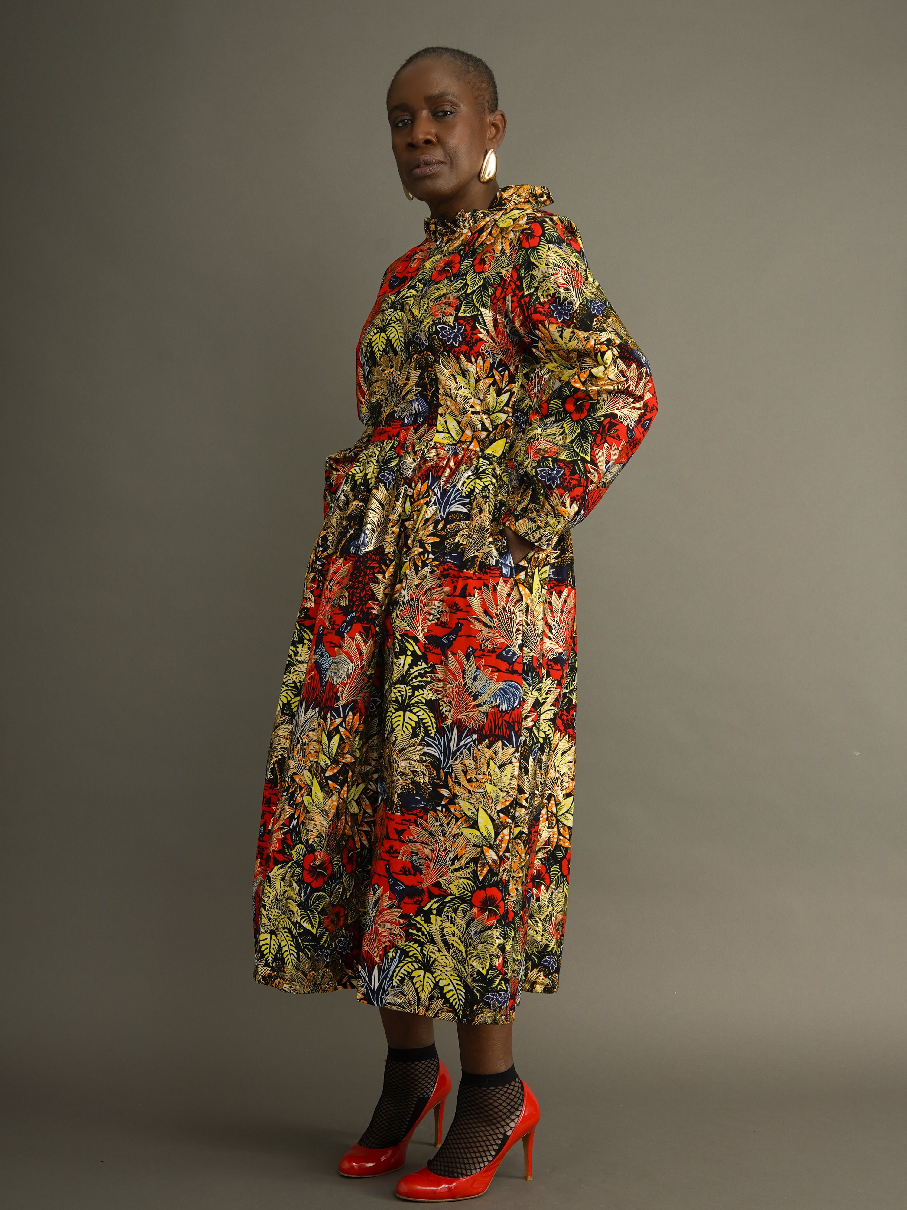 Crafted from 100% cotton golden wax fabric, this dress combines bold colours with a subtle sparkle that catches the light beautifully. The fitted bodice and structured design create a flattering silhouette, while the ruffle neck and full-length sleeves add just the right amount of drama.
