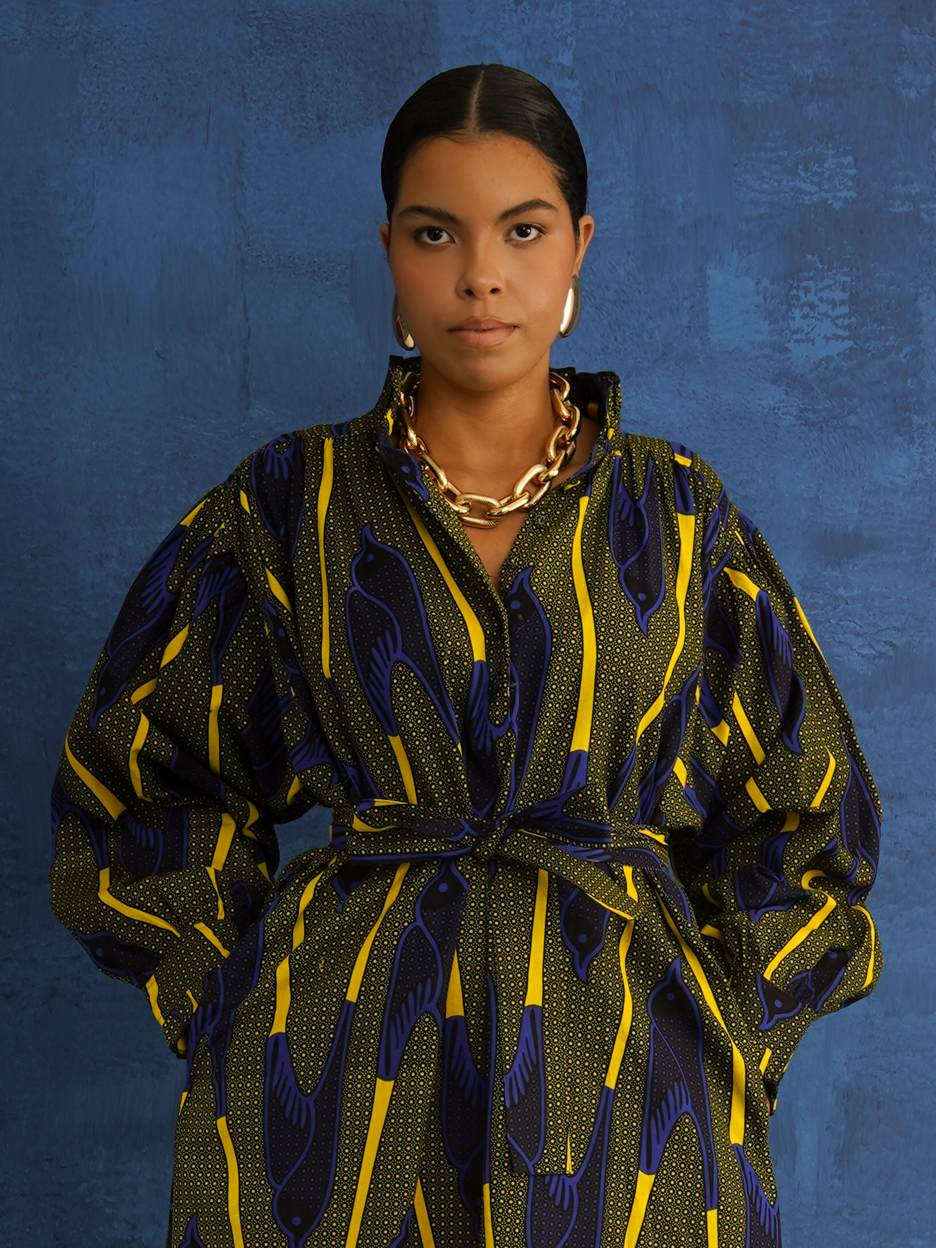 Crafted from 100% mid-weight Dutch wax cotton, this one-of-a-kind piece blends sculptural shape with everyday ease. The vibrant cloth gives structure, allowing the voluminous silhouette to hold its form while still moving with you.