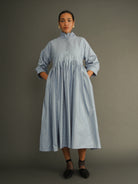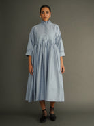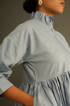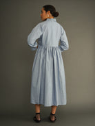 The high ruffle neckline and covered button placket give Doyin its sculptural, refined finish, while the gently gathered waist allows for movement and ease without overpowering your shape. Finished with three-quarter sleeves, side pockets, and a flowing midi length, it’s a piece you’ll return to season after season.
