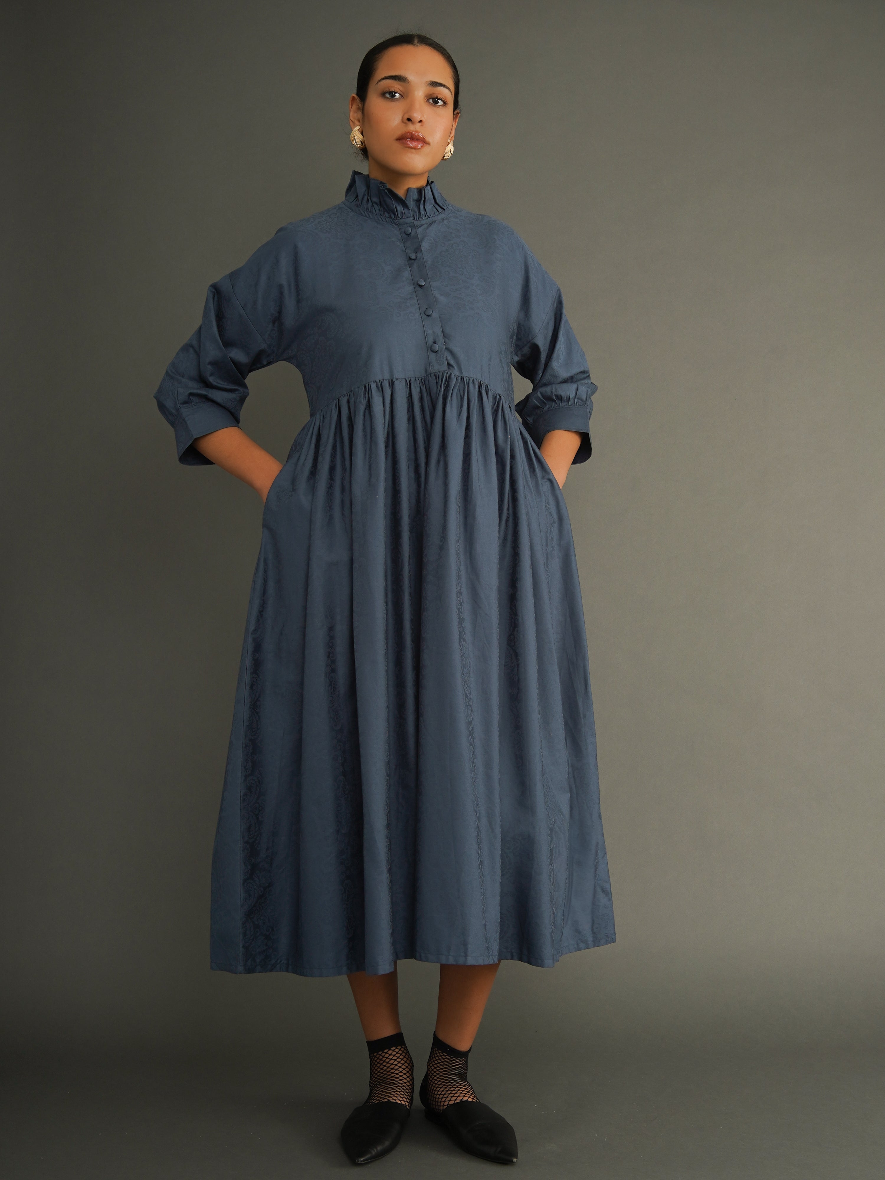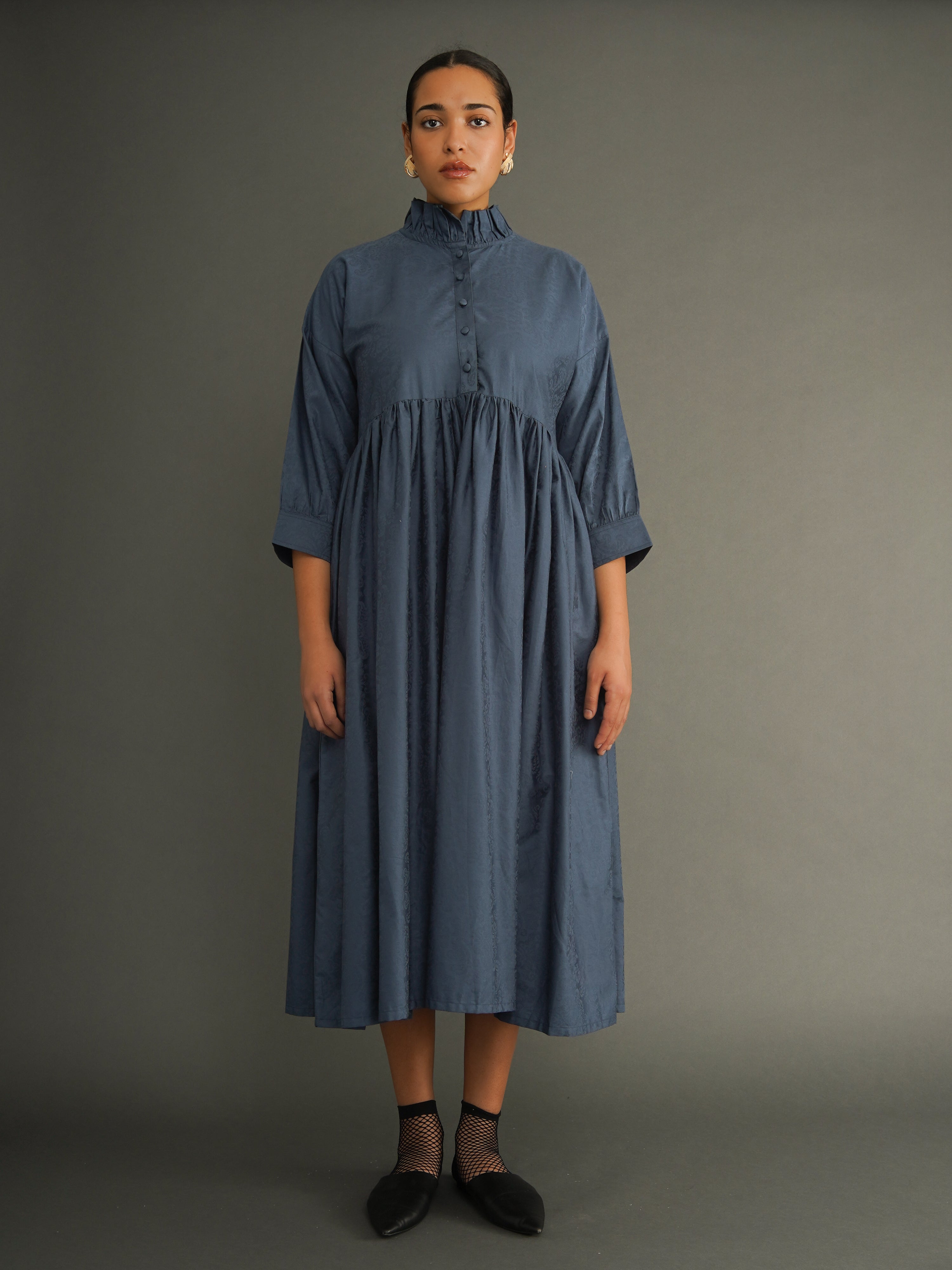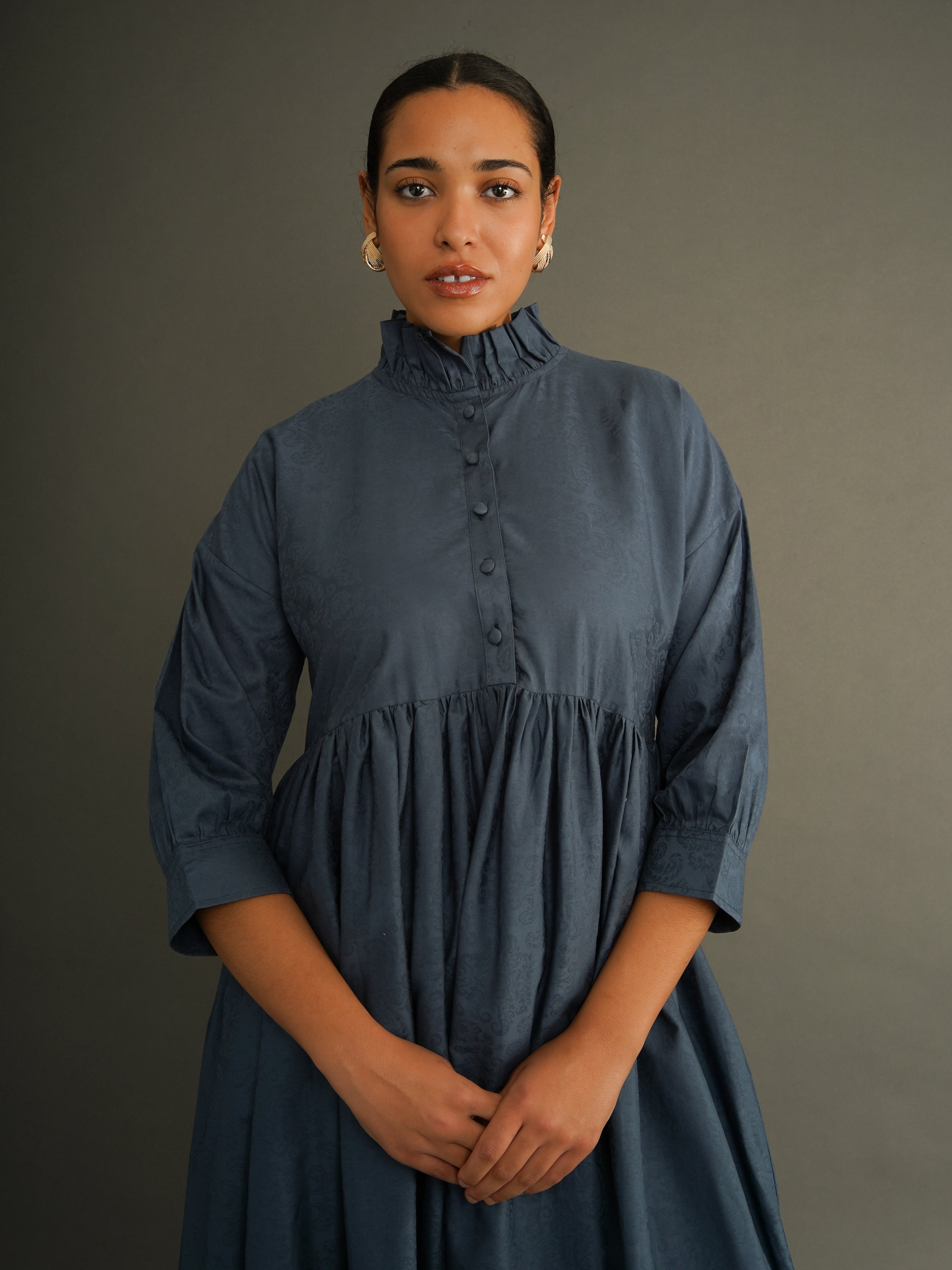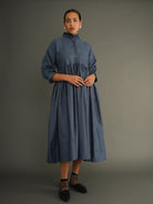 The high ruffle neckline and covered button placket give Doyin its sculptural, refined finish, while the gently gathered waist allows for movement and ease without overpowering your shape. Finished with three-quarter sleeves, side pockets, and a flowing midi length, it’s a piece you’ll return to season after season.