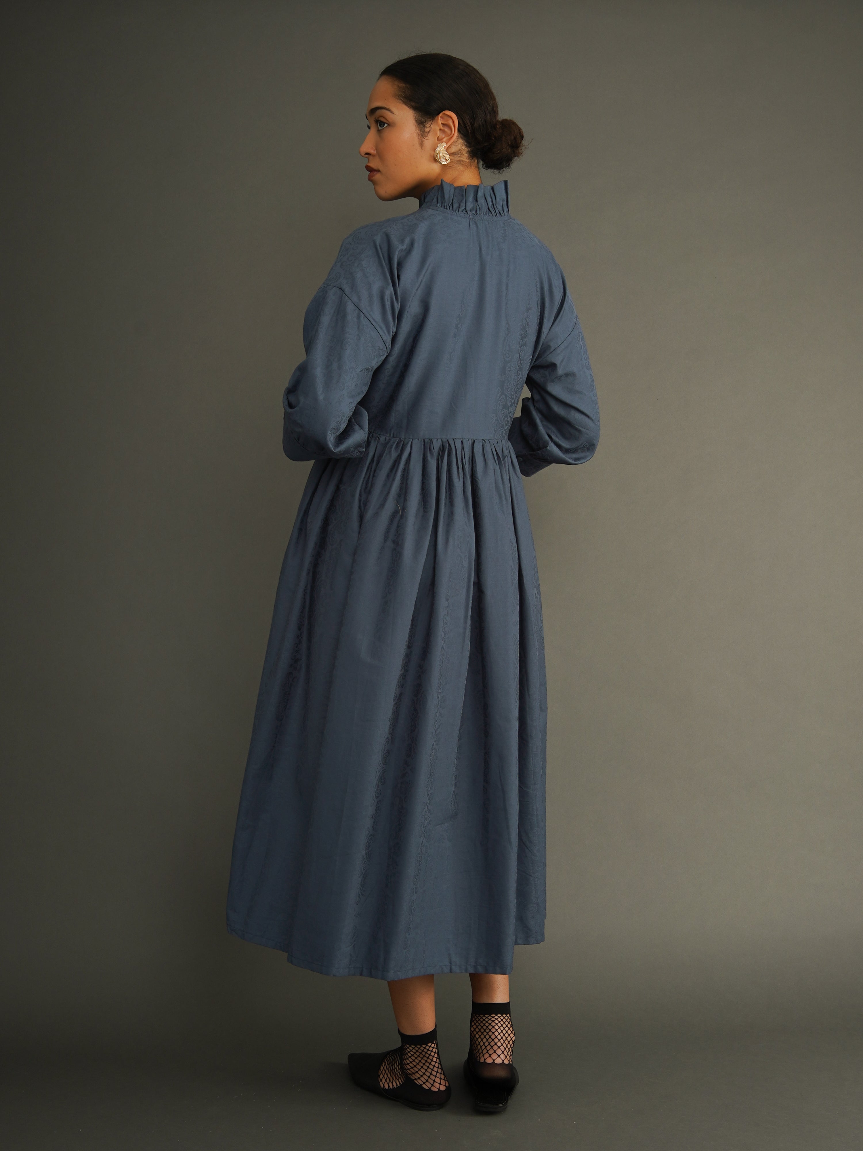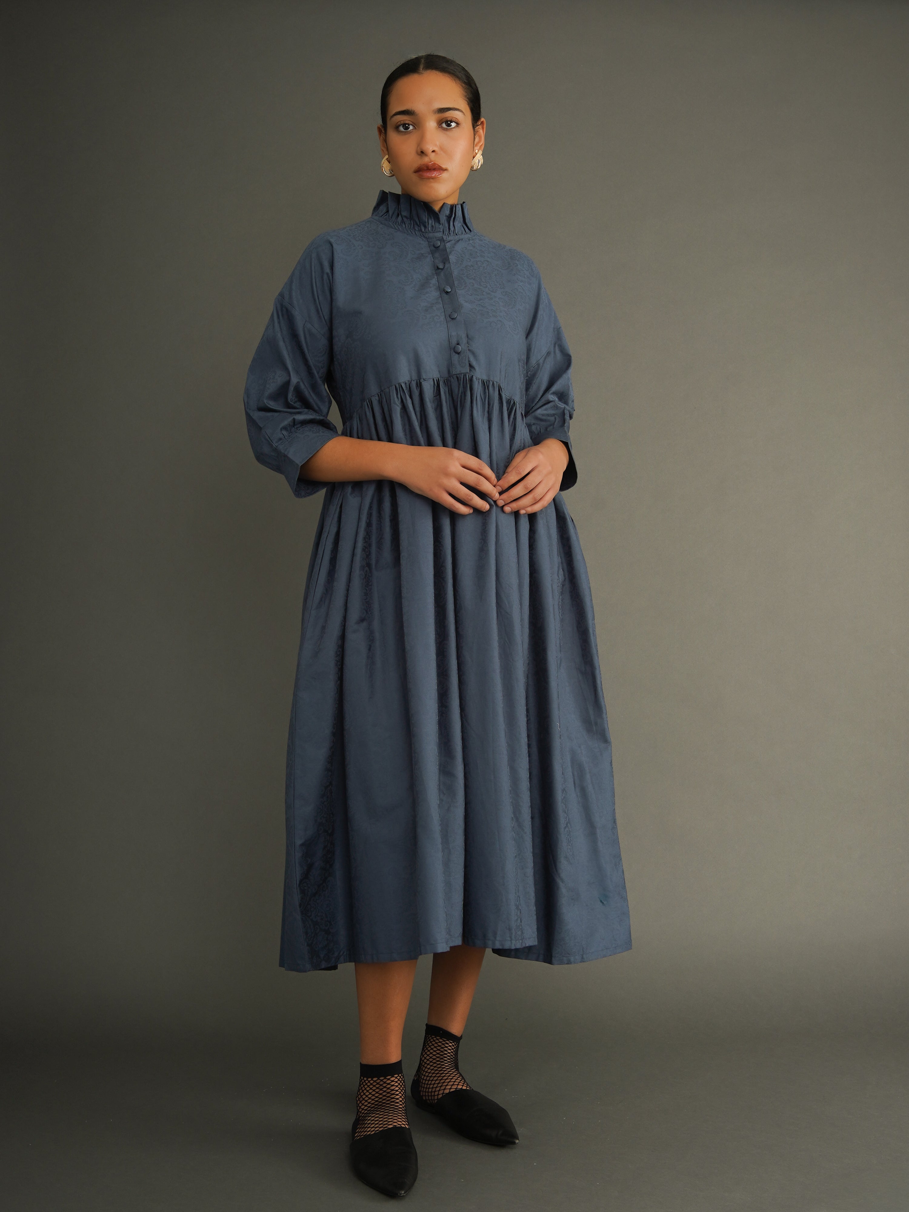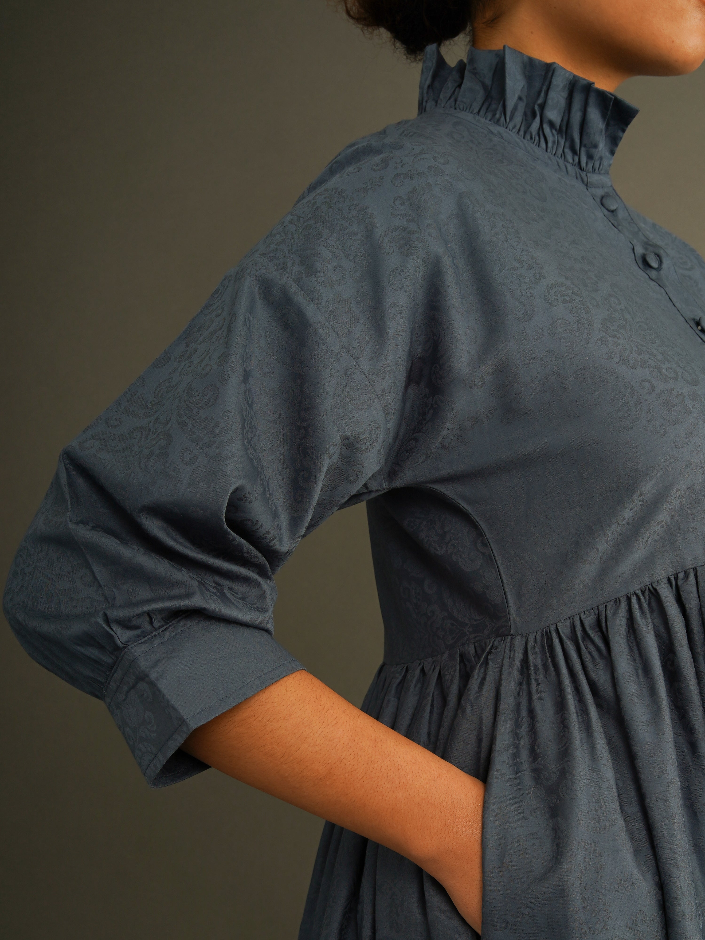 The high ruffle neckline and covered button placket give Doyin its sculptural, refined finish, while the gently gathered waist allows for movement and ease without overpowering your shape. Finished with three-quarter sleeves, side pockets, and a flowing midi length, it’s a piece you’ll return to season after season.