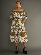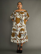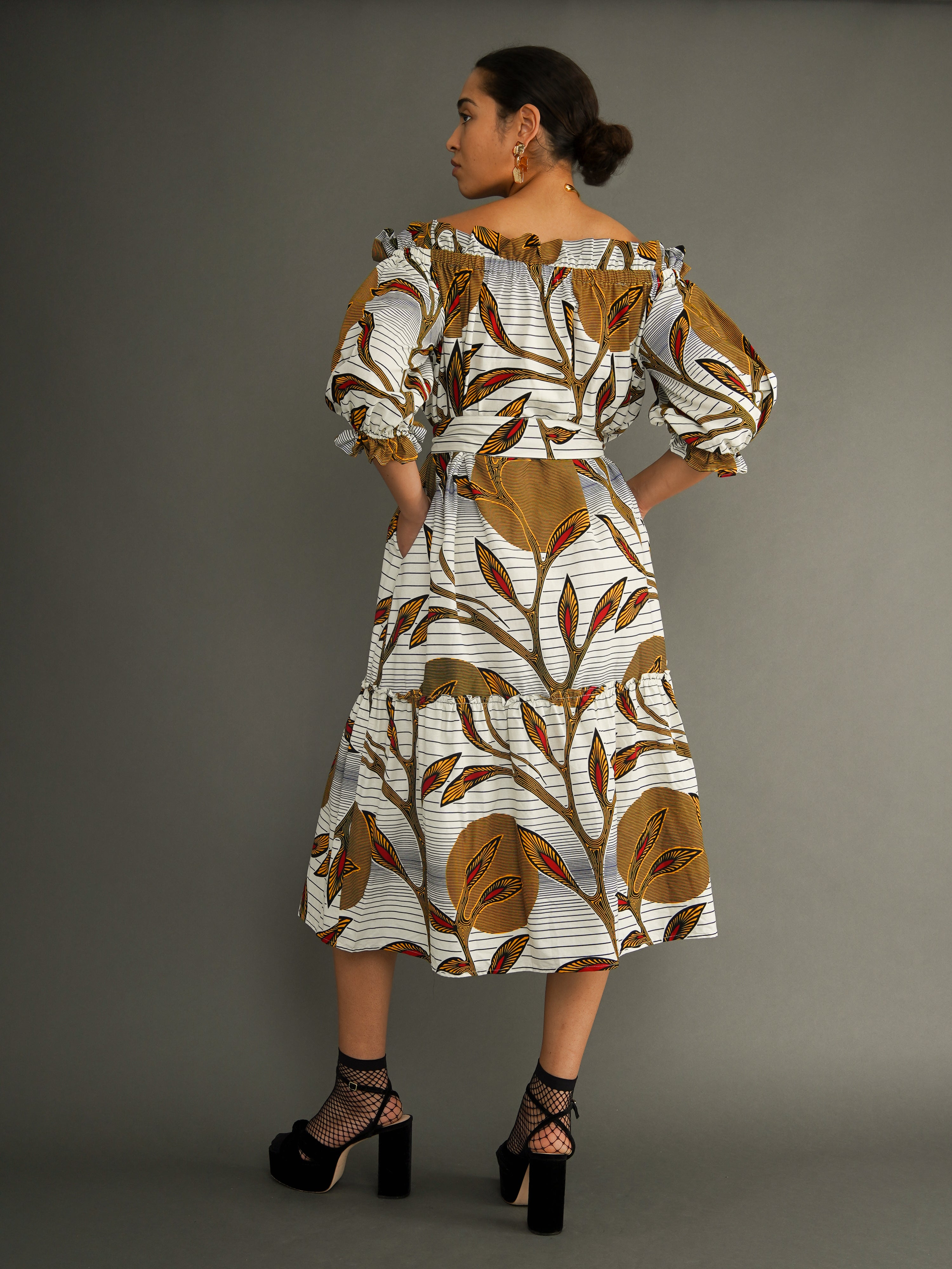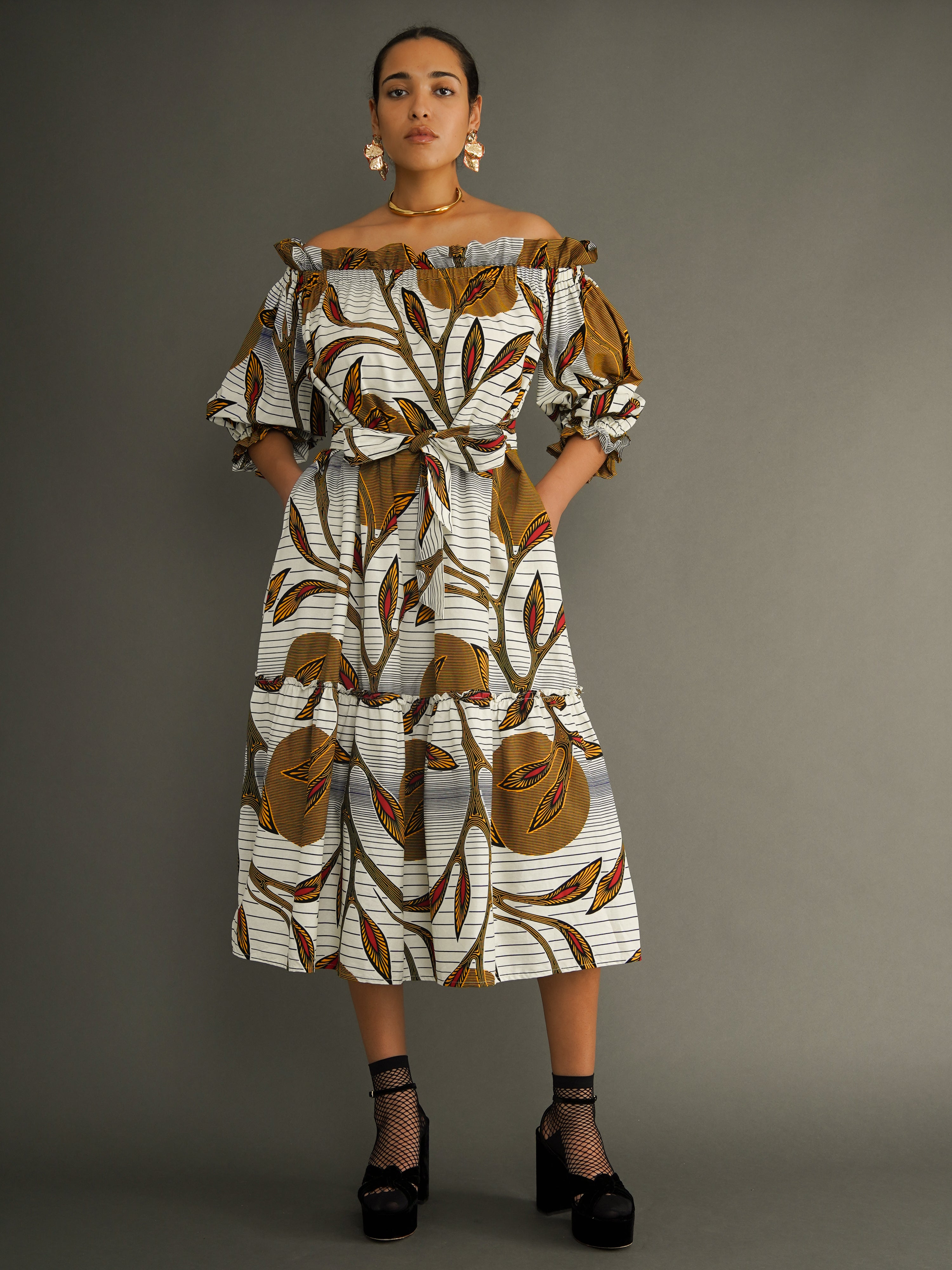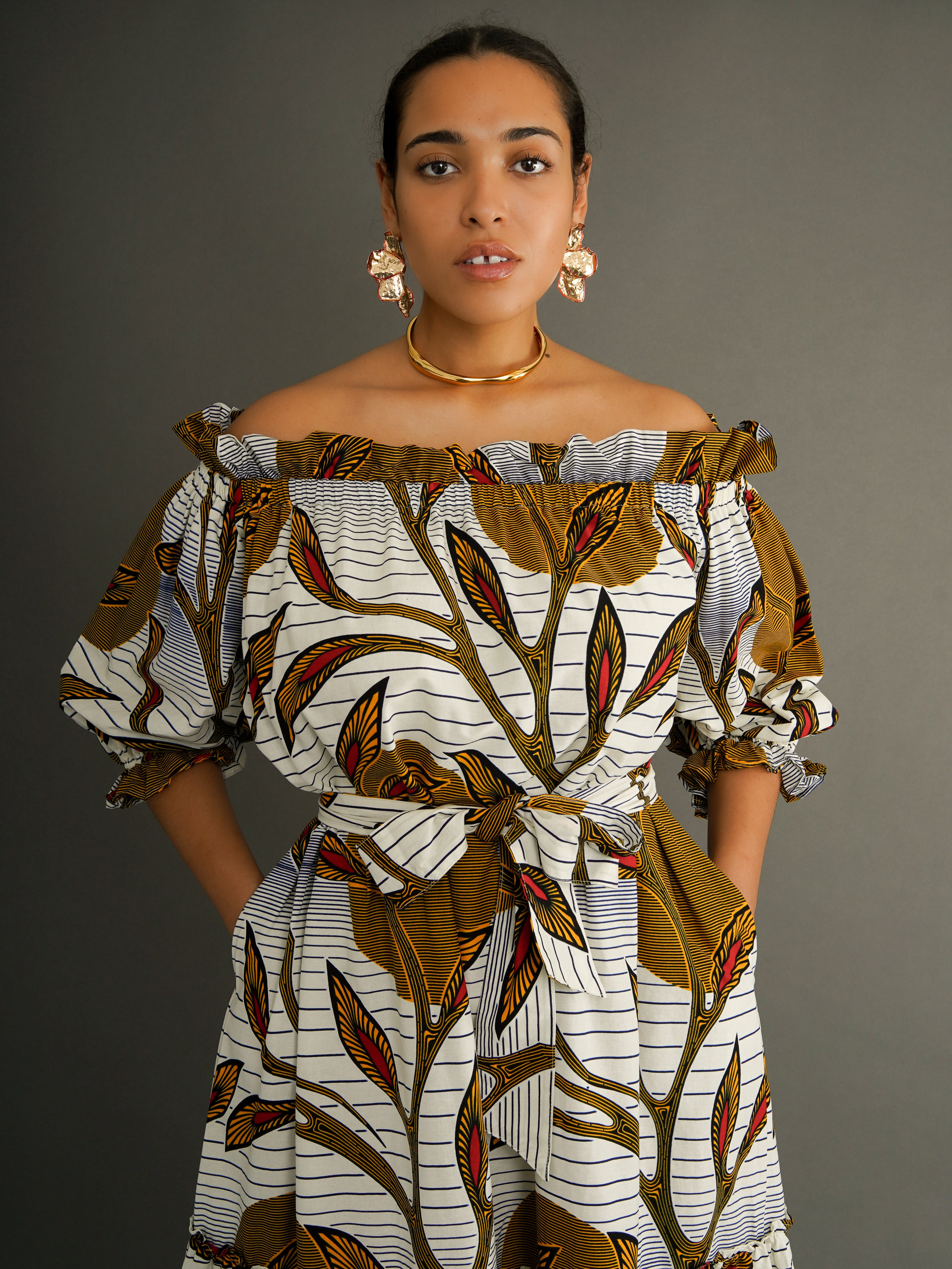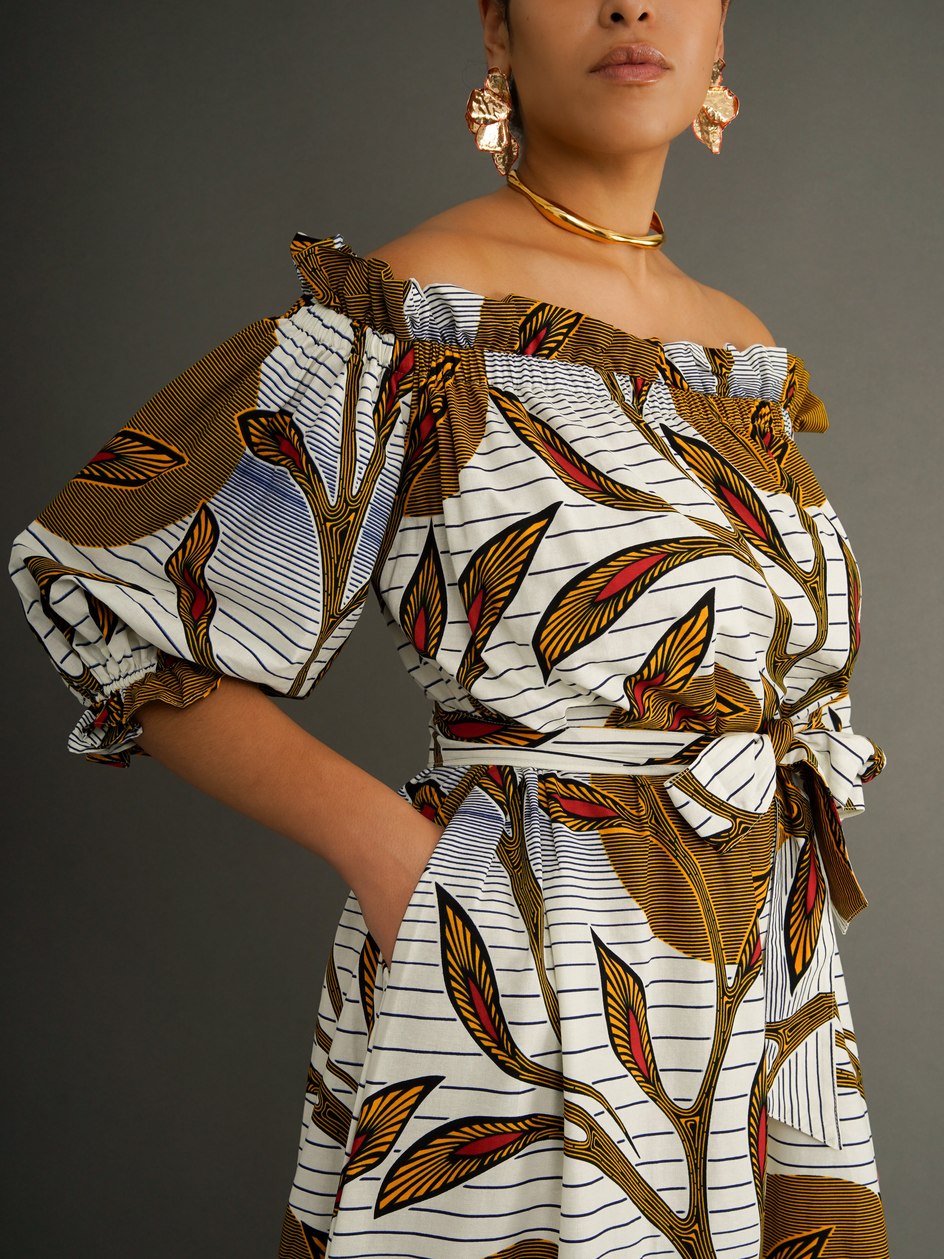 A tiered dress crafted from midweight Dutch wax cotton in a bold botanical print that turns heads before you say a word. Designed to be worn off the shoulder, this piece features a wide, elasticated neckline that sits comfortably and flatters with ease.