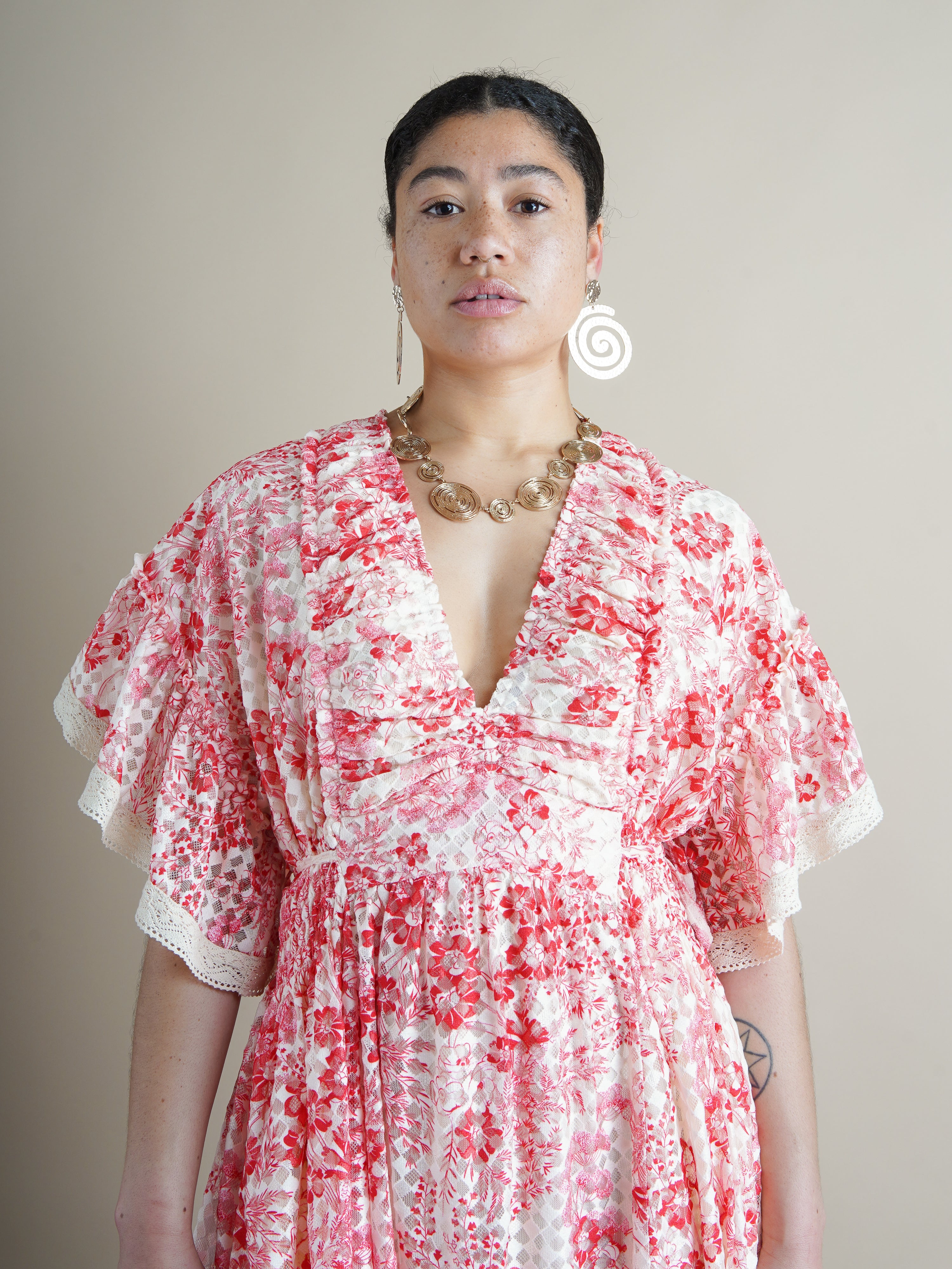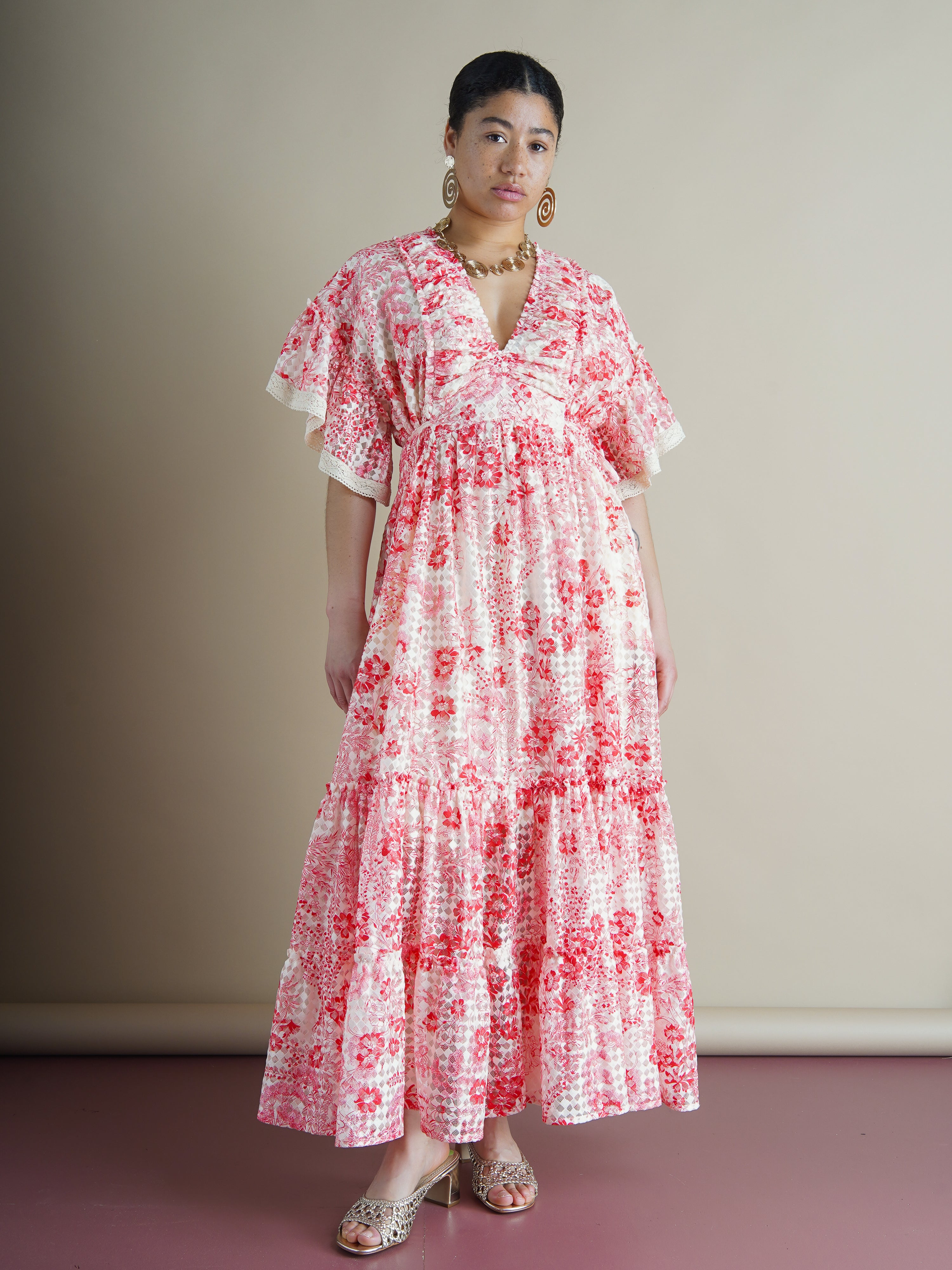 A full-length embroidered lace dress in soft floral shades of red, coral, and ivory. Made from lightweight fabric with a subtle check pattern and fully lined in breathable cotton.