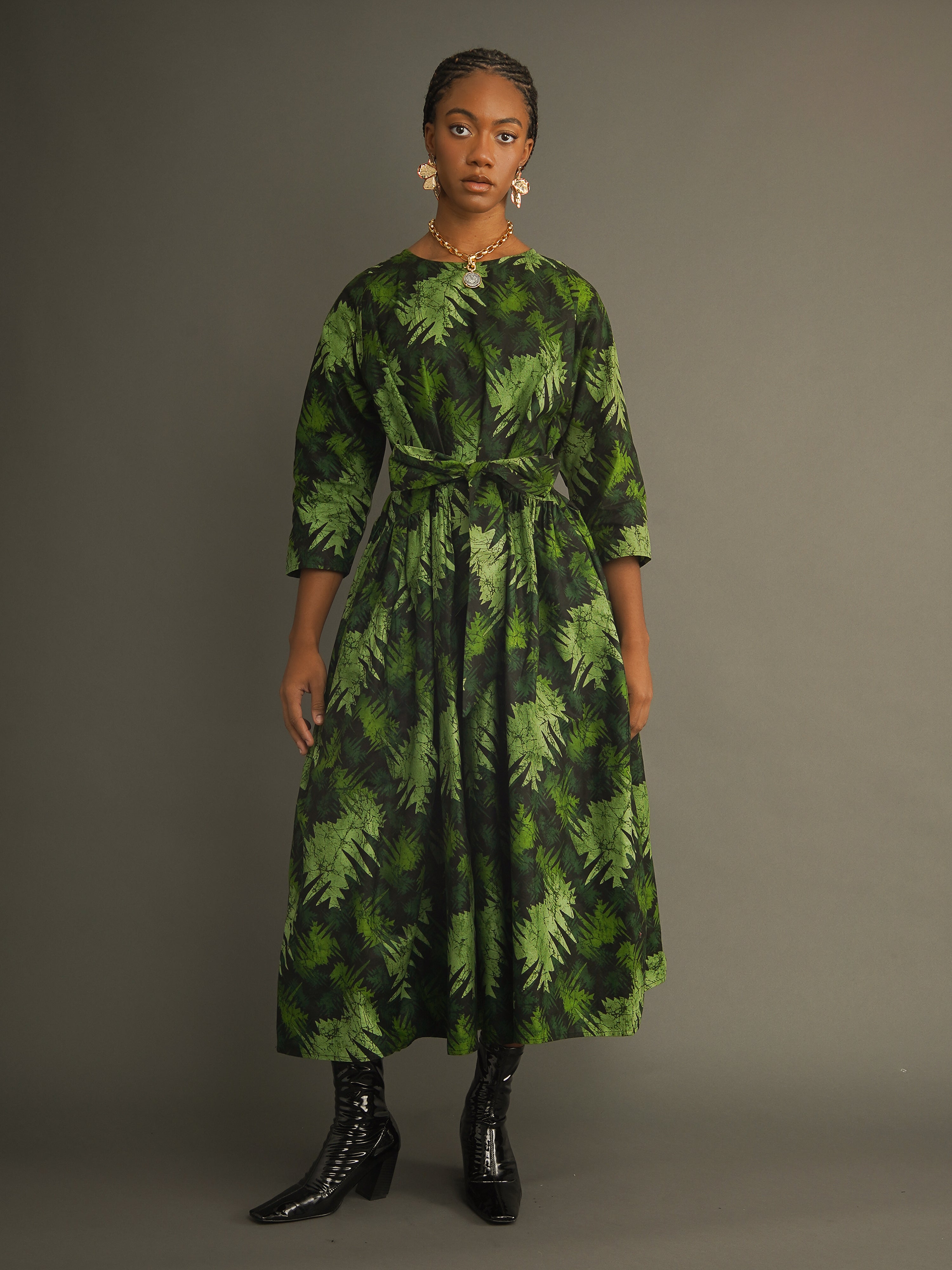 Cut from structured Dutch wax cotton, this statement dress balances bold shape with everyday ease. The relaxed silhouette can be left loose or cinched at the waist with the detachable belt.