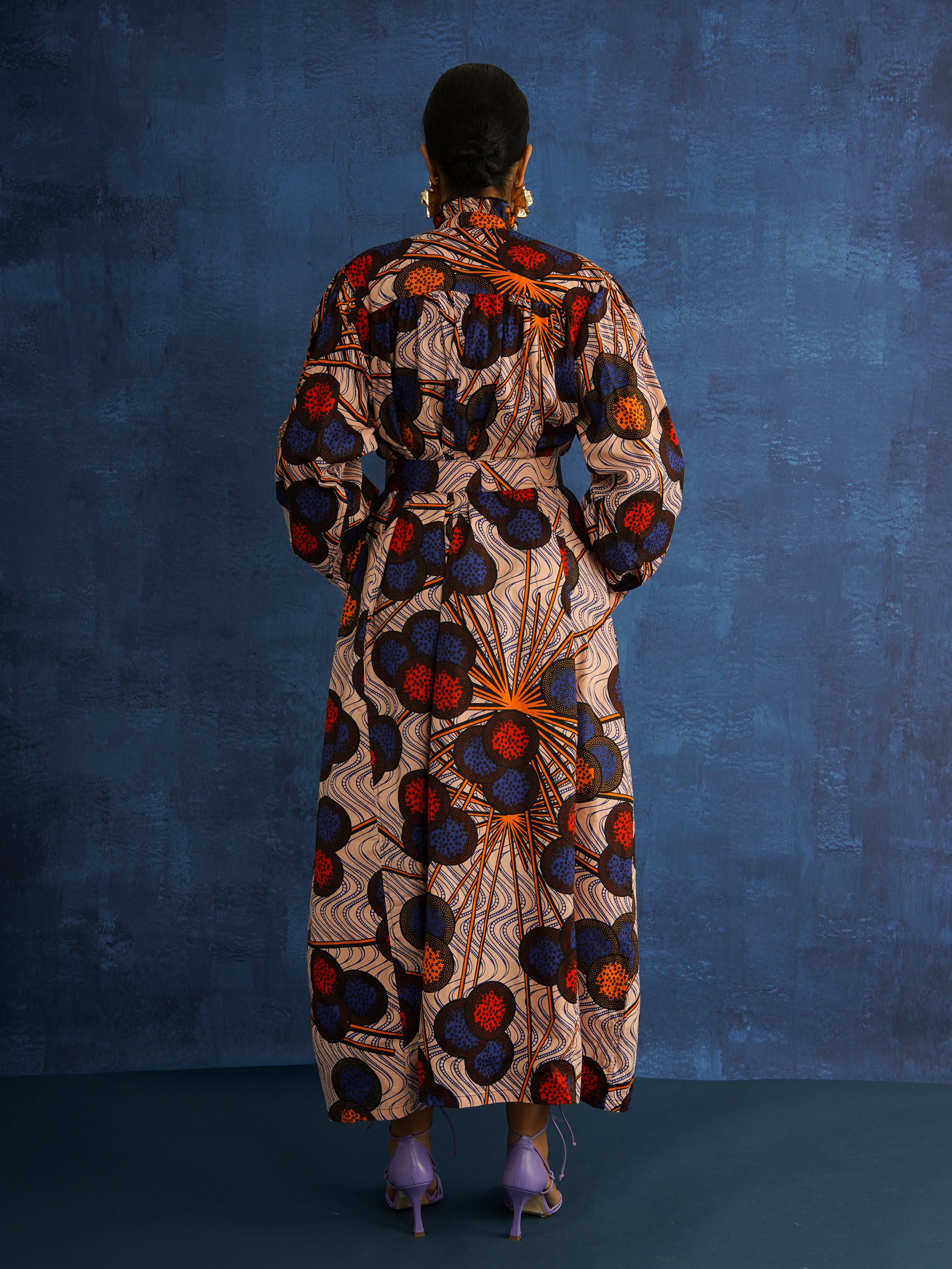 Crafted from 100% mid-weight Dutch wax cotton, this one-of-a-kind piece blends sculptural shape with everyday ease. The vibrant cloth gives a beautiful structure, allowing the voluminous silhouette to hold its form while still moving with you.