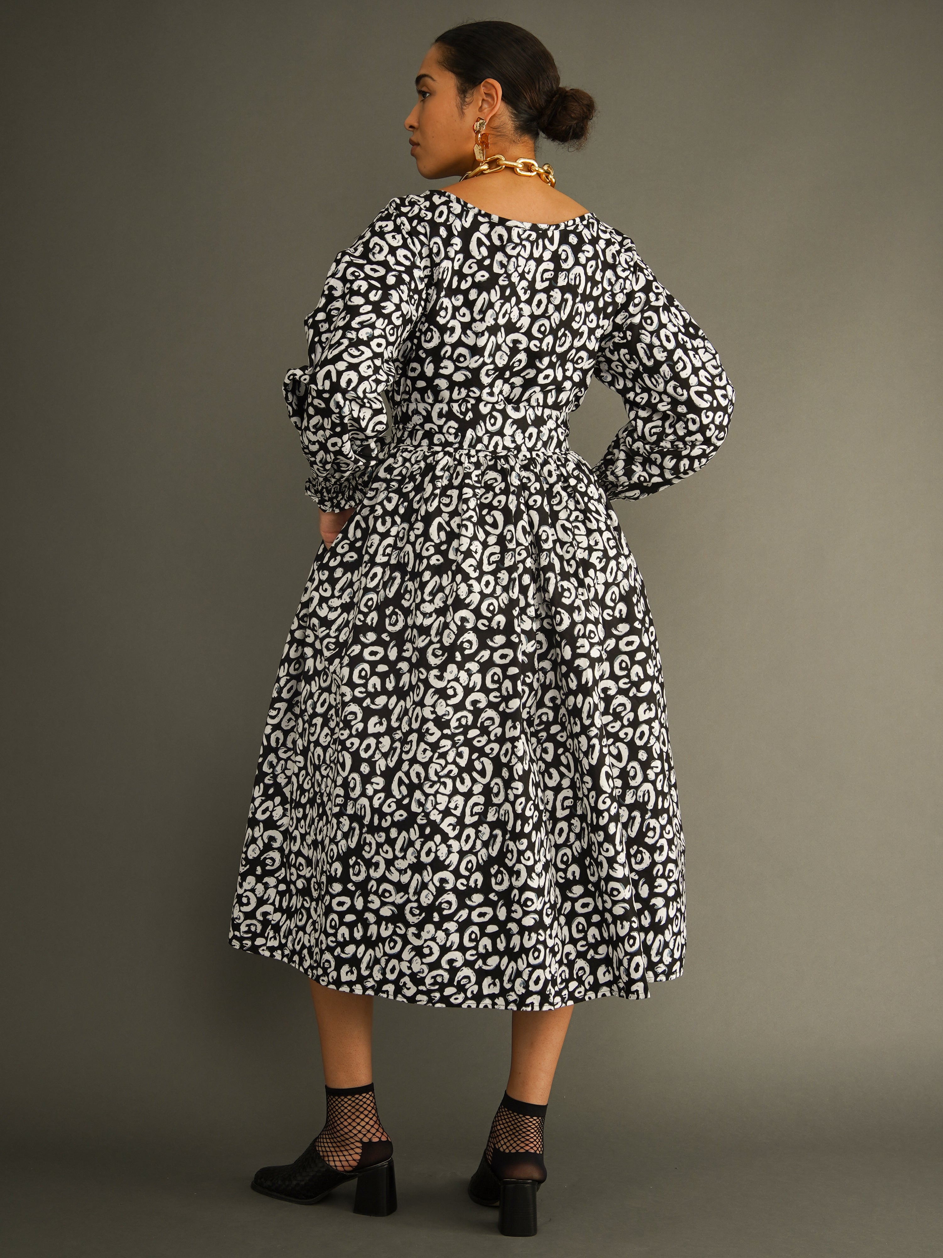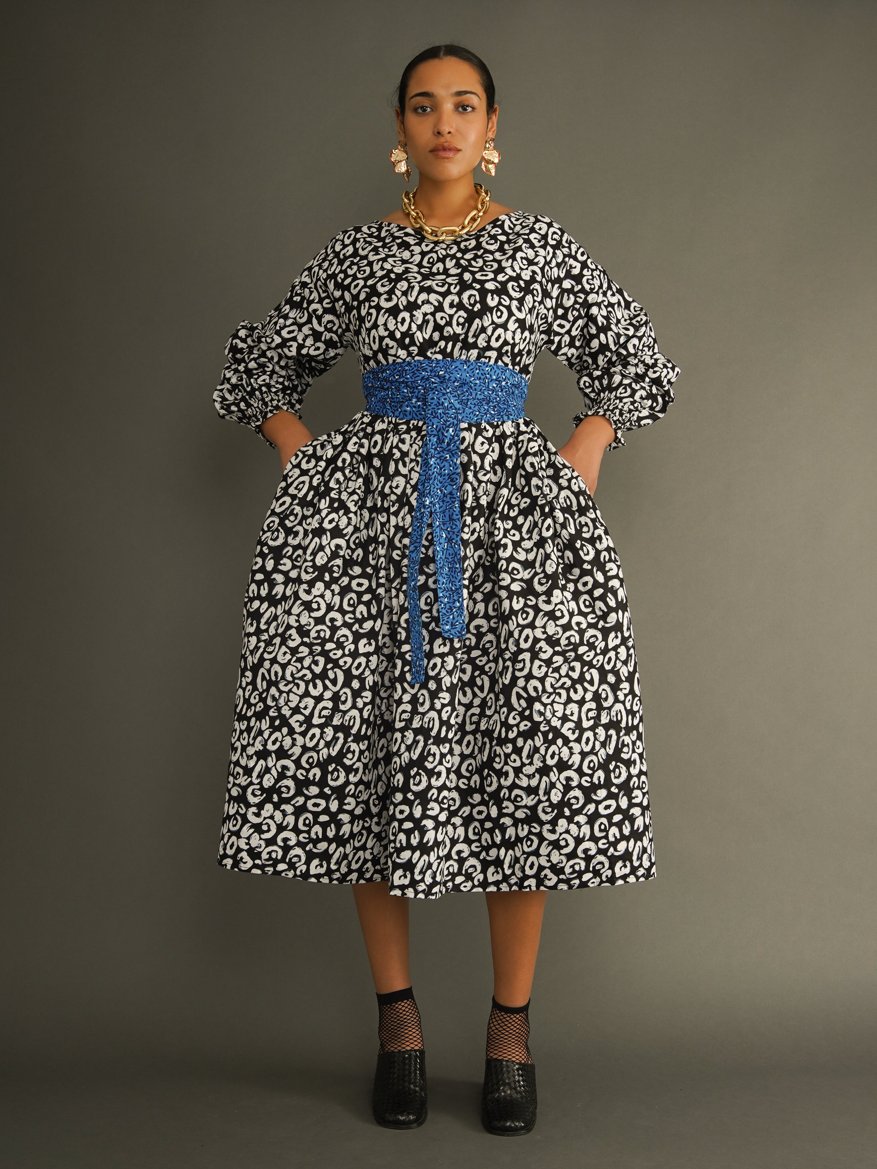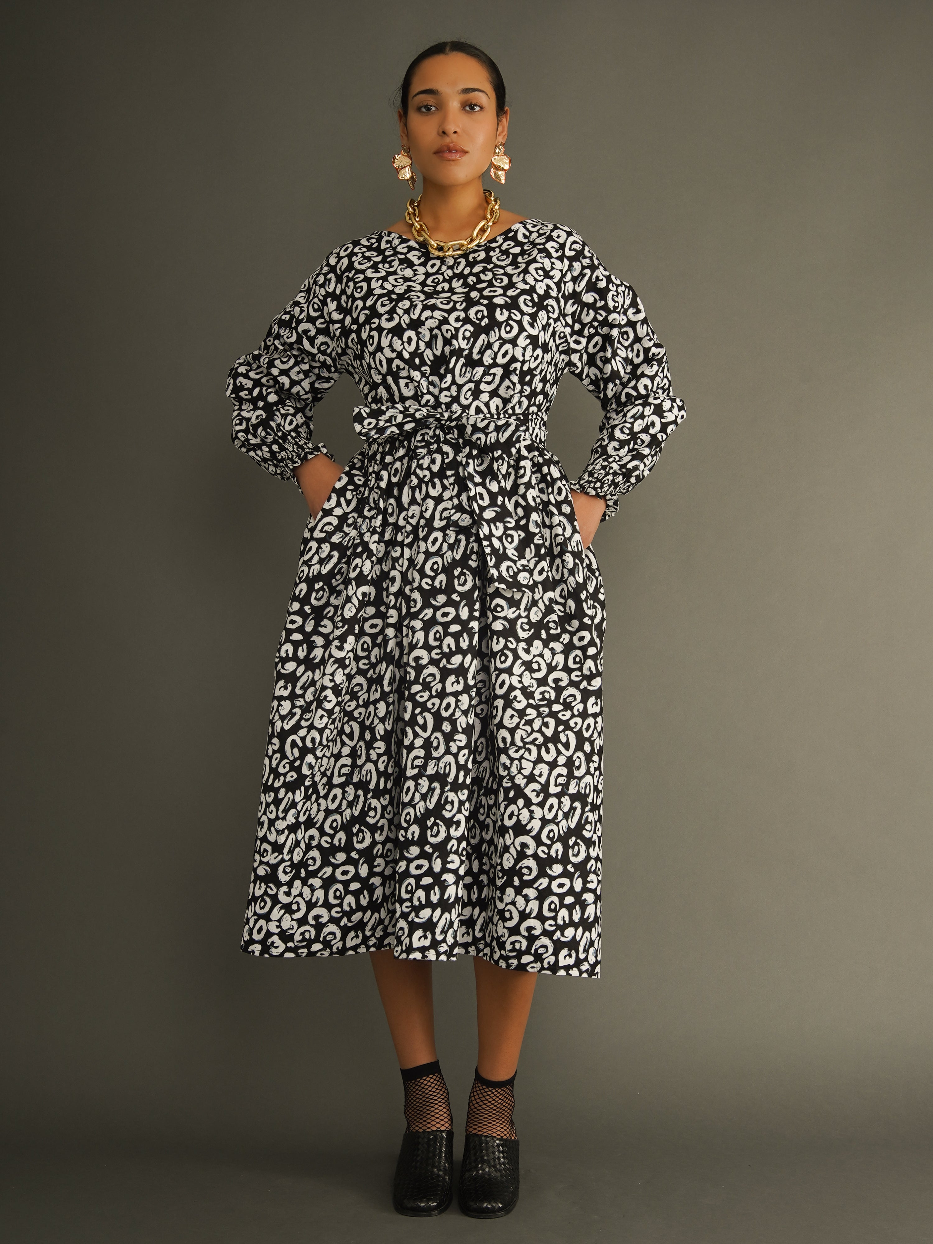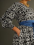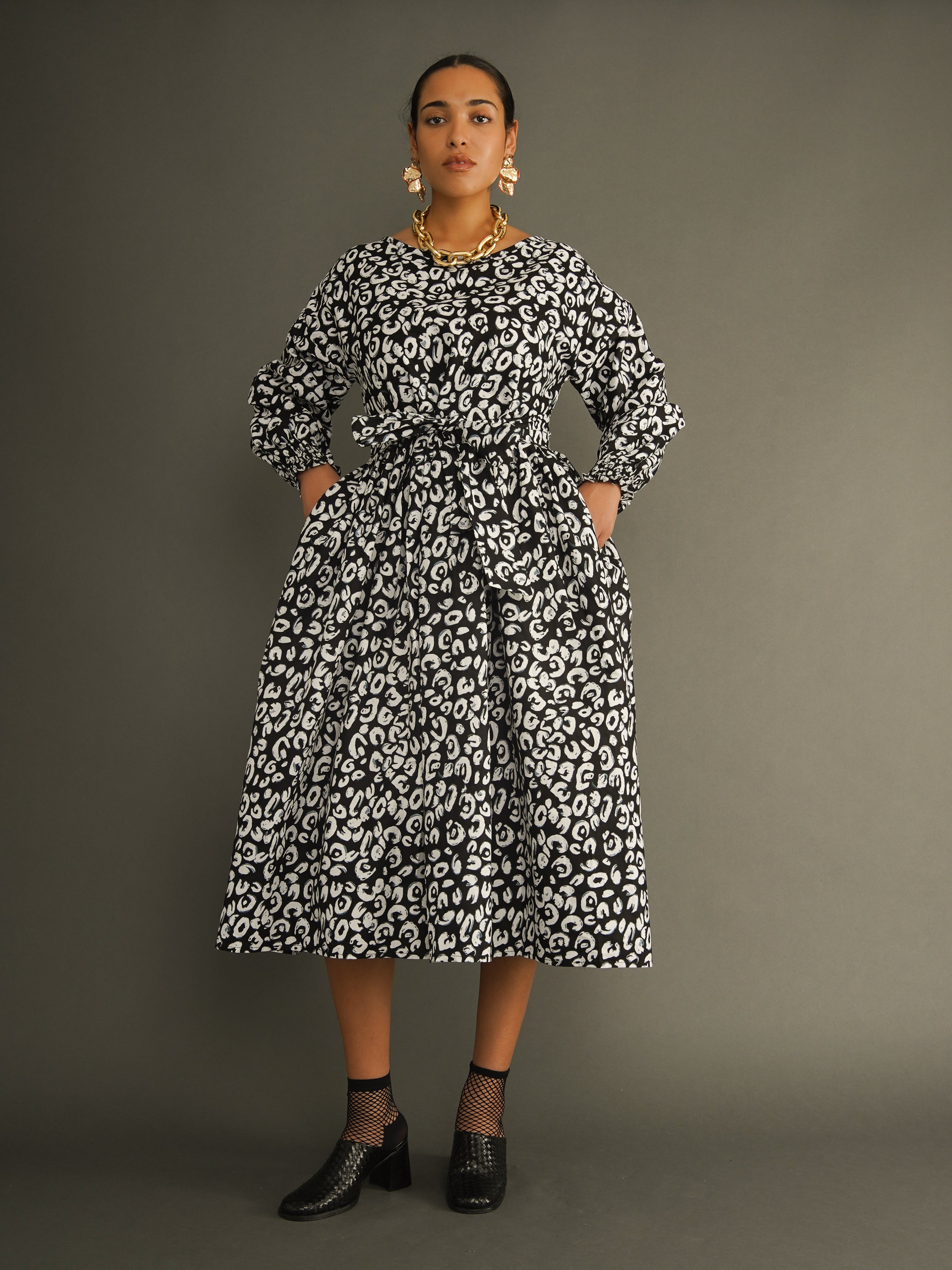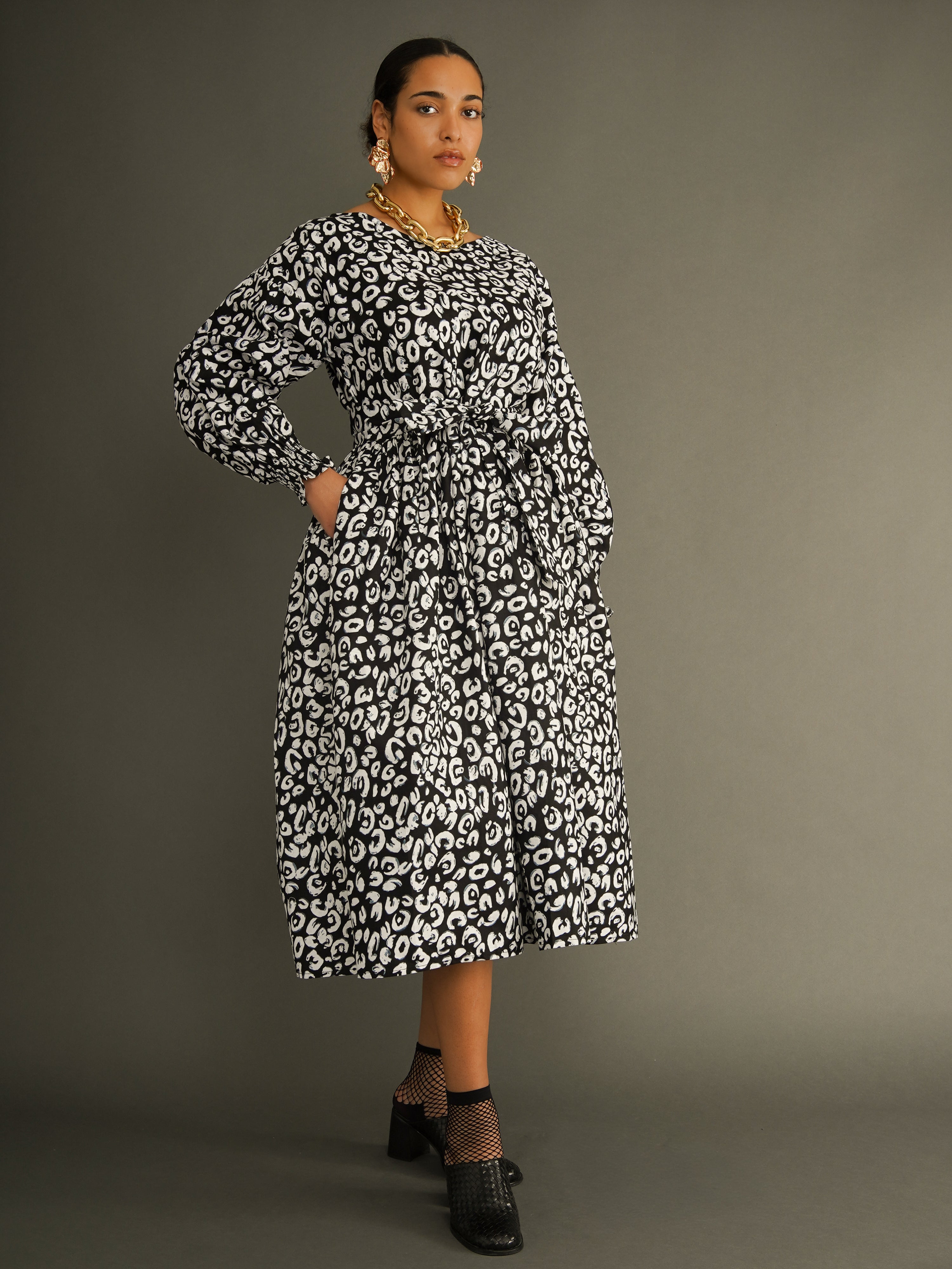 Cut in a generous, one-size silhouette, the dress features voluminous sleeves, a full midi skirt, and a wide detachable belt that allows you to cinch the waist to suit your shape. The striking black and white leopard print adds impact, making this an effortless statement dress you can wear day or night.