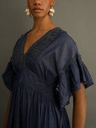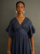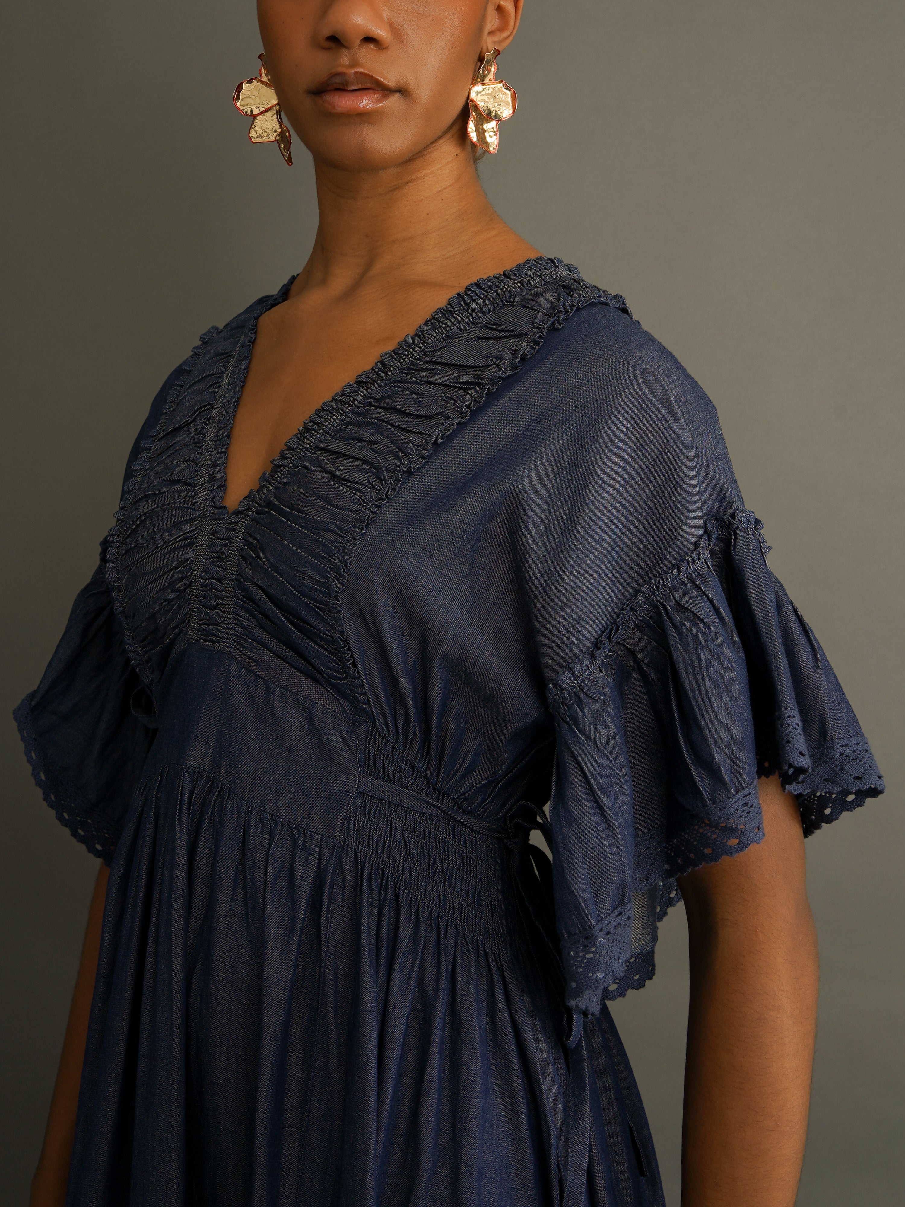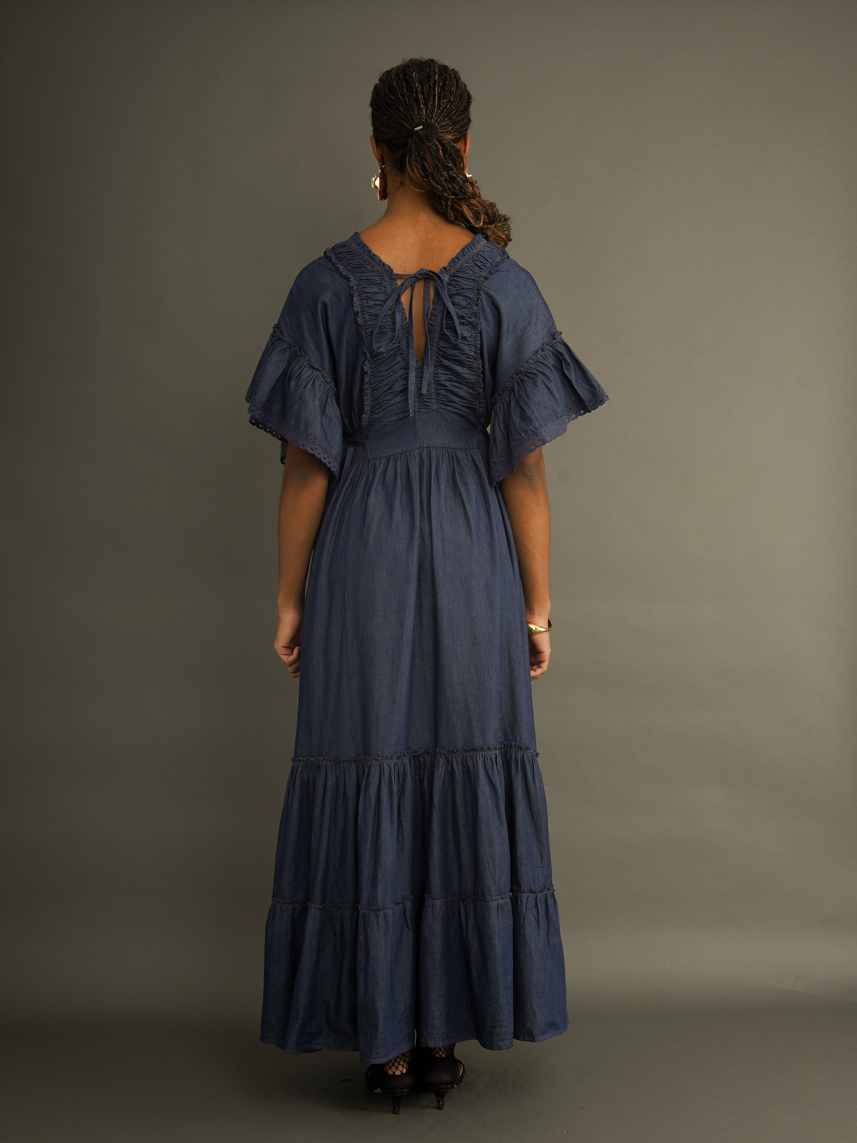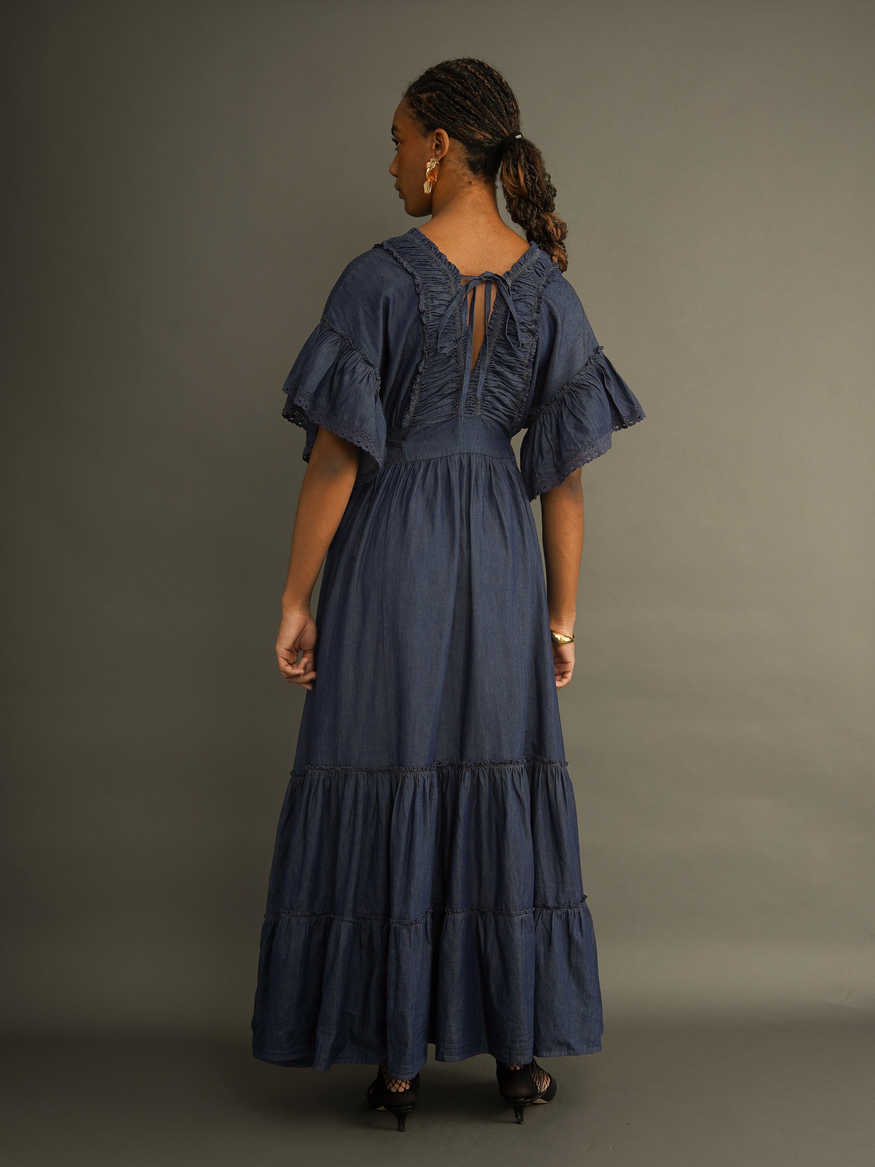 Relaxed yet refined take on denim dressing, this 100% cotton maxi dress is designed for movement and ease. Crafted in blue wash denim, it features a soft V-neckline, ruffle detailing, and voluminous tiered sleeves with lace trim. Adjustable ties at the waist and back neck create a custom fit, while the flowing tiered skirt adds effortless elegance.