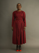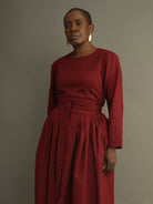 Cut from heavy dobby cotton and fully lined for structure and comfort, this version of the Amina brings quiet confidence to cooler days. The fabric has a weighty drape that flatters without clinging, while the long sleeves and softly tailored bodice give just the right amount of polish.