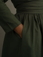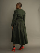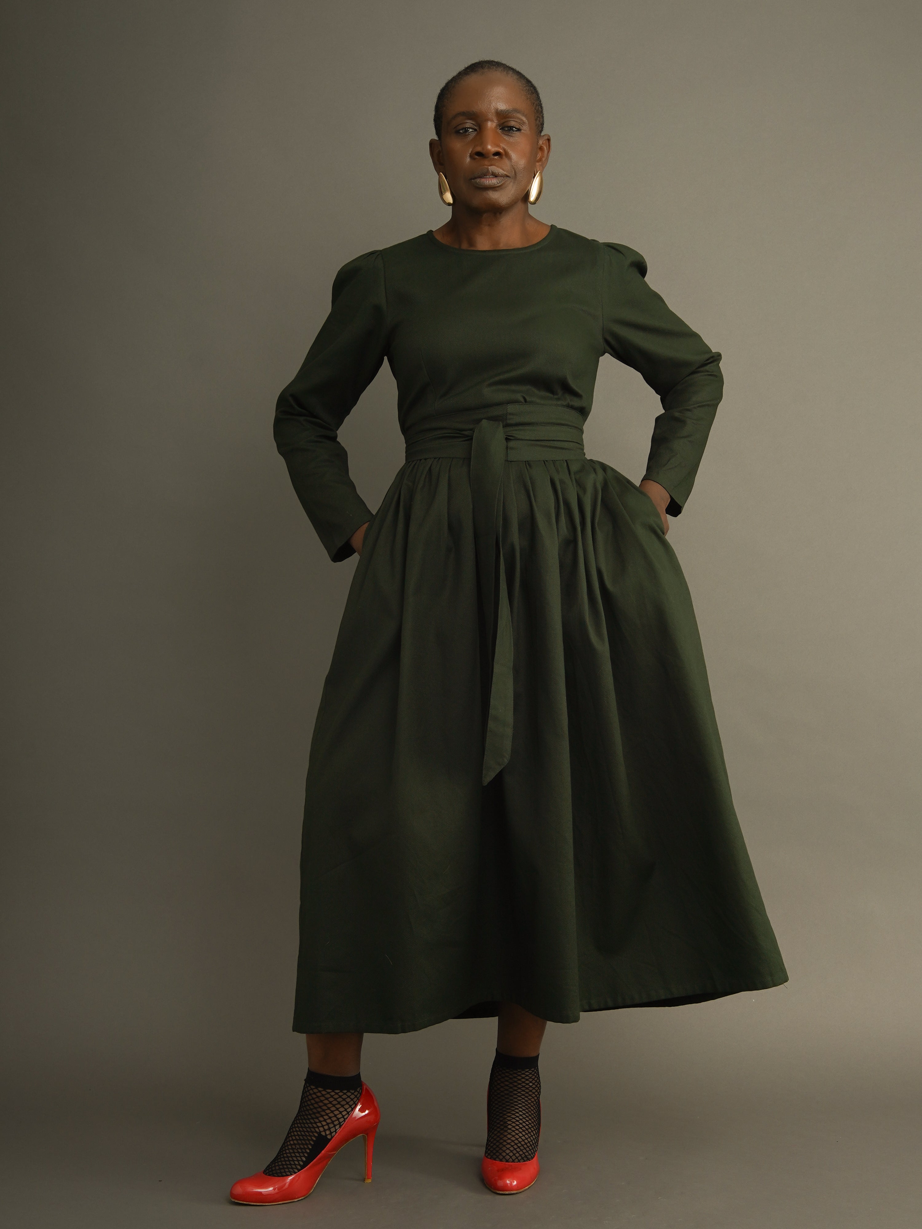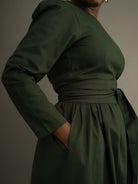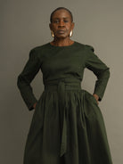 Cut from heavy dobby cotton and fully lined for structure and comfort, this version of the Amina brings quiet confidence to cooler days. The fabric has a weighty drape that flatters without clinging, while the long sleeves and softly tailored bodice give just the right amount of polish.