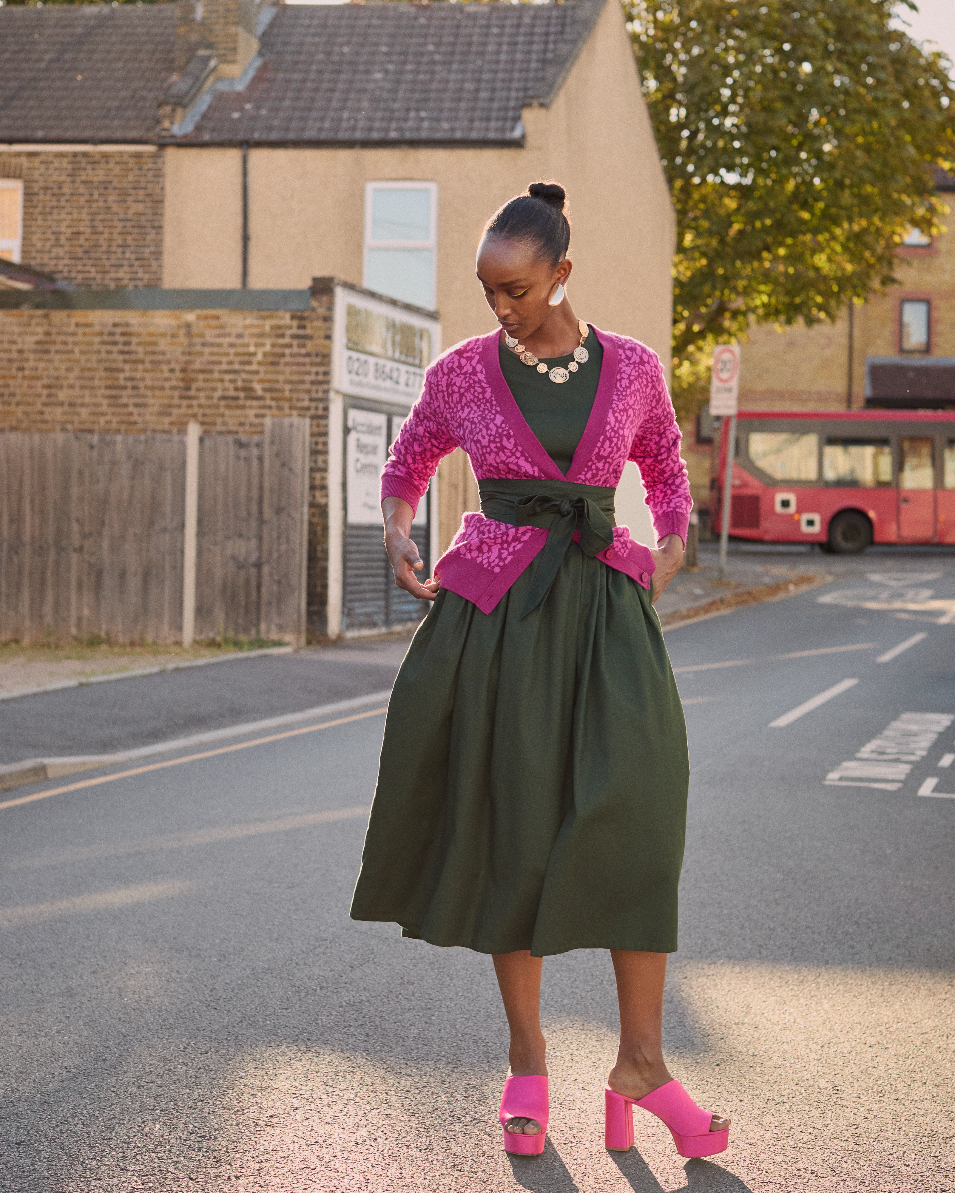 A wide, gathered skirt moves beautifully as you walk, creating that unmistakable Kemi Telford silhouette — bold, feminine, and full of presence.