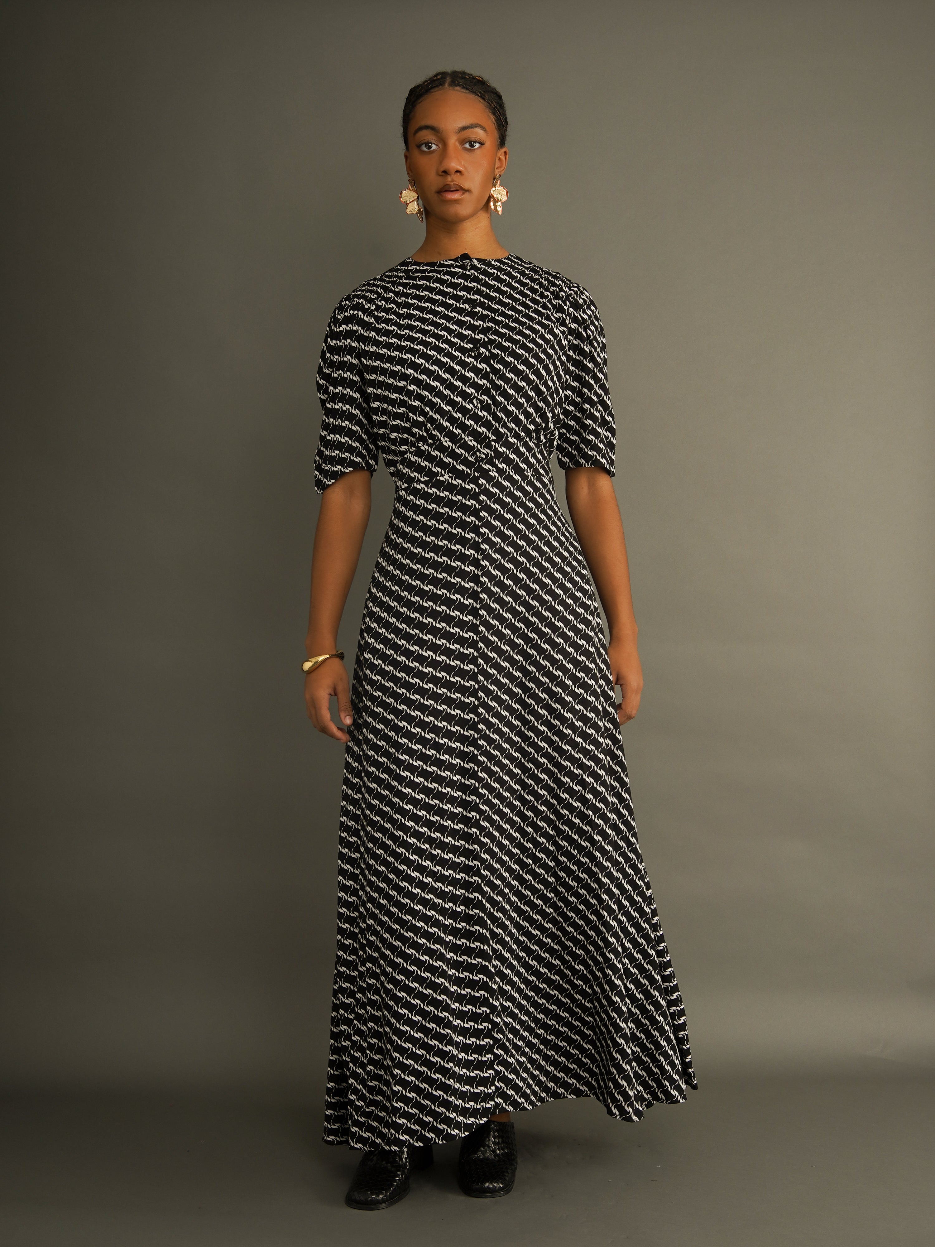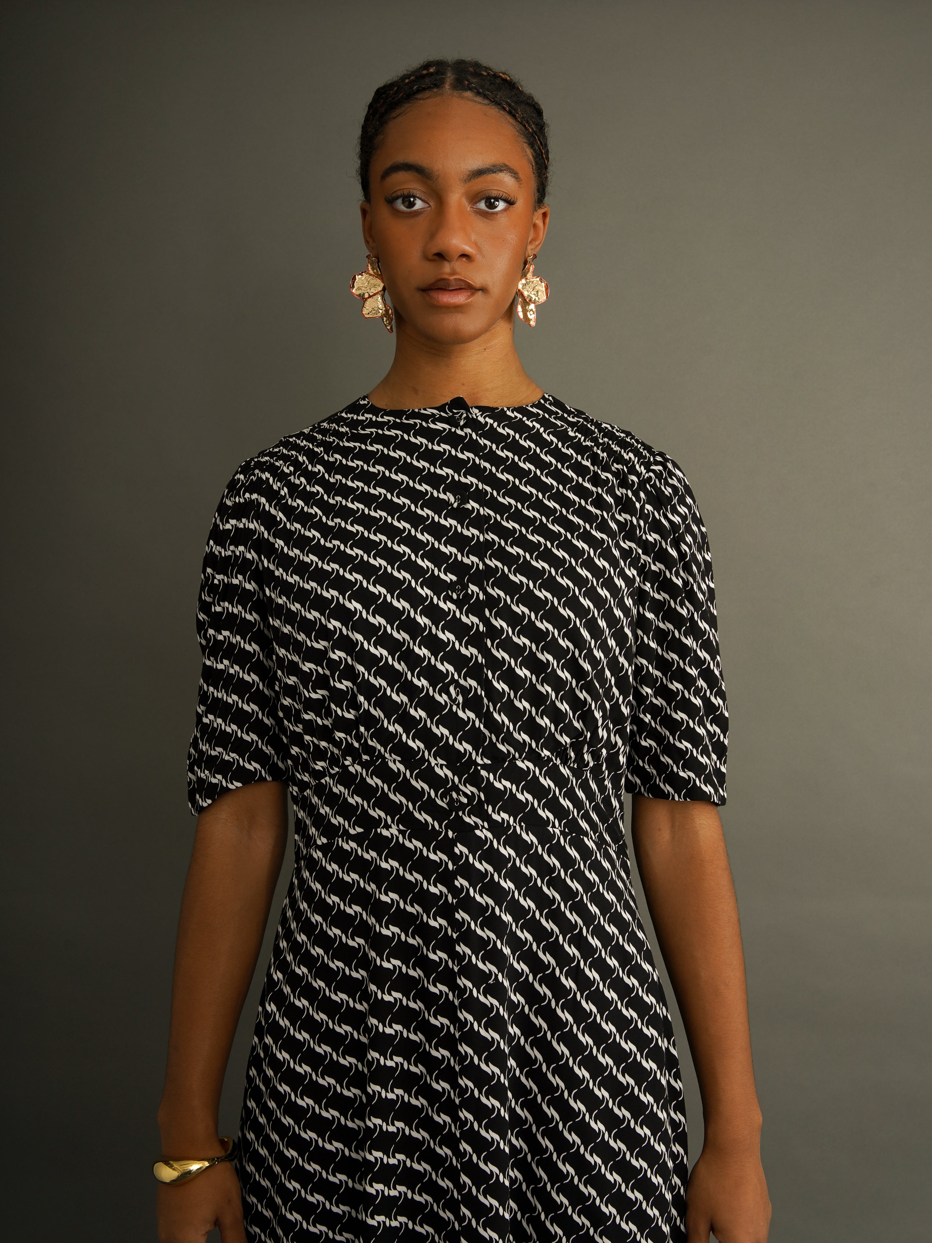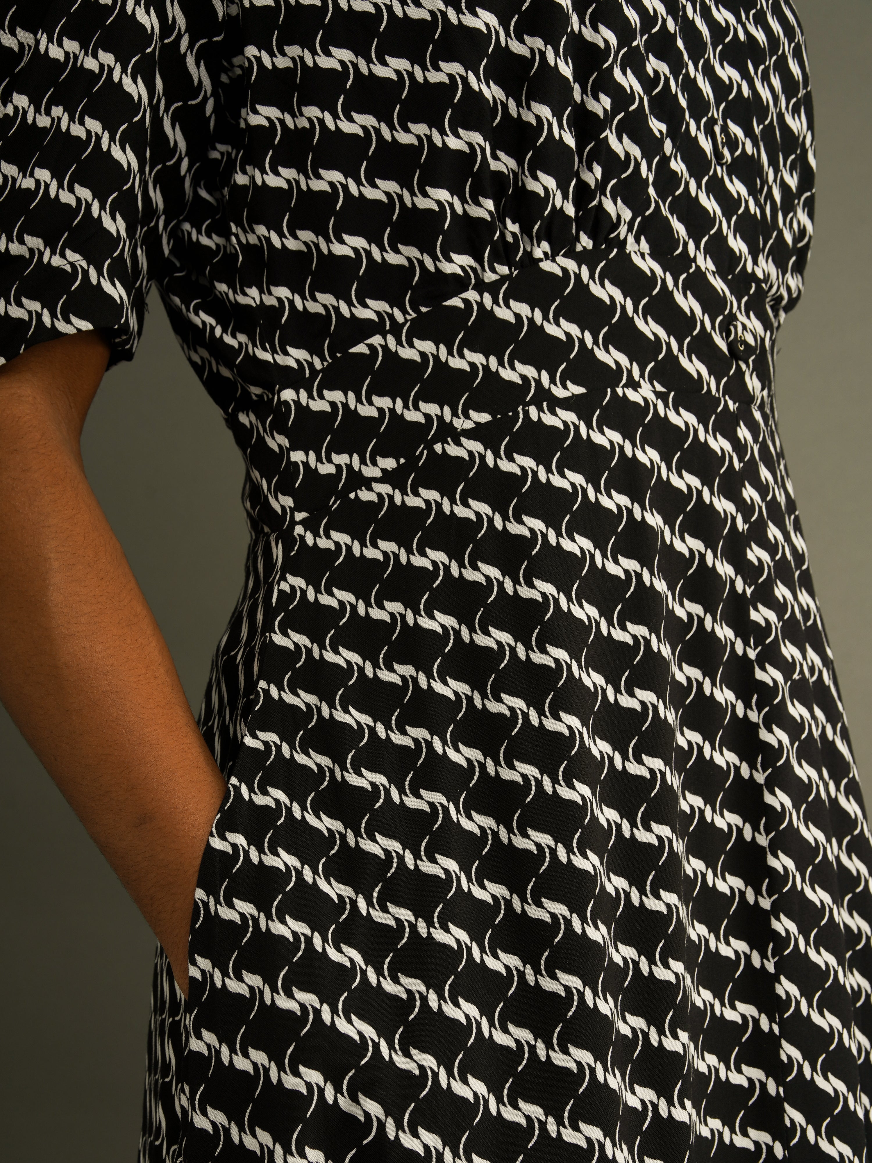 A vintage-inspired midi dress in a black and white abstract print. Crafted from soft, breathable viscose, the Memory Dress features a semi-fitted waist and hips that fall to a gently flared hem. The shape moves beautifully and flatters without clinging. Covered buttons run through the front, and a concealed side zip ensures a smooth fit. Short sleeves and deep side pockets add everyday ease. Fully lined for comfort and structure.