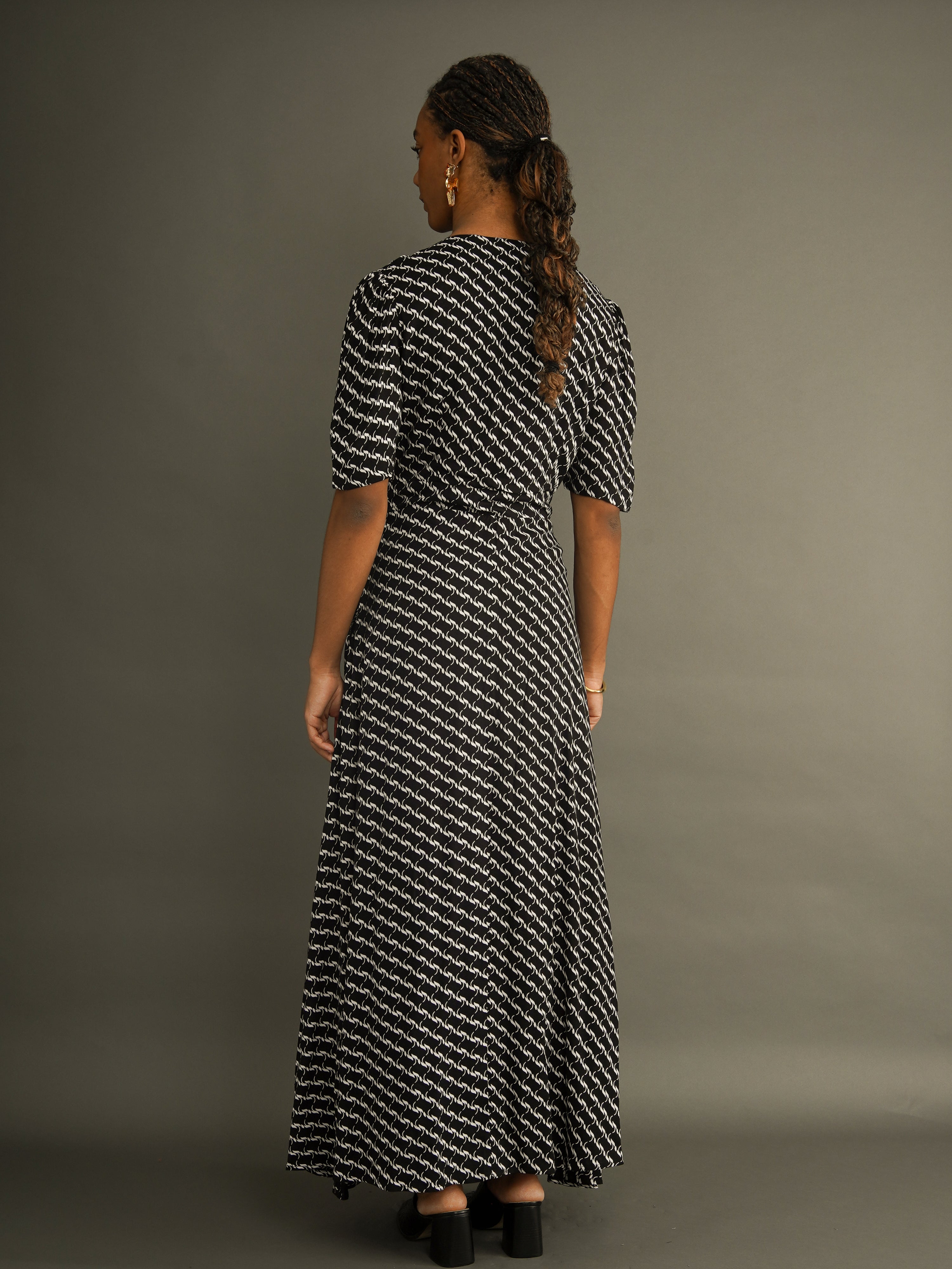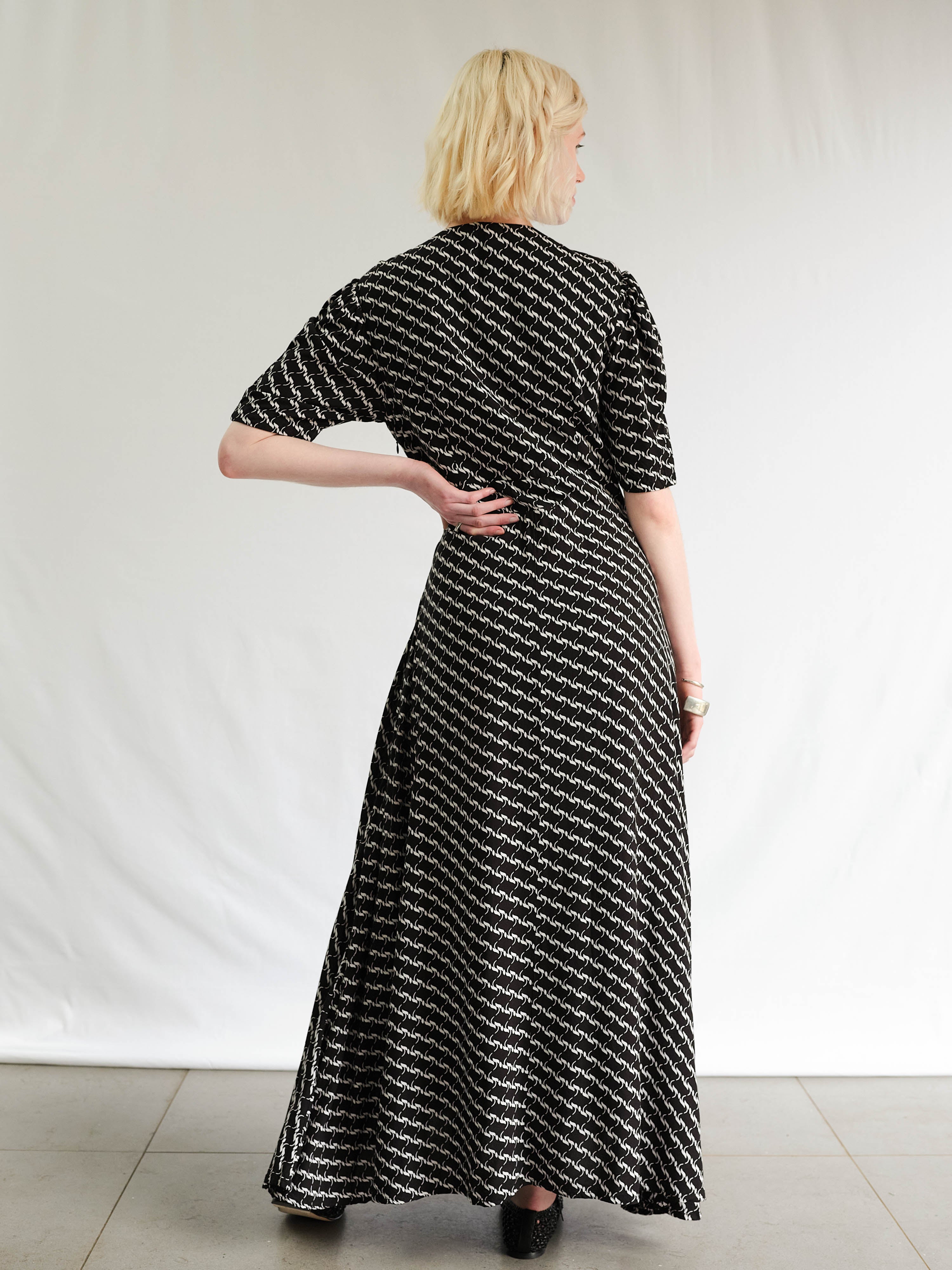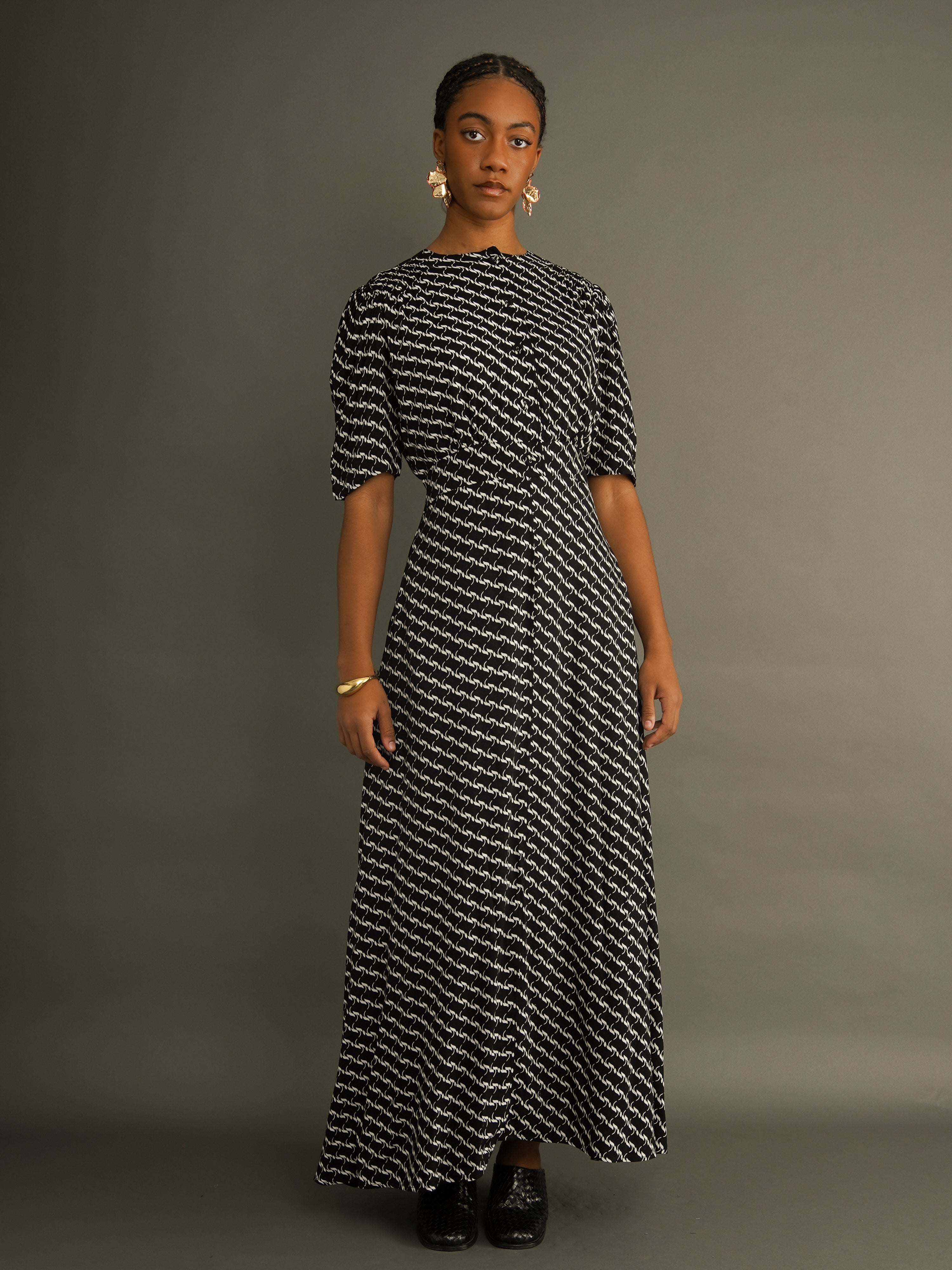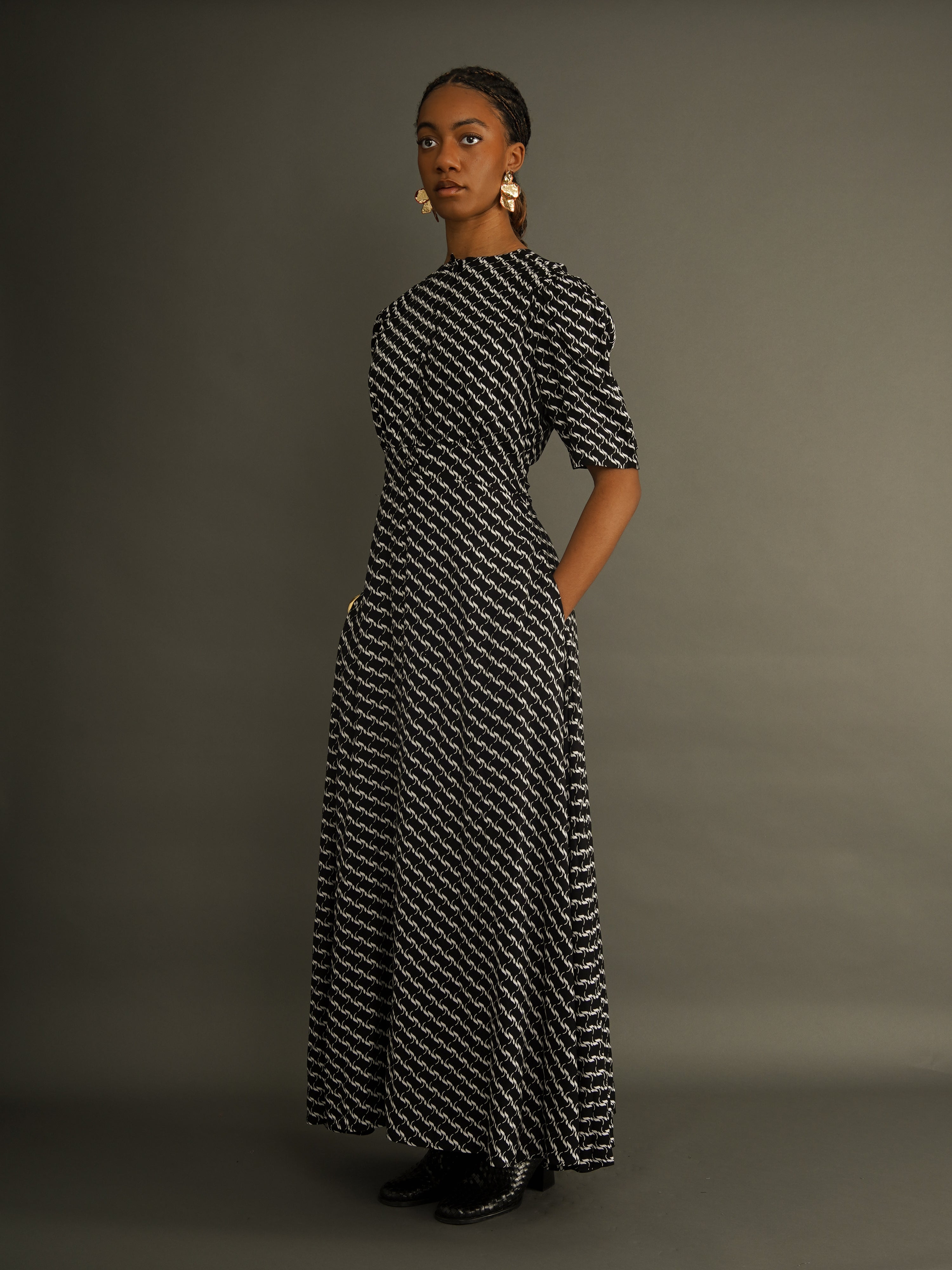 A vintage-inspired midi dress in a black and white abstract print. Crafted from soft, breathable viscose, the Memory Dress features a semi-fitted waist and hips that fall to a gently flared hem. The shape moves beautifully and flatters without clinging. Covered buttons run through the front, and a concealed side zip ensures a smooth fit. Short sleeves and deep side pockets add everyday ease. Fully lined for comfort and structure.