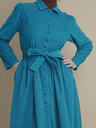 Turquoise Needlecord Shirt Dress is a timeless wardrobe piece crafted from 100% soft fine corduroy. The fabric’s textured surface and delicate cords give it a luxurious yet breathable drape, making it light enough for summer and perfect for layering in winter. Designed with a vintage-inspired silhouette.