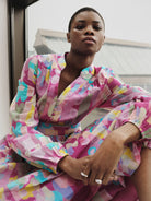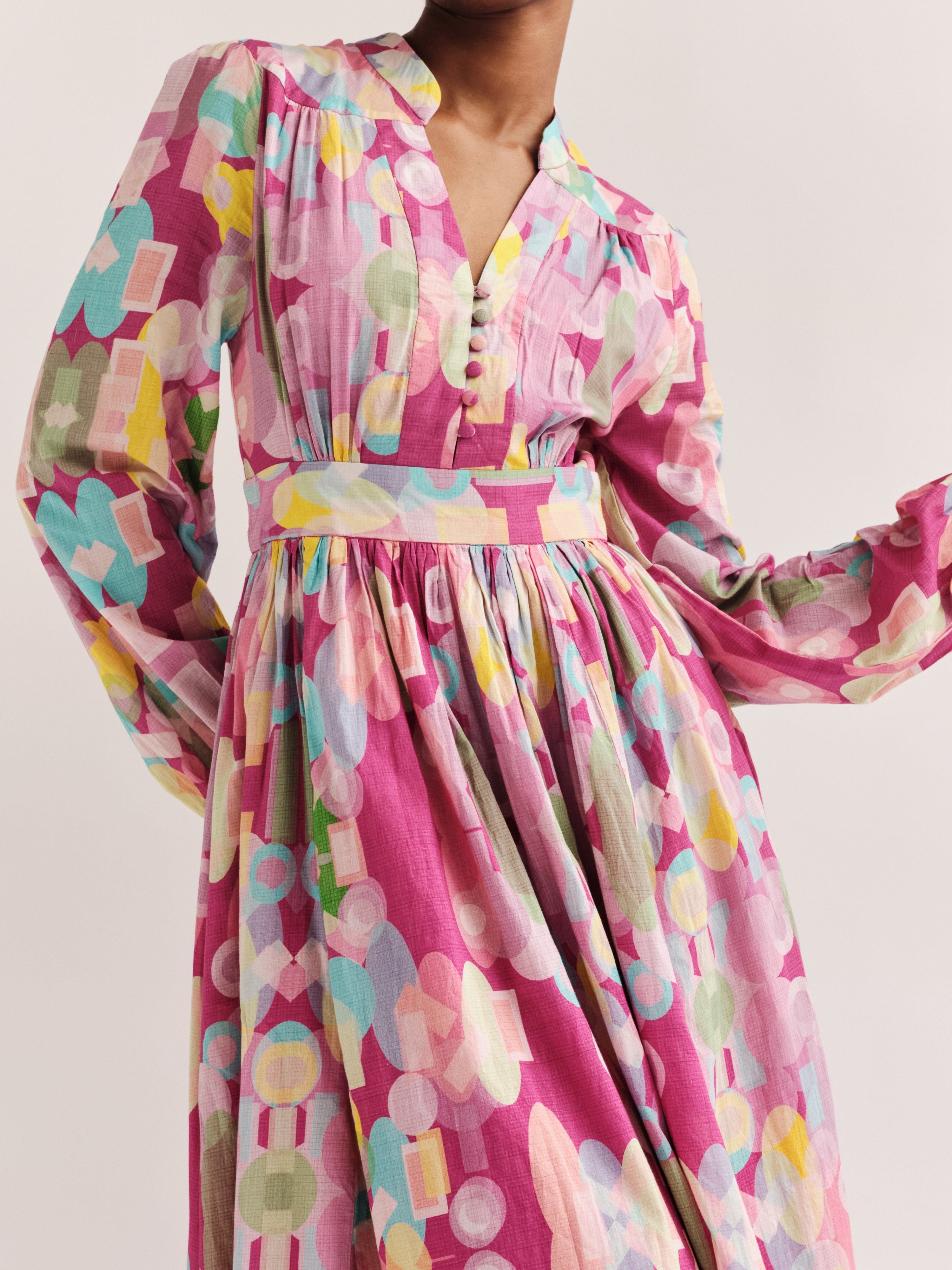 An abstract vibrant pattern adorns our Yetunde fully lined maxi cotton dress, inspired by Cubism & Abstract Art. Featuring flowy long sleeves, a cinched waist, flowy gathered skirt and an enclosed zip at the back.