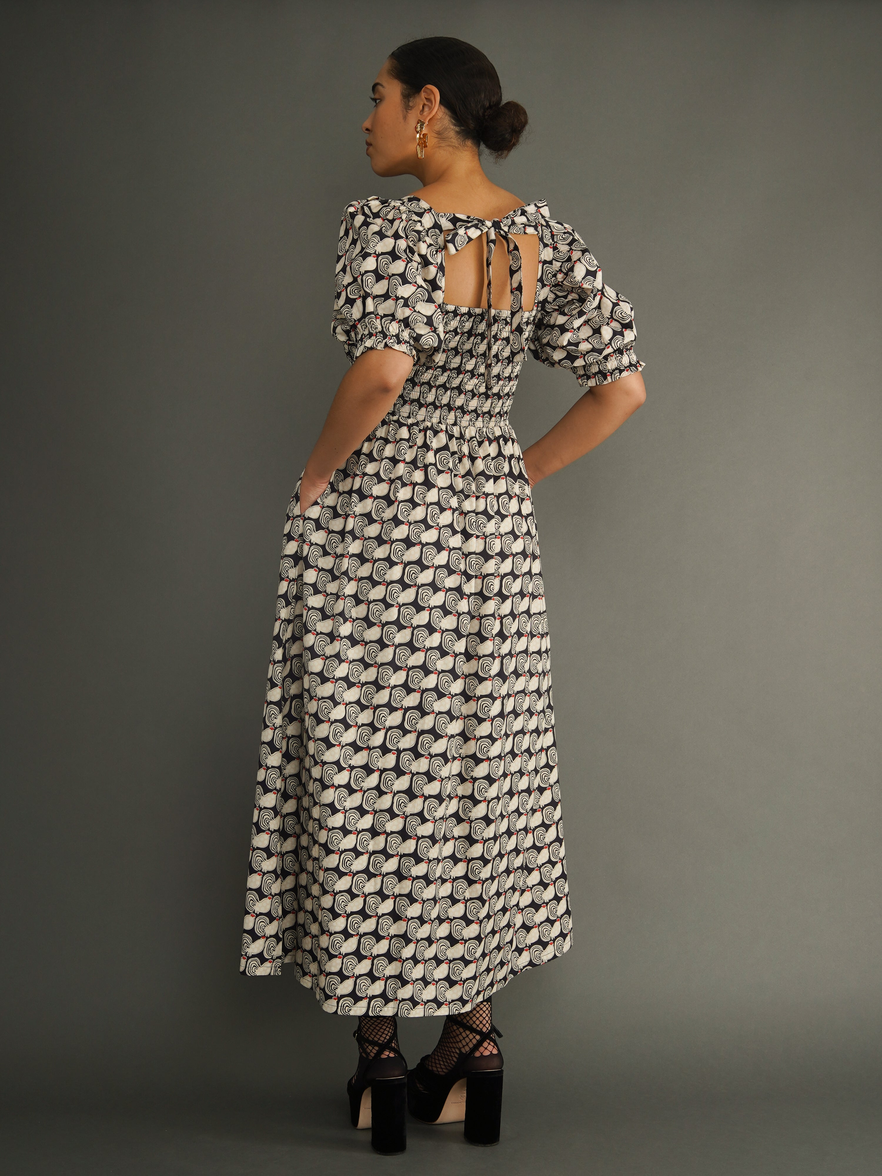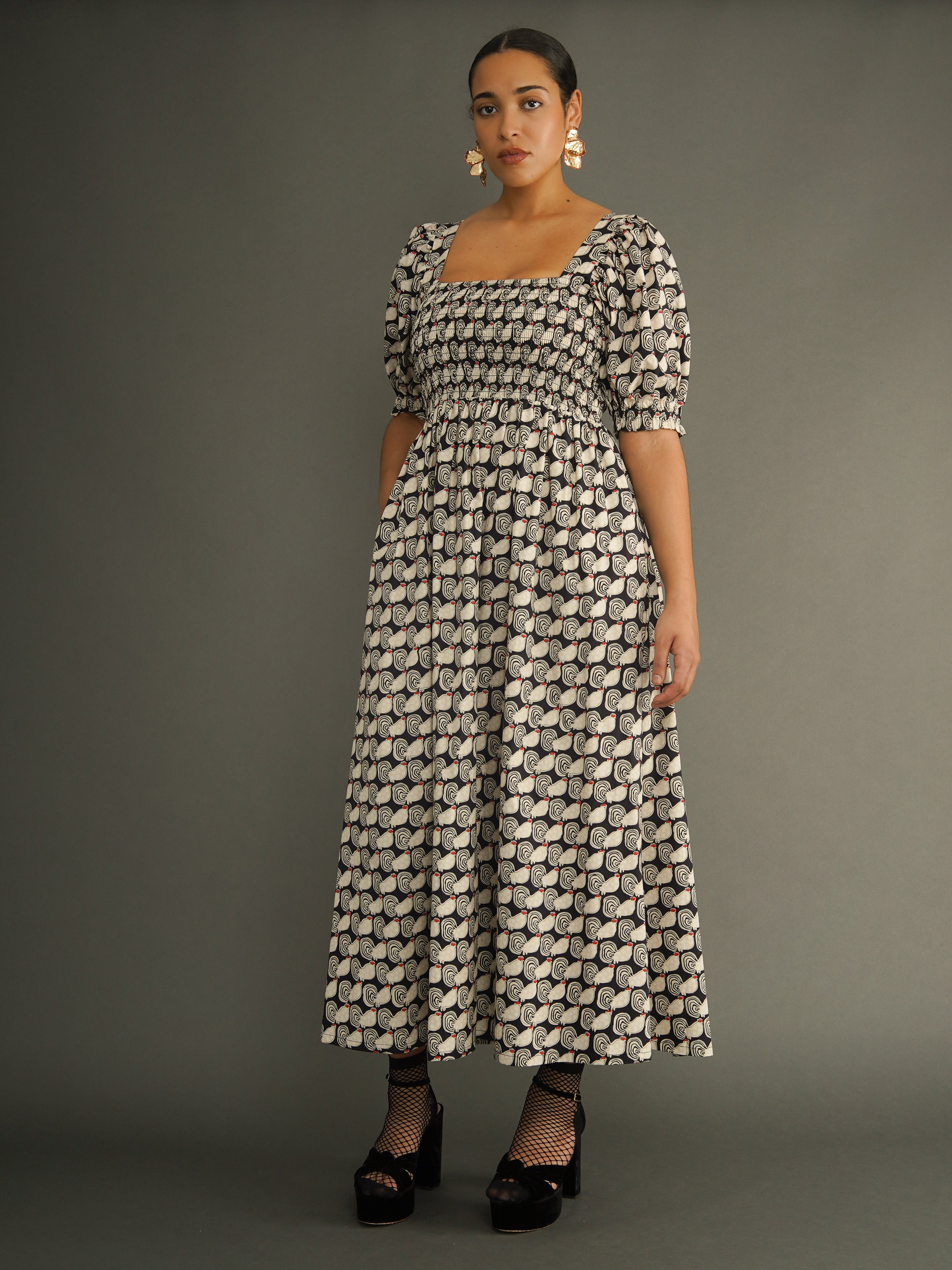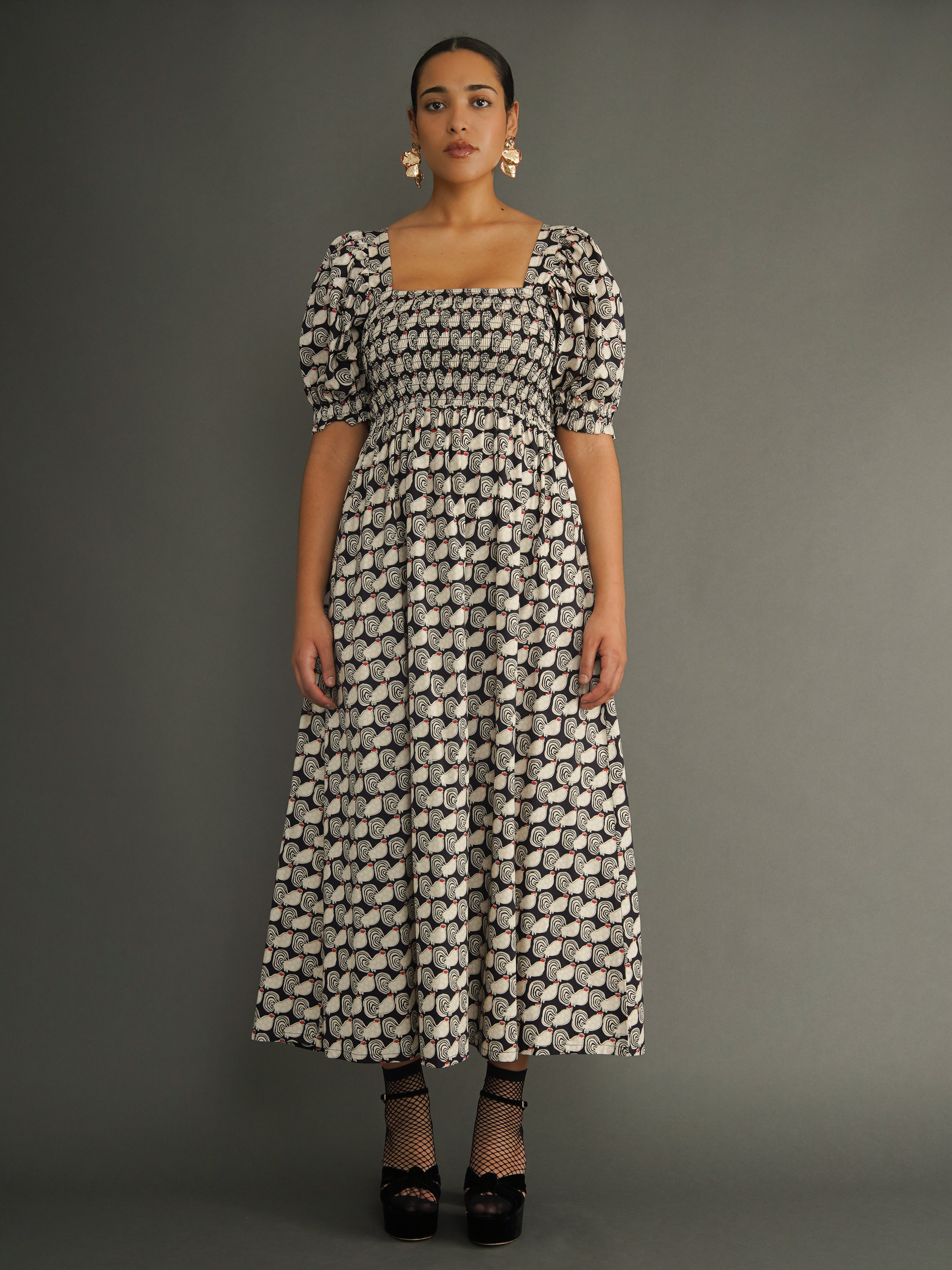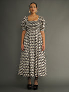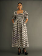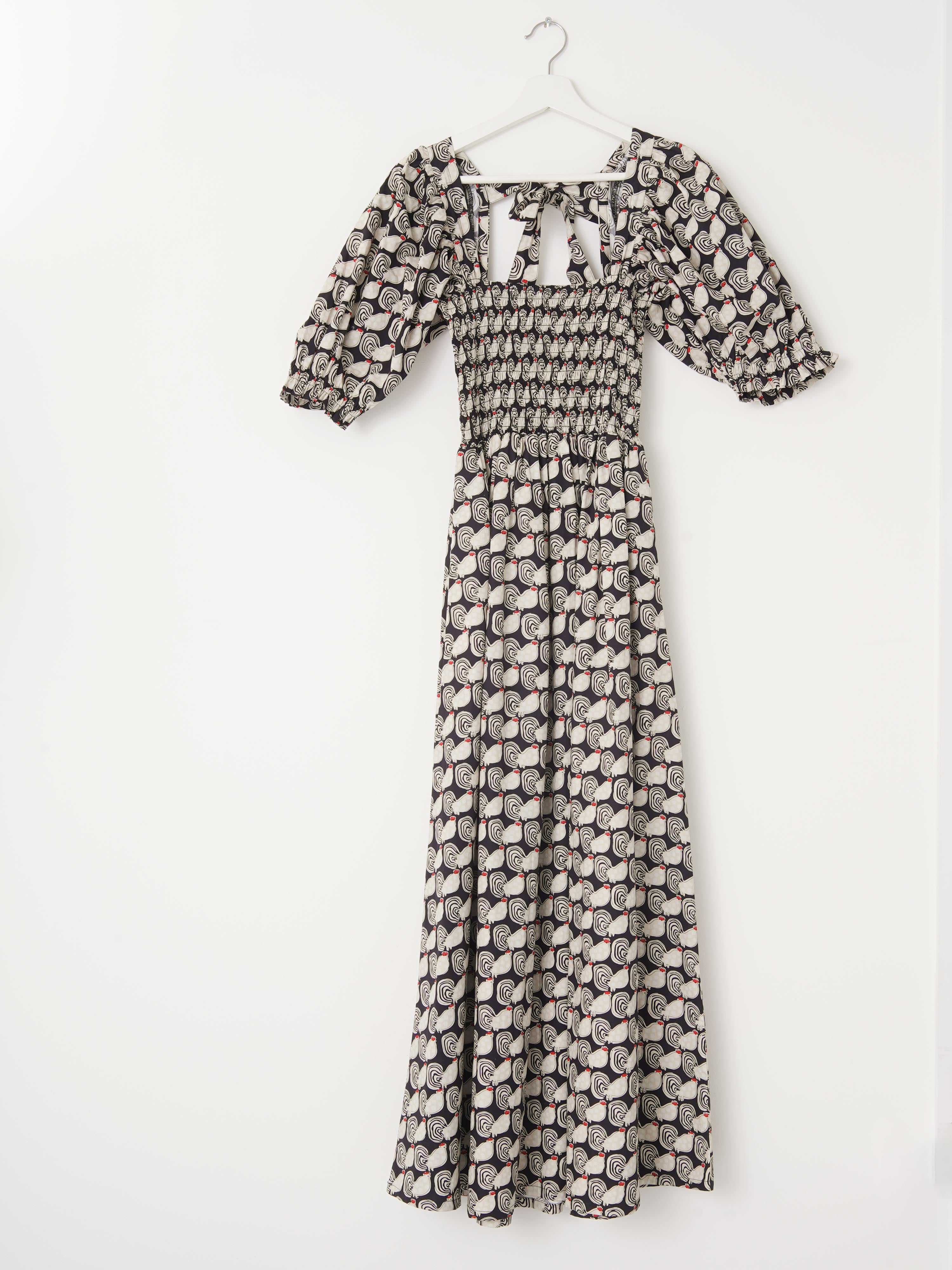 Cut from responsibly sourced deadstock cotton, the dress features a fully smocked bodice that creates shape and structure while remaining comfortable and flexible. Elbow-length puff sleeves with a gentle elastic finish add softness and balance, while the flowing maxi skirt moves effortlessly with the body.
