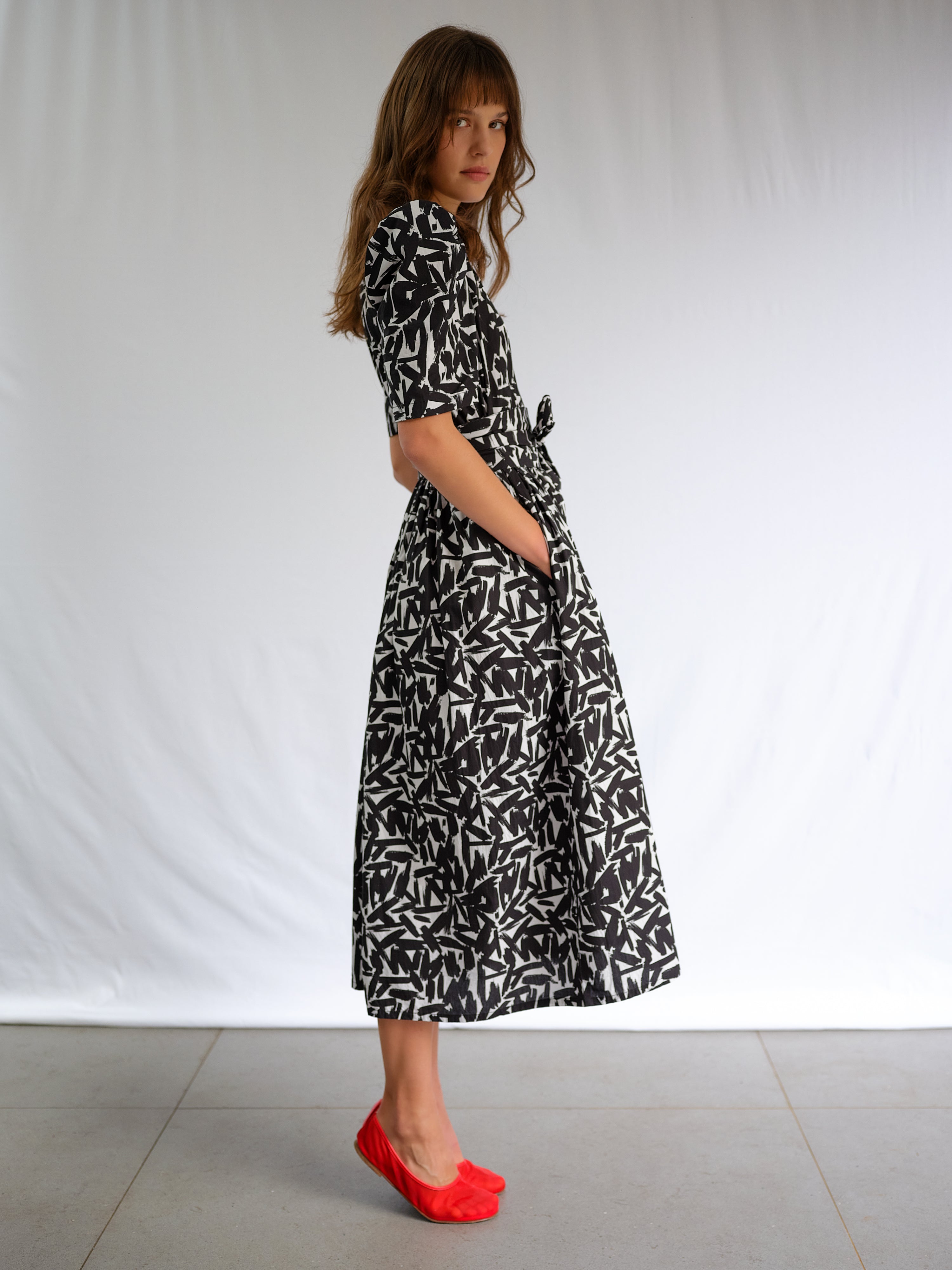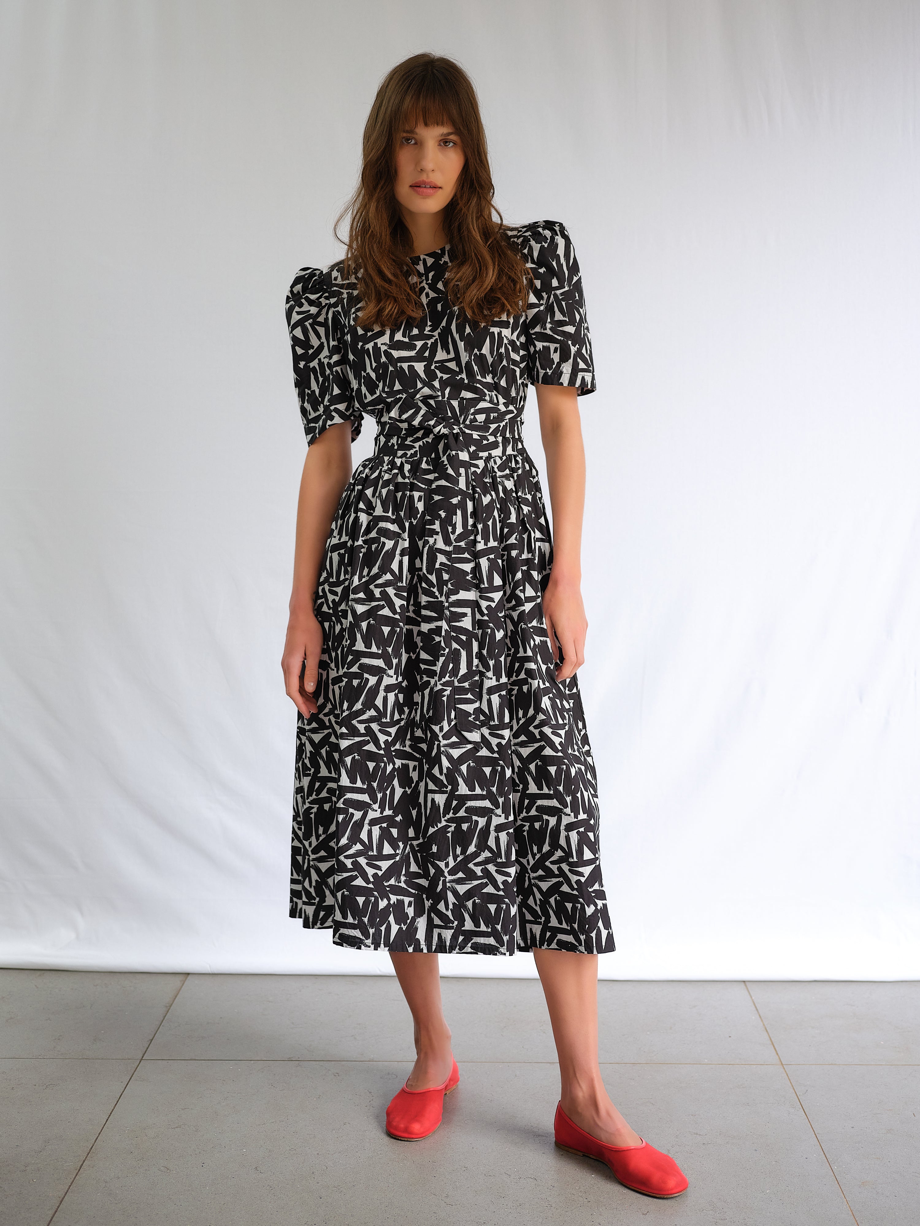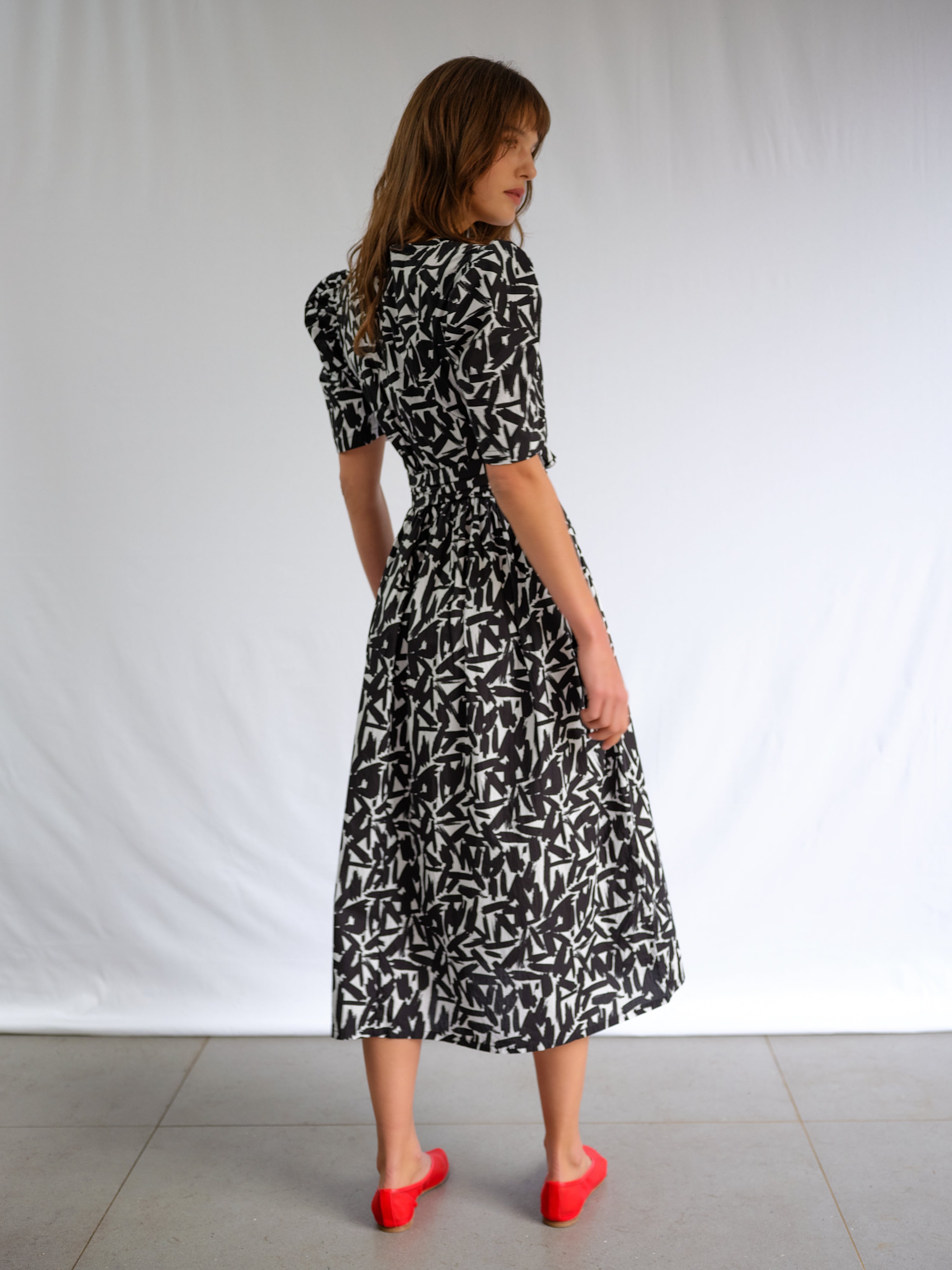 Reimagined in a striking black-and-white brushstroke print and cut from pre-washed cotton poplin, the Amina Dress holds its shape beautifully. The bodice is softly tailored with subtle shoulder pads for quiet drama, while the wide gathered skirt adds movement and ease.