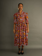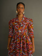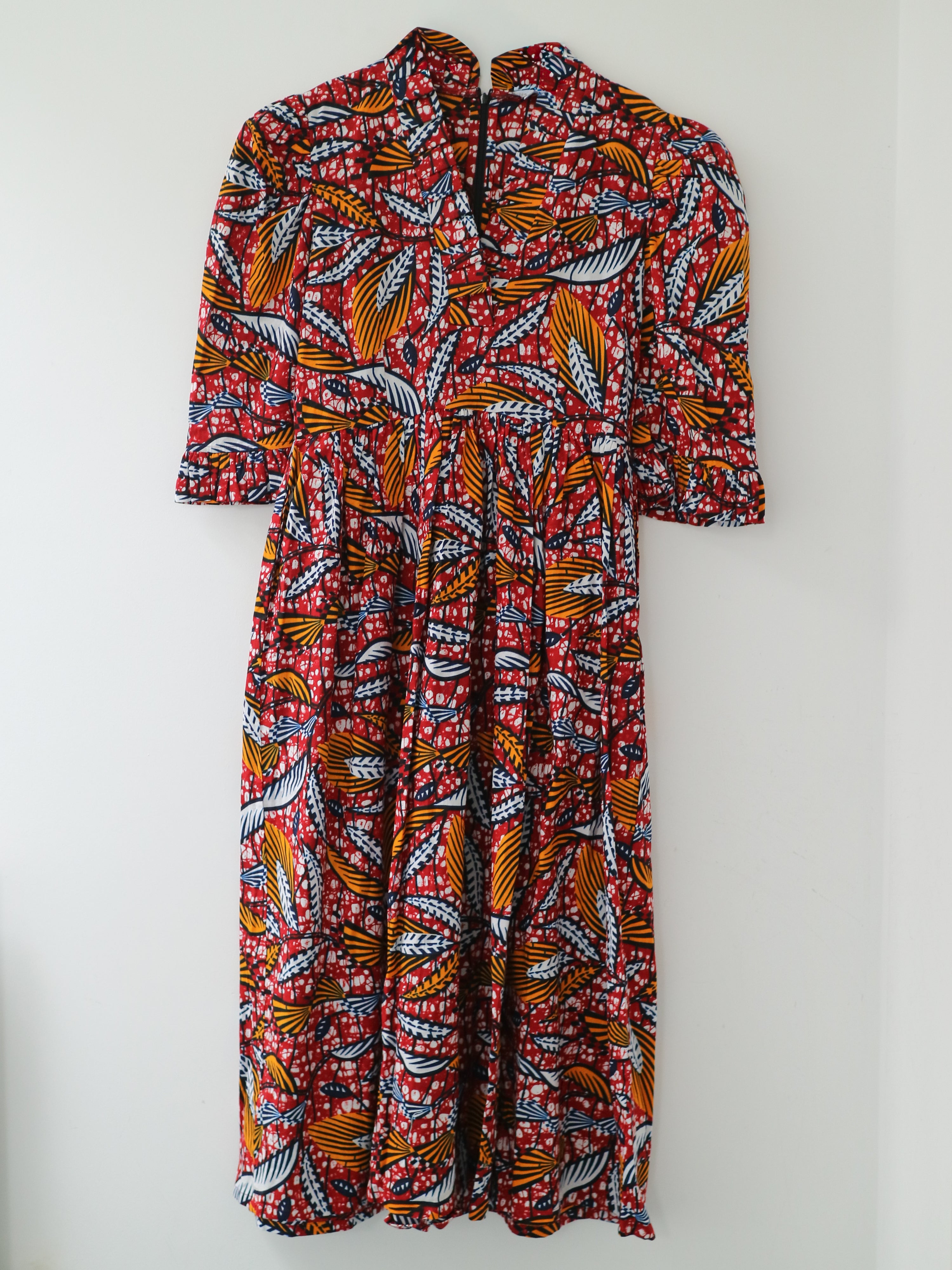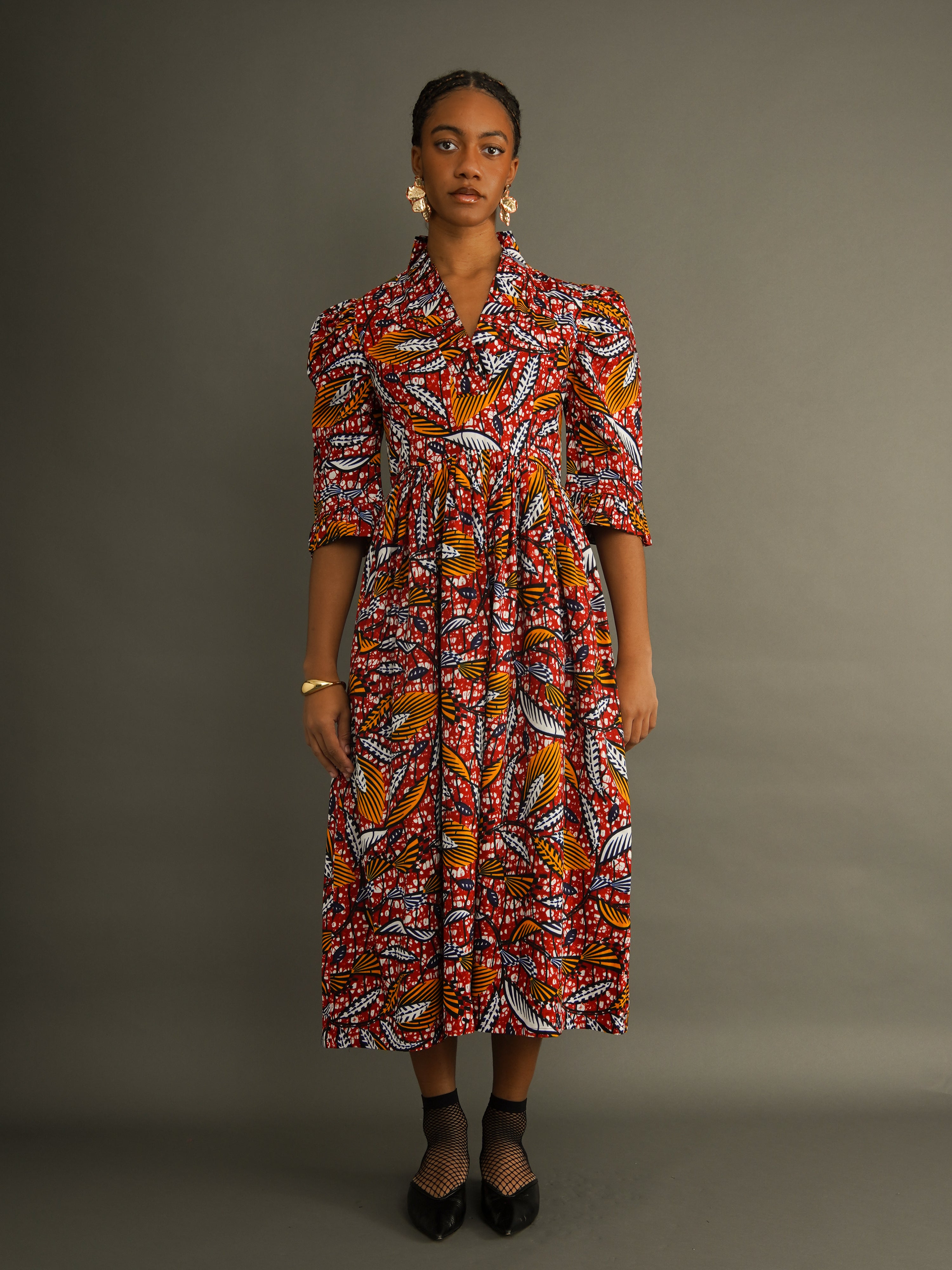 100% cotton Dutch wax fabric. Fitted bodice with enclosed zip at back. Deep V-neckline with ruffled collar. Structured shoulder pads for shape and definition. Puffed half sleeves. Midi length. Side pockets. Limited numbers.