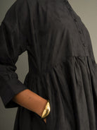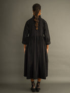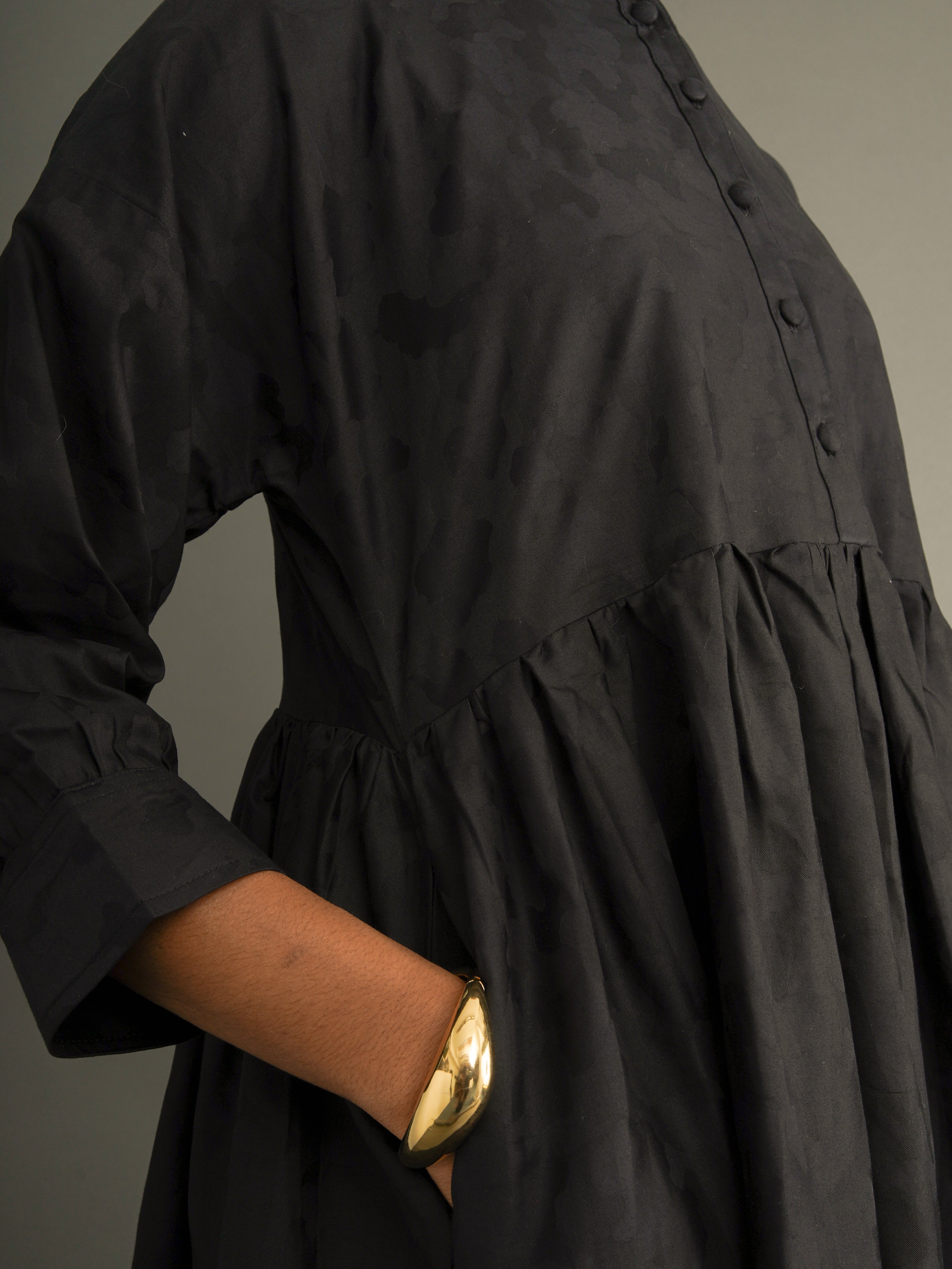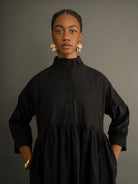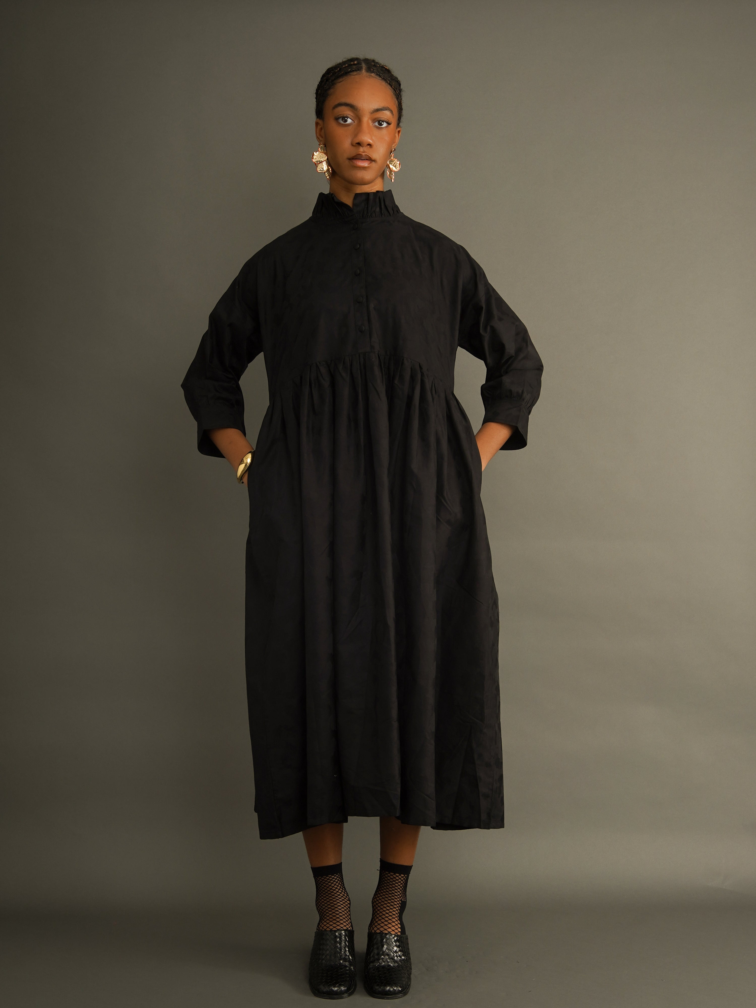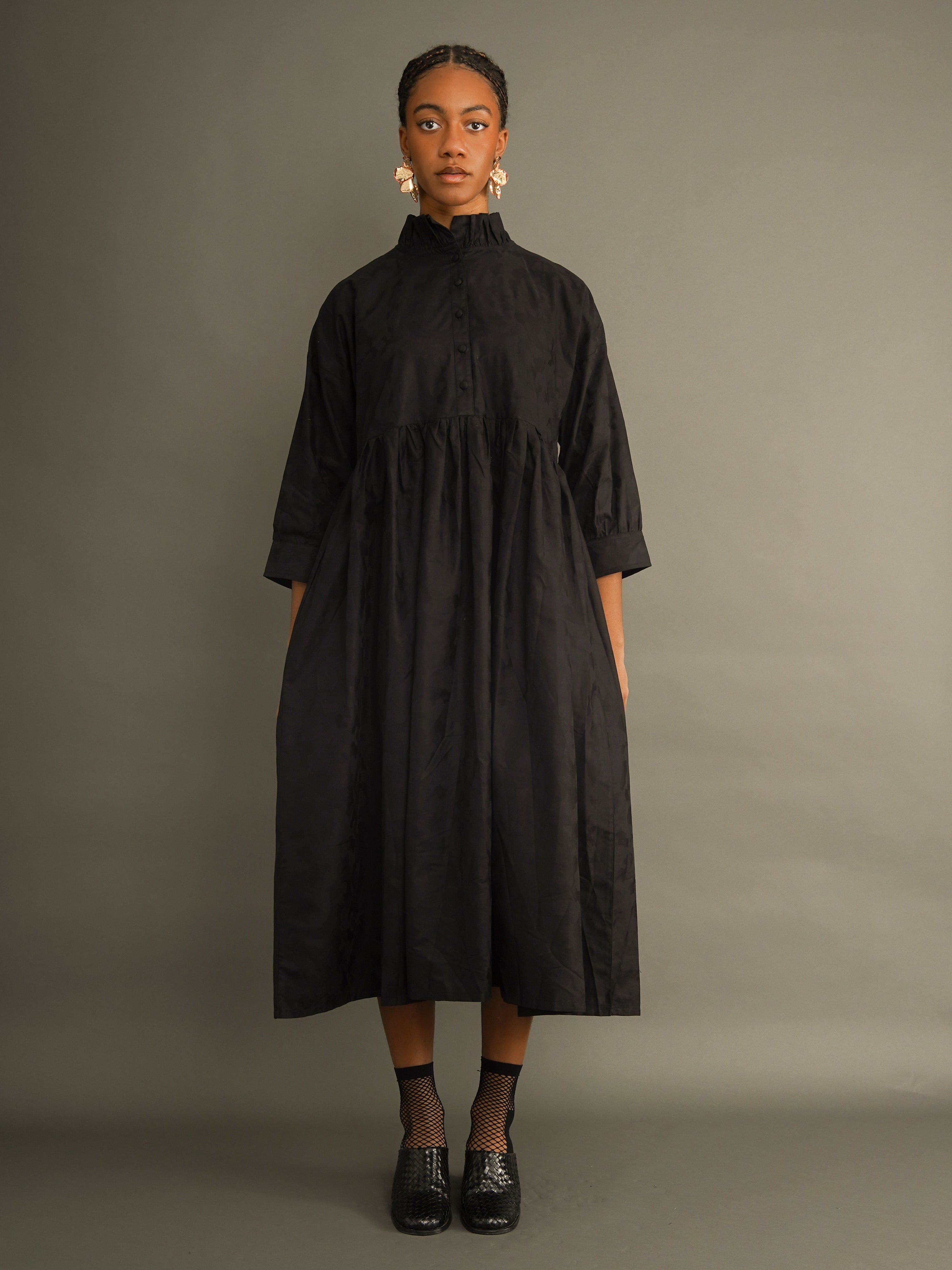 The high ruffled neckline and covered button placket give Doyin a refined, sculptural finish, while the gently gathered waist creates ease and movement without overwhelming your shape. Three-quarter sleeves and a flowing midi length make it a timeless piece you can wear all year round.