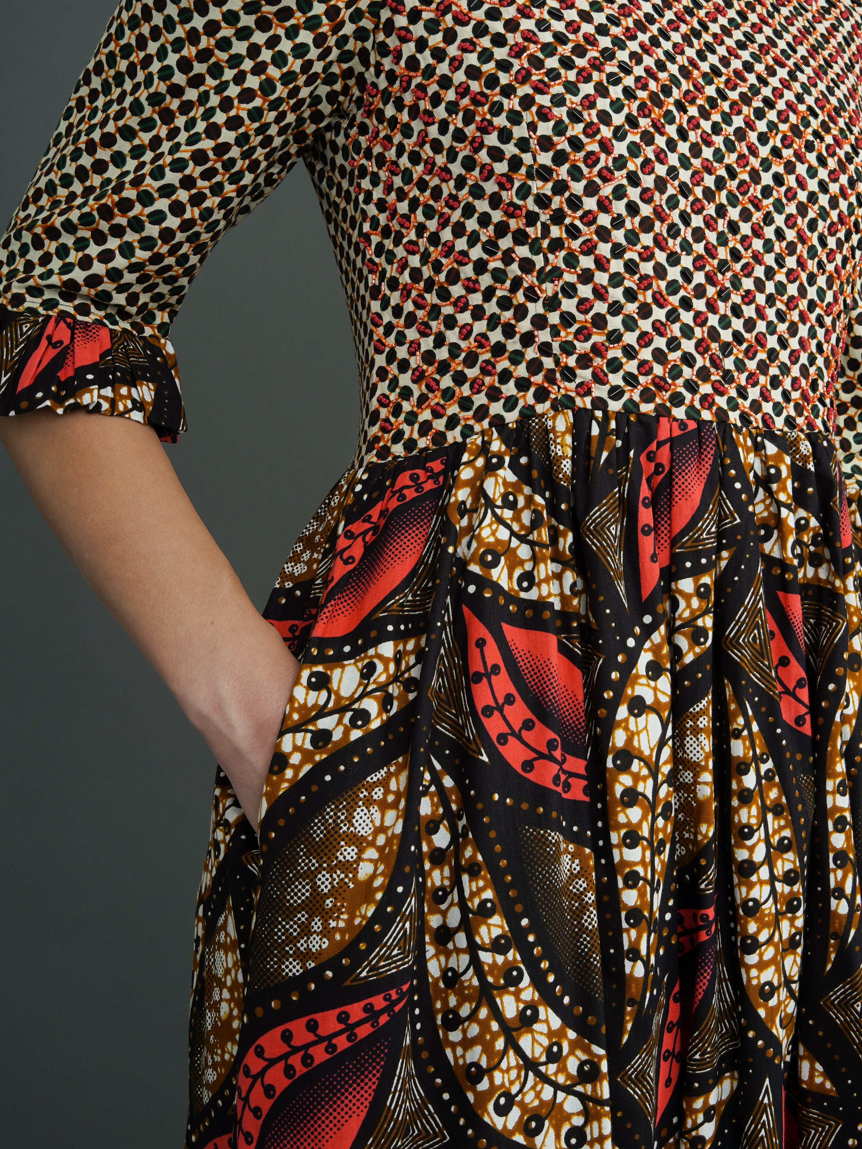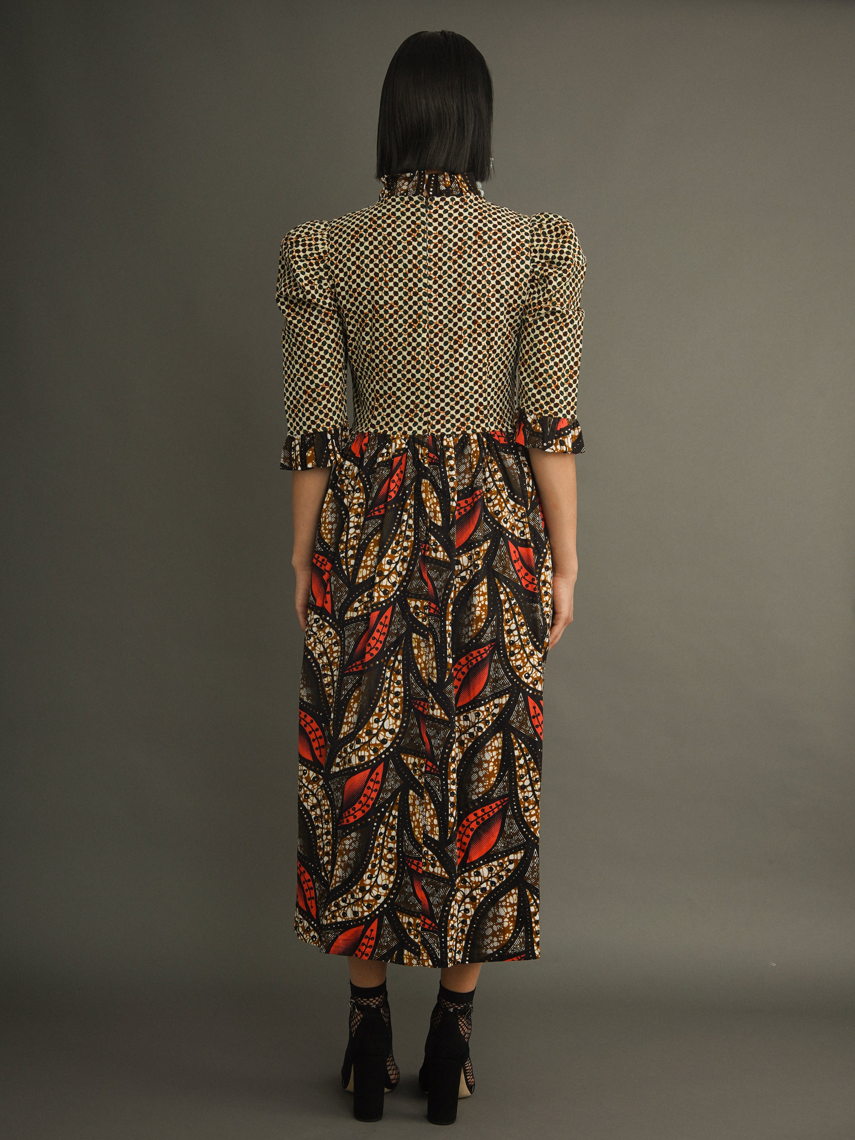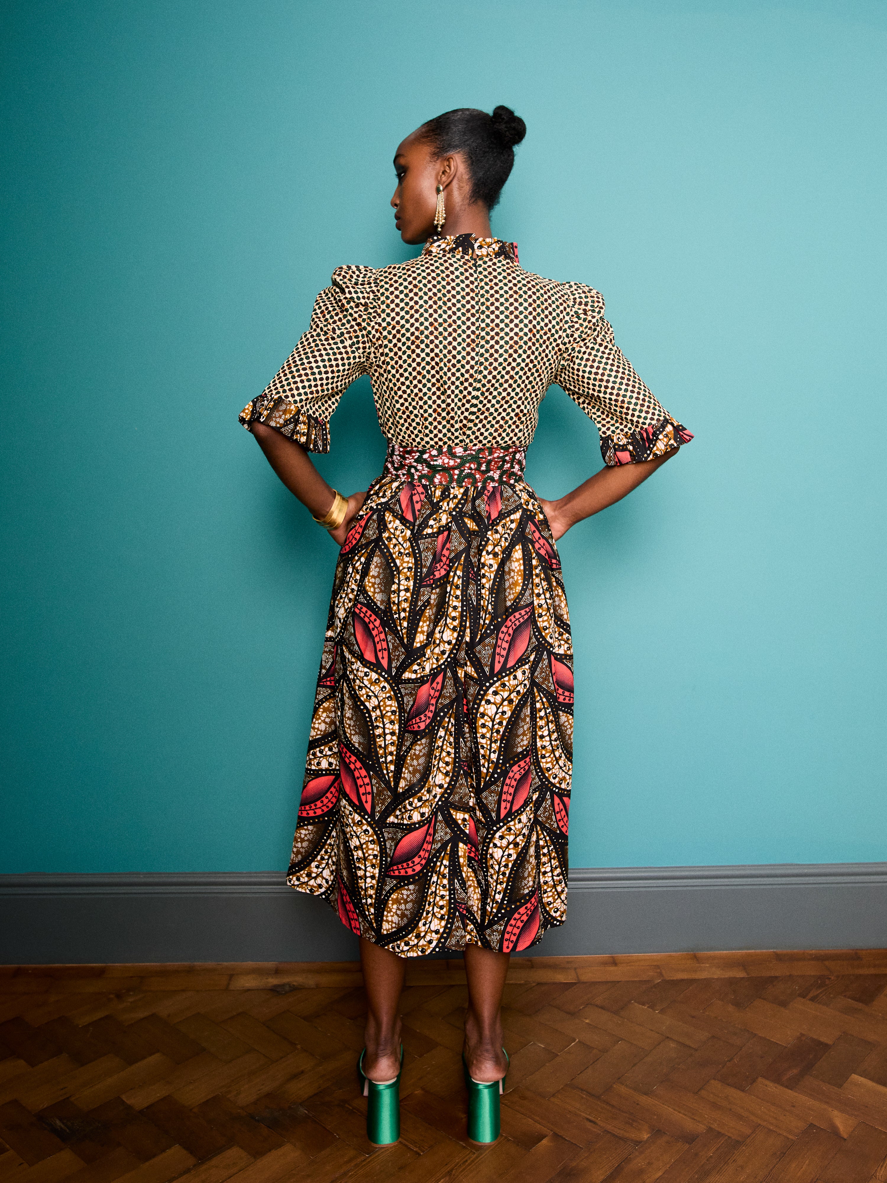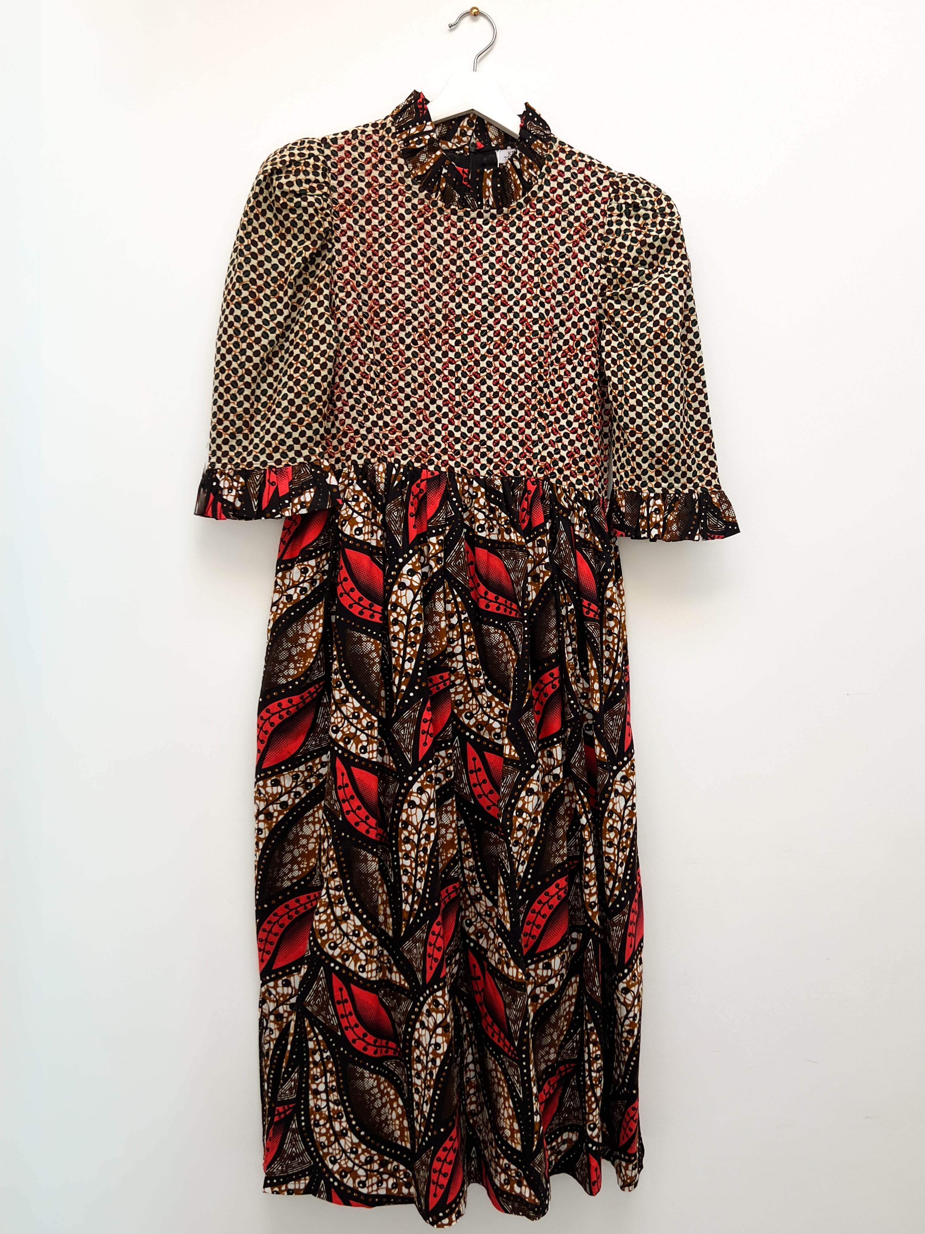 100% cotton Dutch wax fabric. Fully lined.  Fitted bodice with enclosed zip at back. Ruffled collar. Structured shoulder pads for shape and definition. Puffed half sleeves. Midi length. Side pockets. Limited numbers.