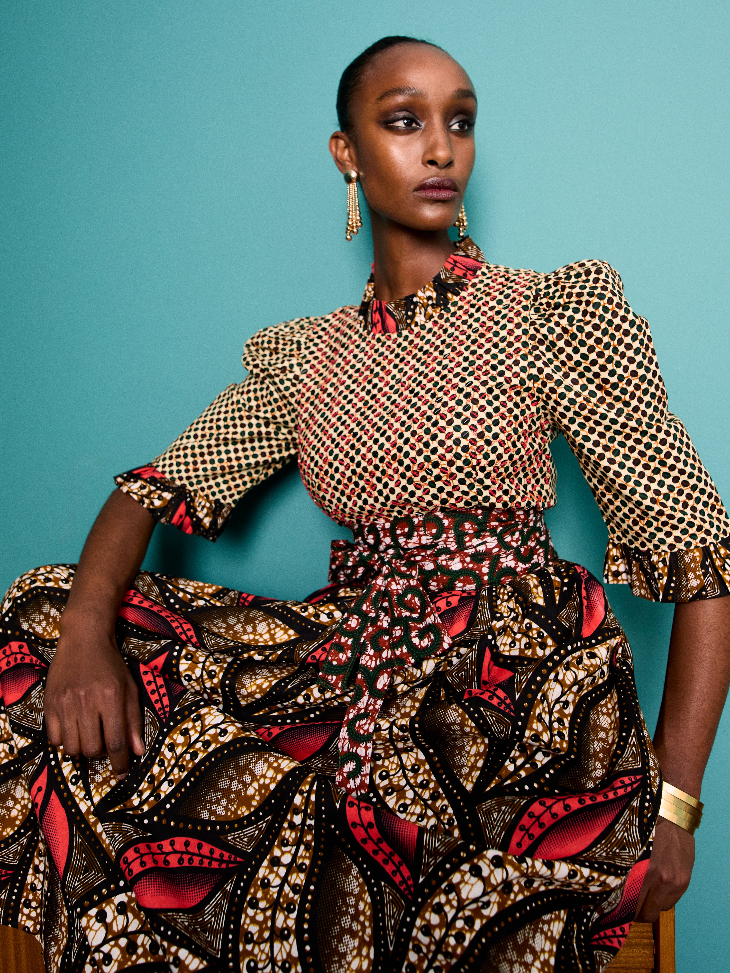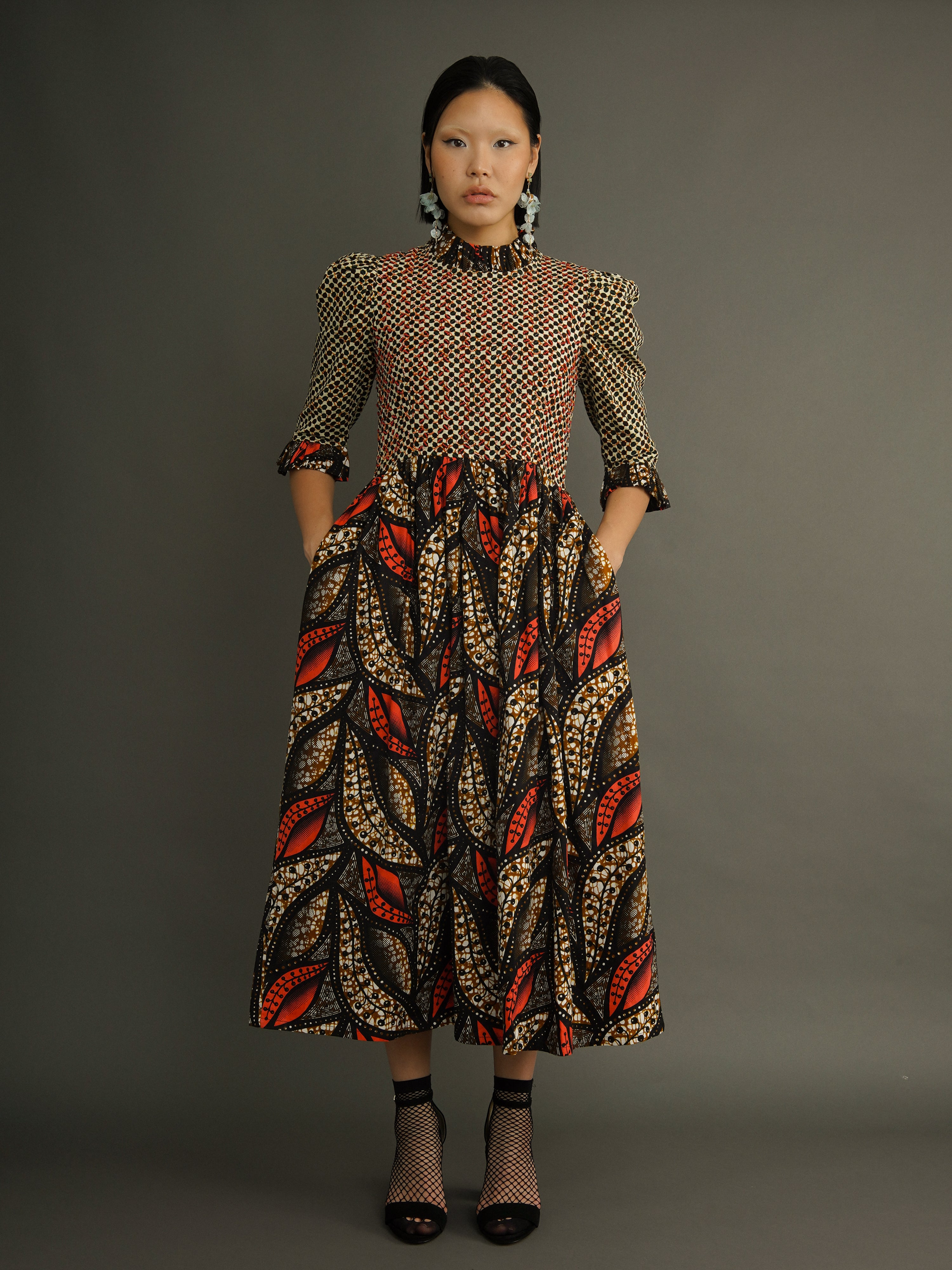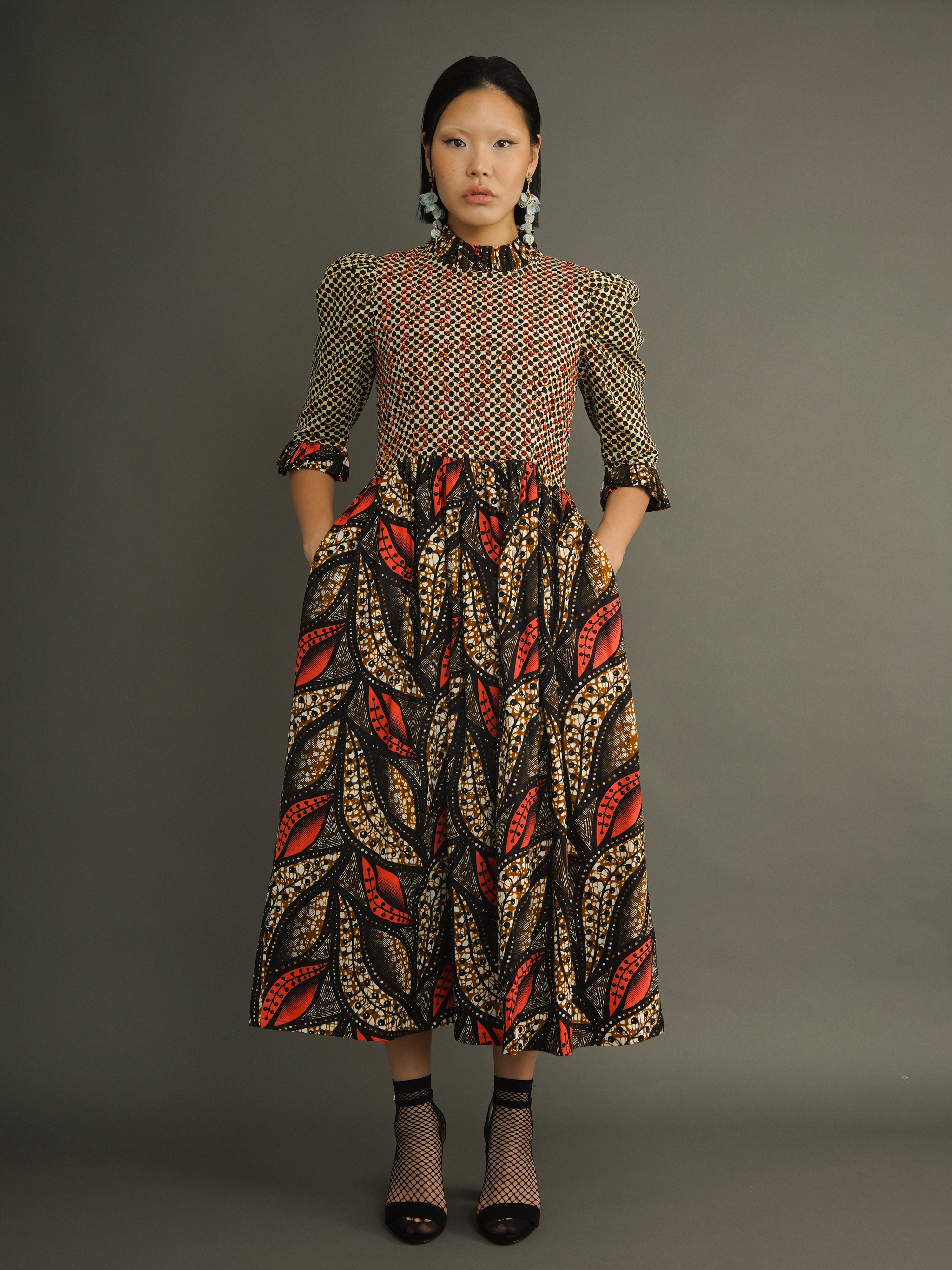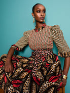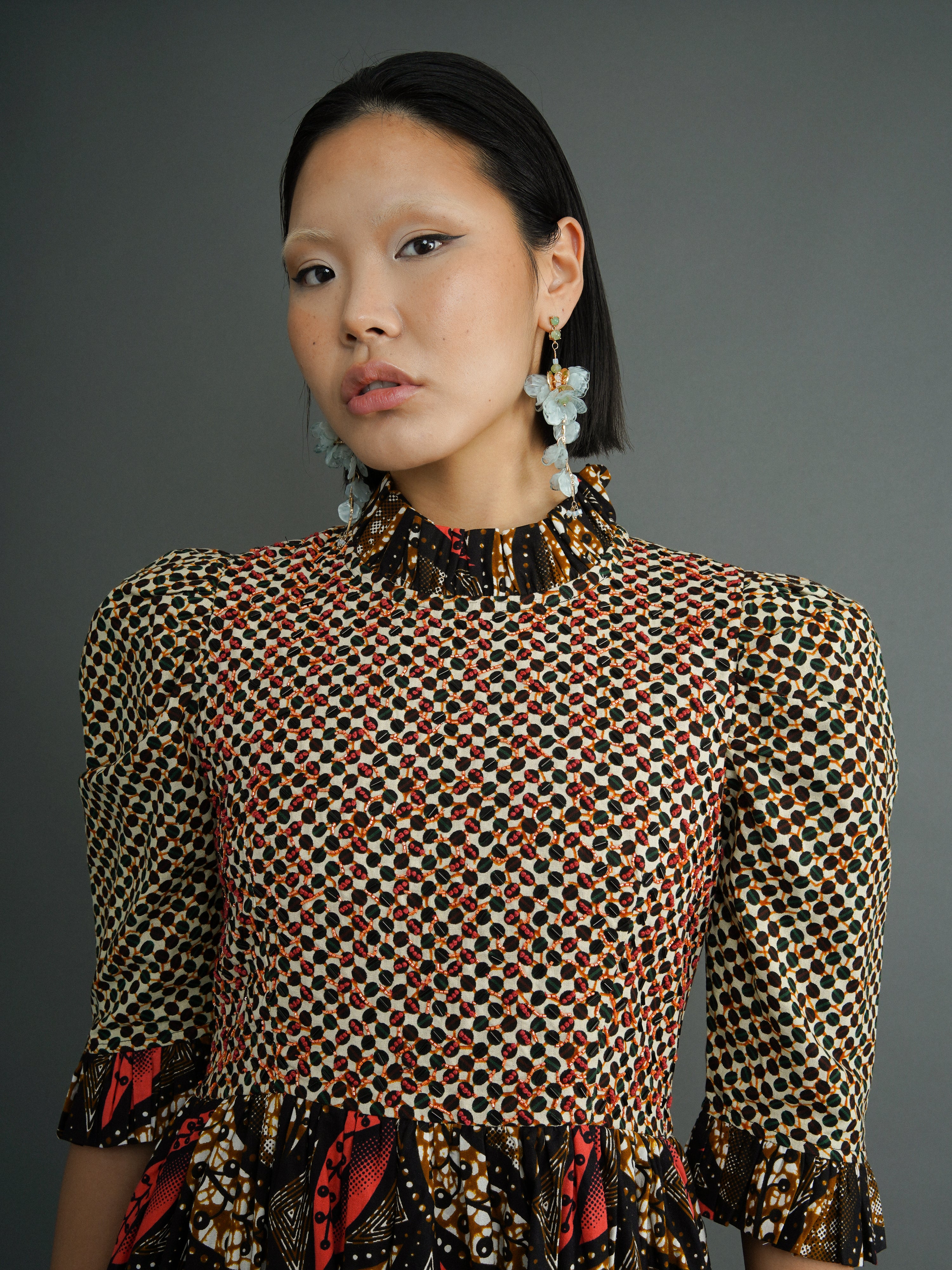 100% cotton Dutch wax fabric. Fully lined.  Fitted bodice with enclosed zip at back. Ruffled collar. Structured shoulder pads for shape and definition. Puffed half sleeves. Midi length. Side pockets. Limited numbers.