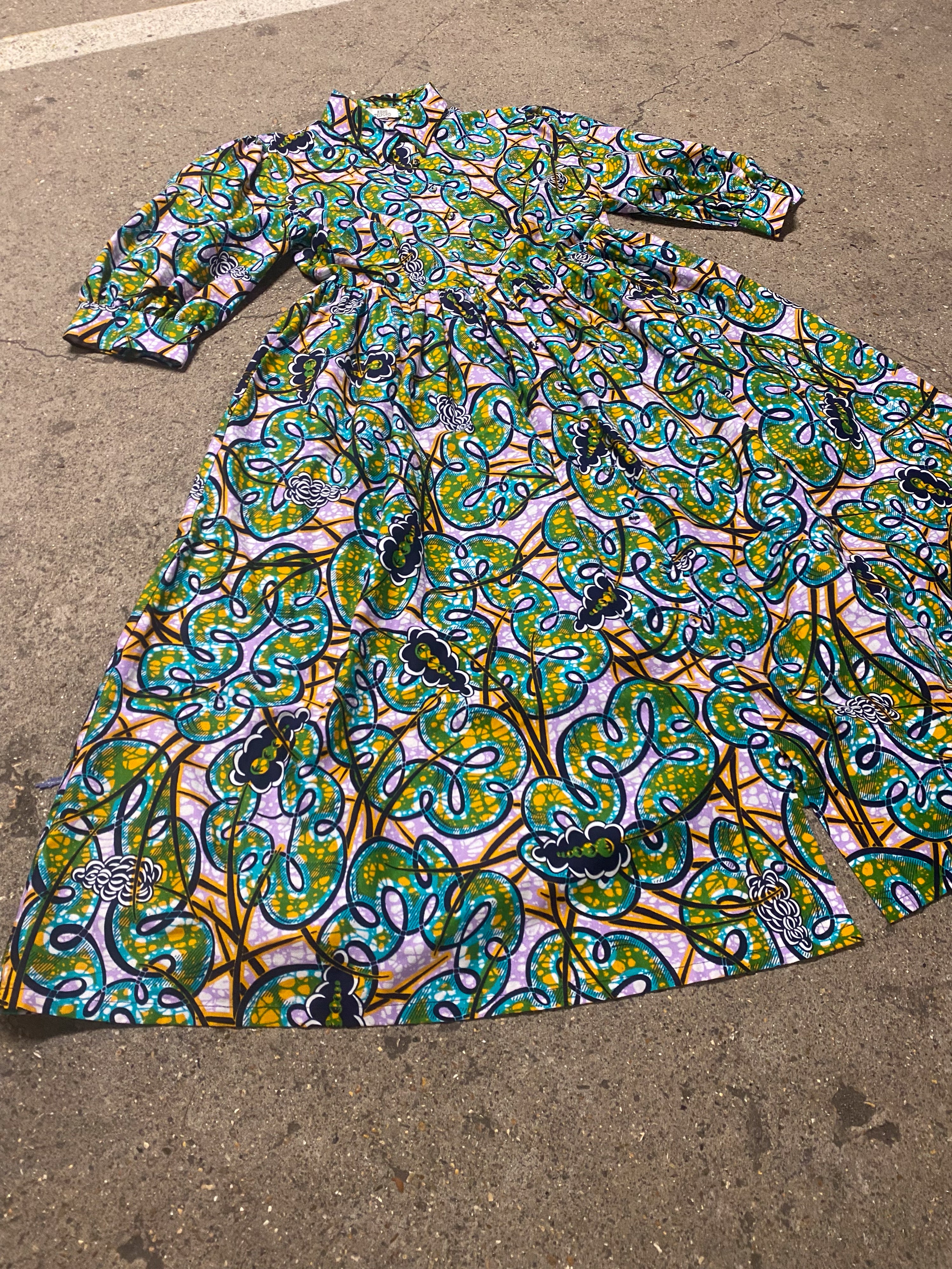 100% Dutch wax cotton. Fitted bodice and flared skirt. Button-down front with collar. ¾-length sleeves. Side pockets. Matching belt. Made in limited quantities