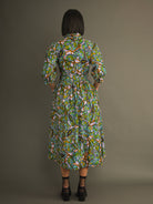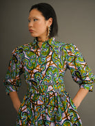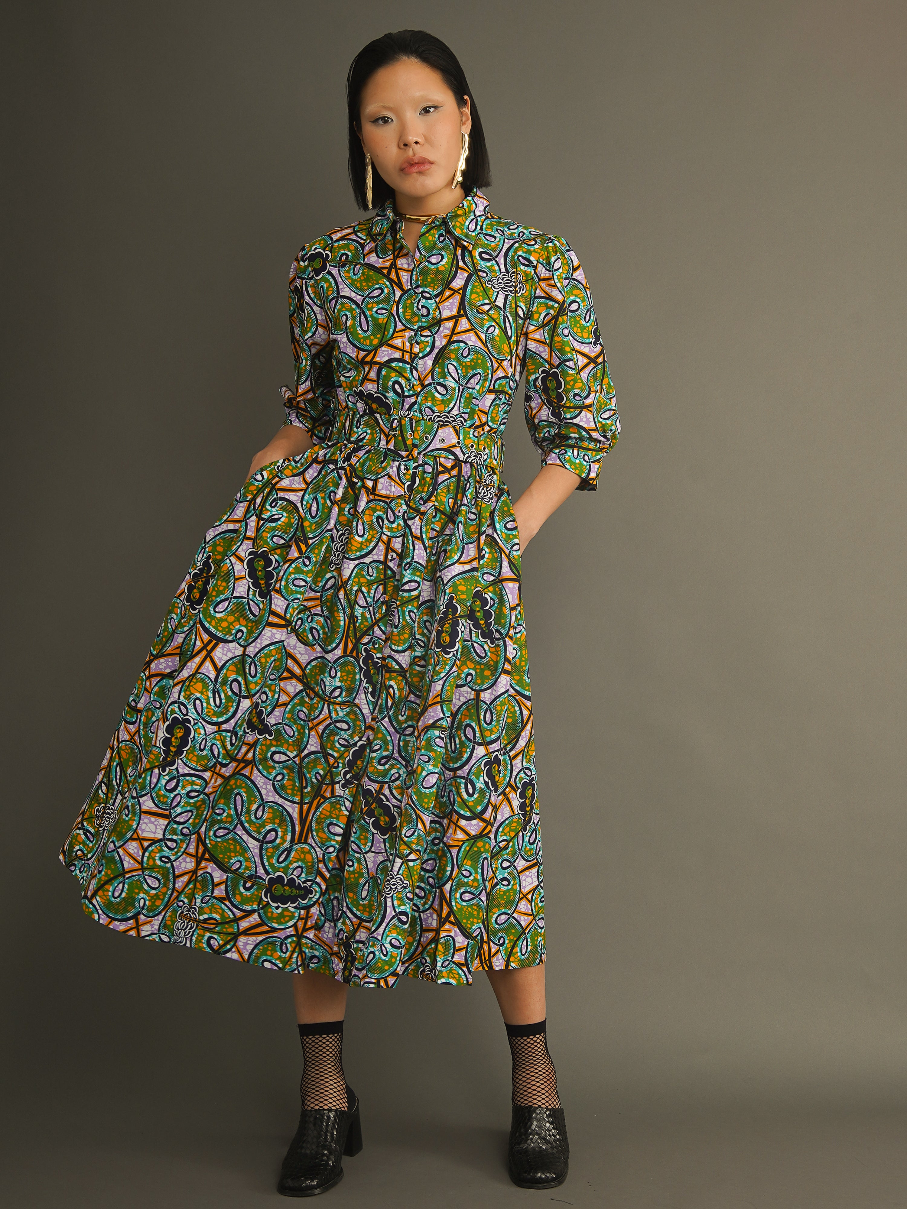 A timeless silhouette, reimagined in bold Dutch wax cotton. This tailored shirt dress features a neat collar, button-through front, and a softly gathered waist that flatters while allowing movement. The matching belt cinches the waist for definition, while the full midi-length skirt brings volume and ease.