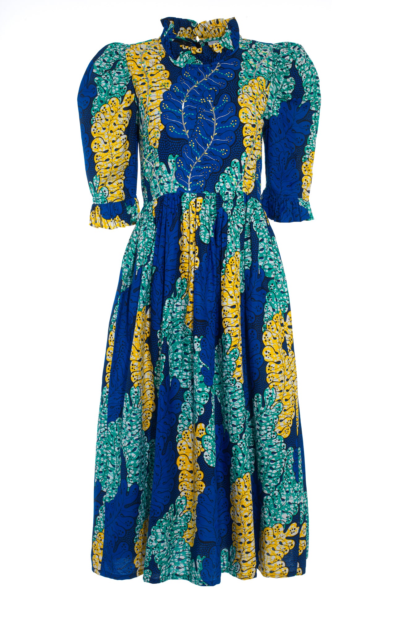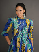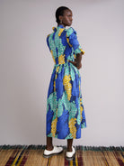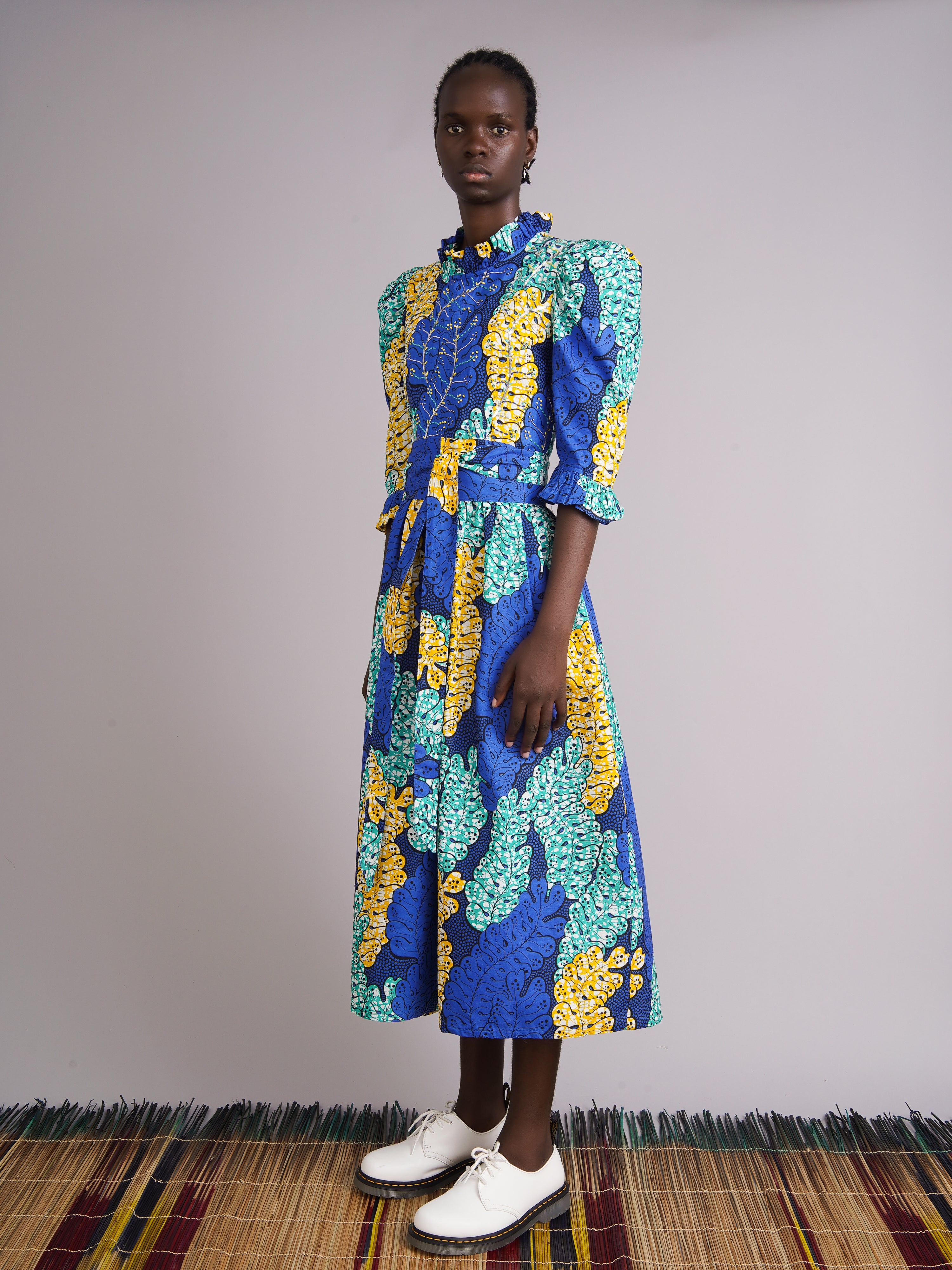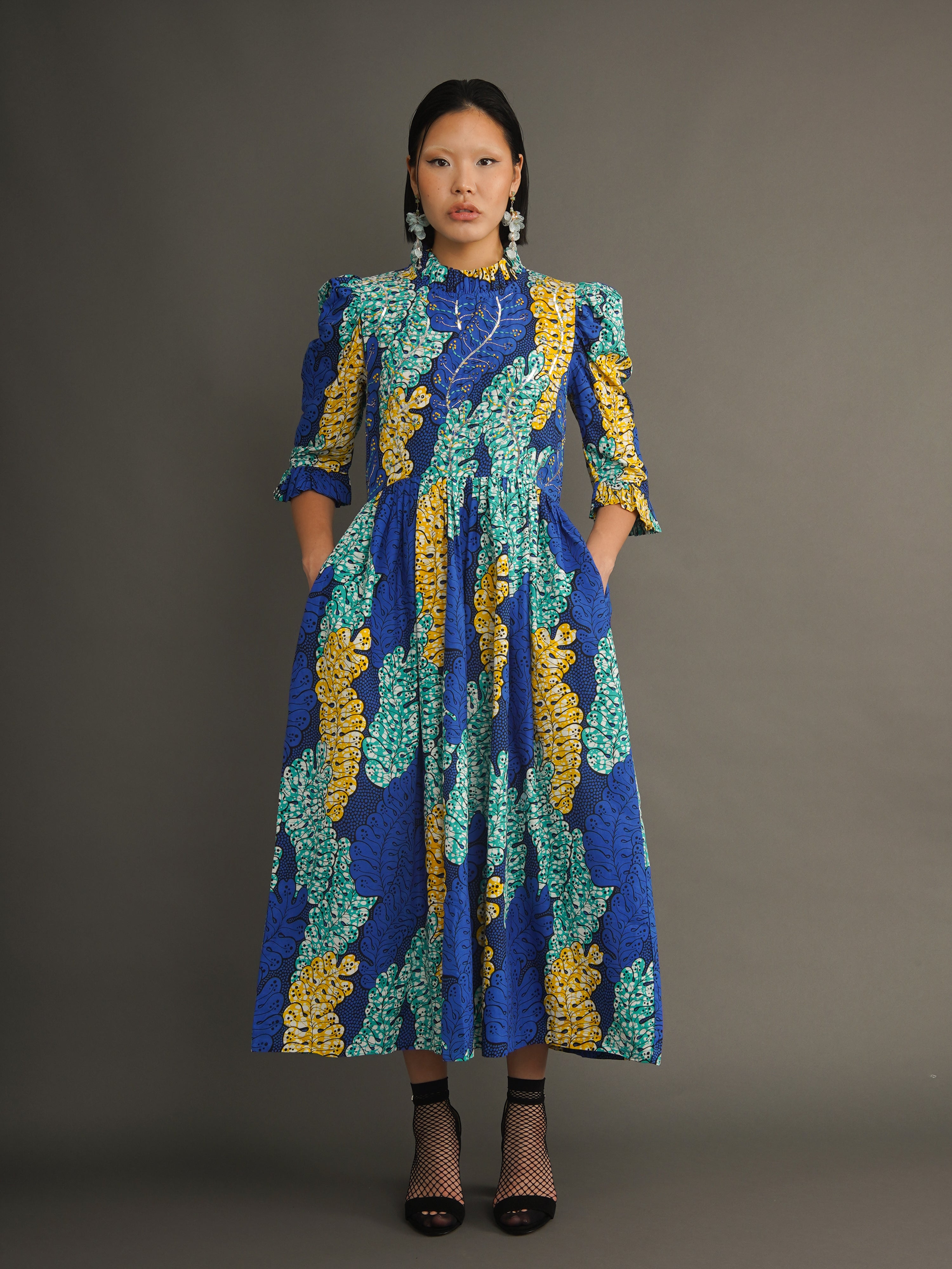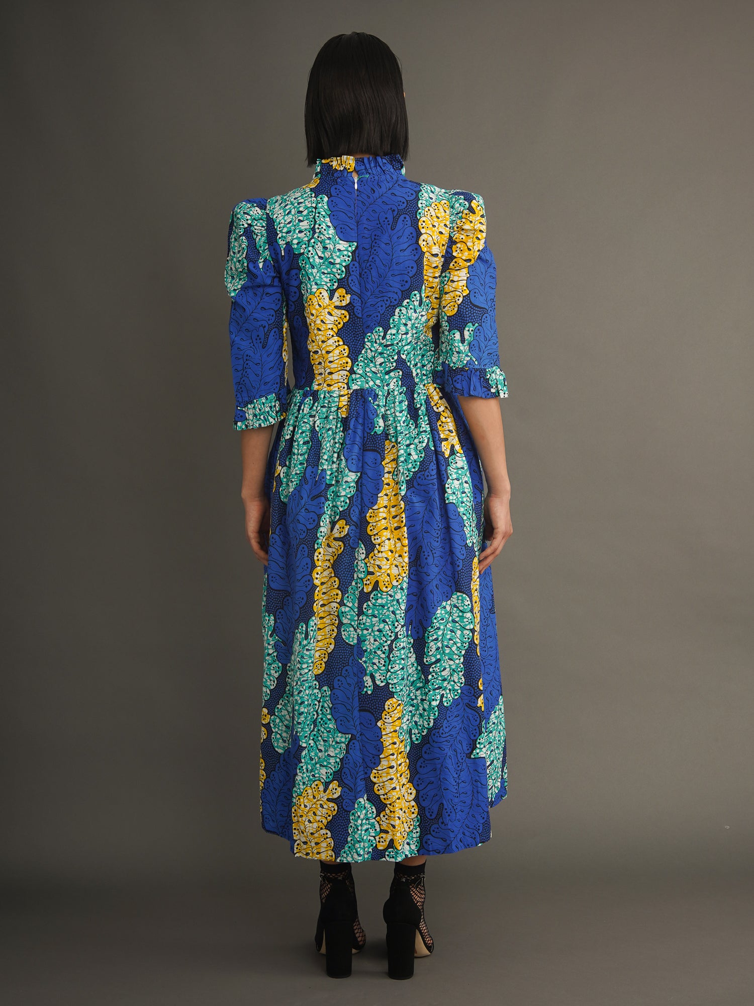 100% cotton Dutch wax fabric. Fully lined. Fitted bodice with enclosed zip at back. Deep V-neckline with ruffled collar. Structured shoulder pads for shape and definition. Puffed half sleeves. Midi length. Side pockets. Limited numbers.