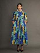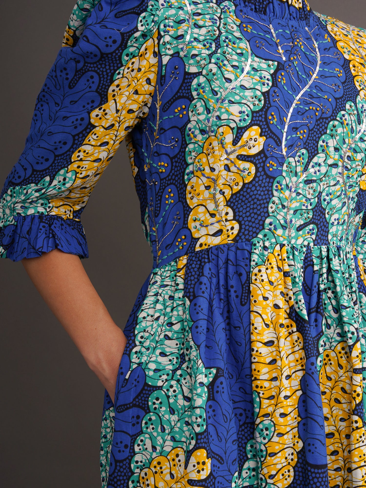 Our artisans spent a full day hand-embellishing the chest of each dress with shimmering sequins and beads. Every stitch, every sparkle is placed by hand, making each Greta dress a one-of-a-kind treasure. The intricate beadwork celebrates craftsmanship while allowing the bold pattern to shine.