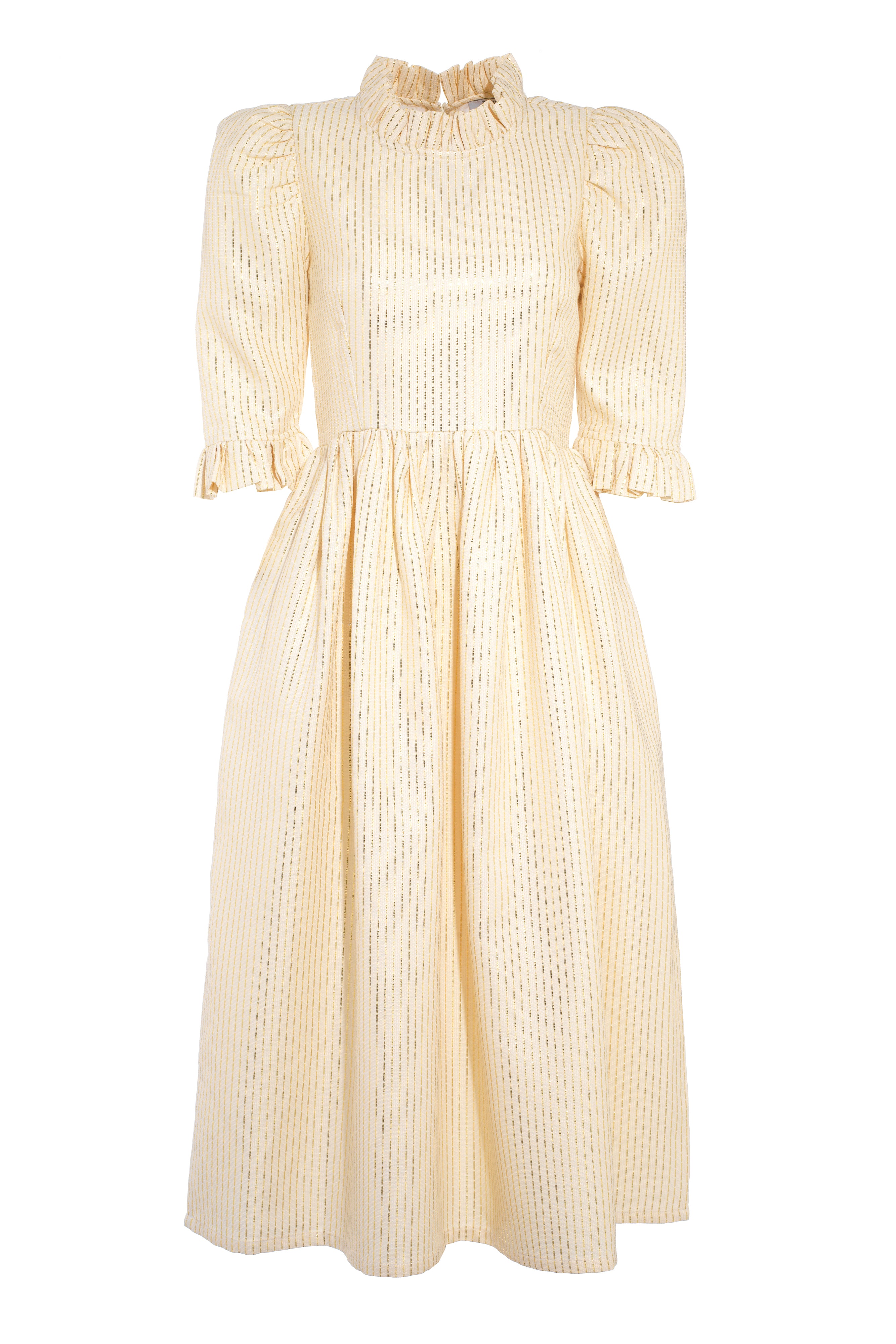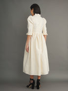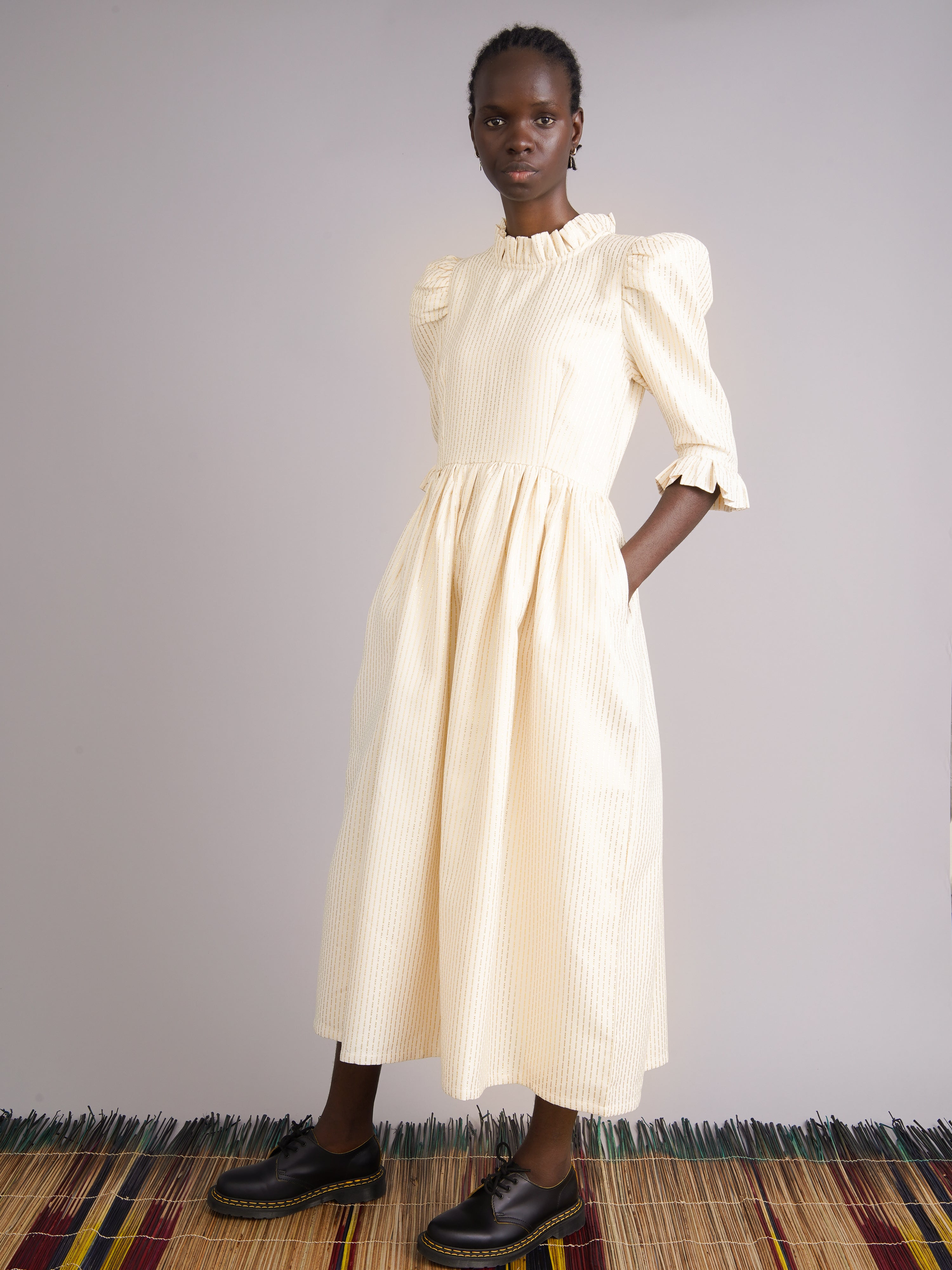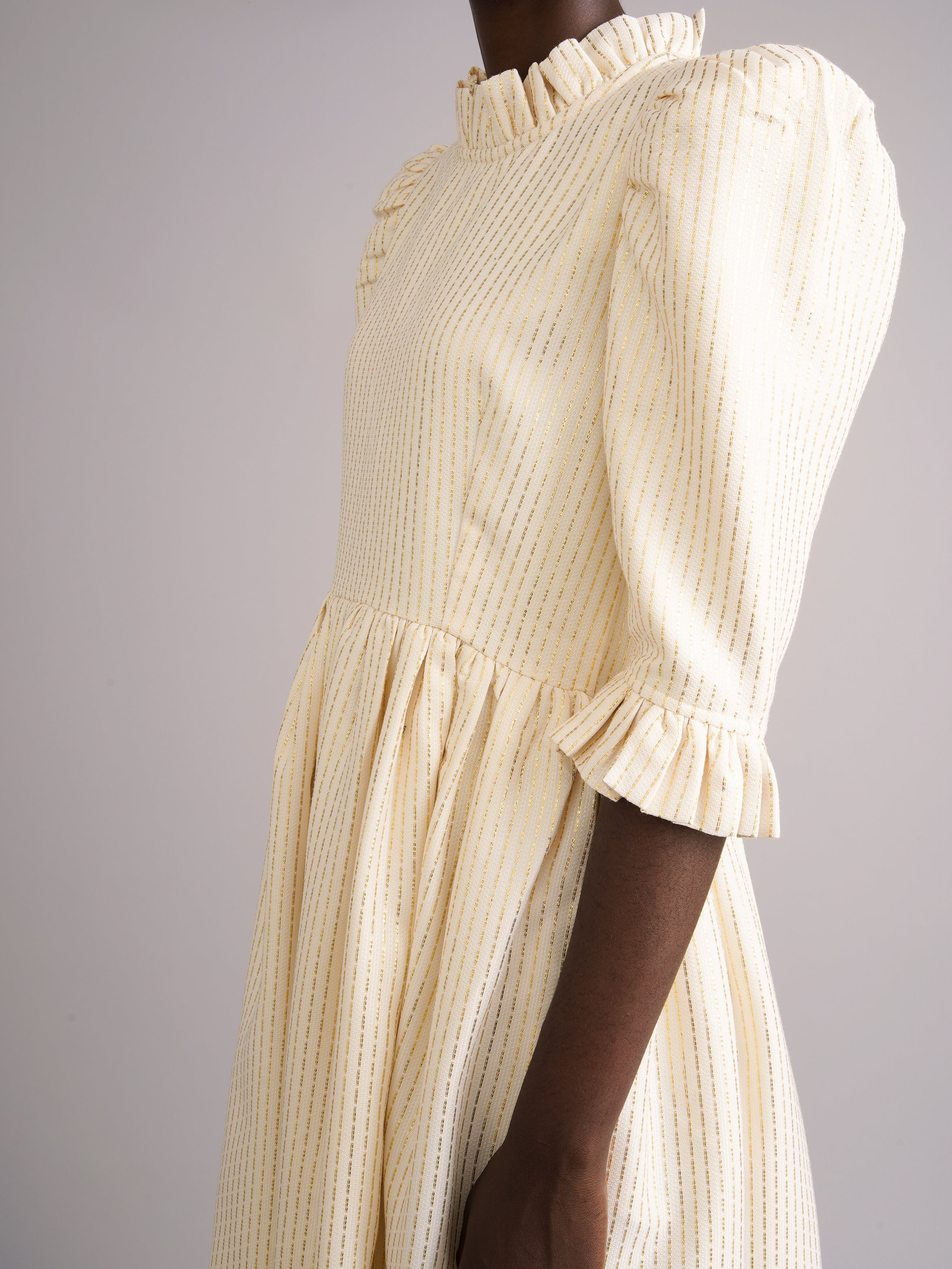 100% cotton ivory jacquard with gold Lurex thread. Fully lined for comfort and structure. Ruffled high neck and puffed sleeves. Side seam pockets. Midi length. Enclosed zip at the back
