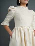 The Greta Dress is cut from an ex-designer ivory jacquard 100% cotton fabric, woven with subtle gold metallic Lurex stripes that catch the light beautifully. The deep cream texture gives this piece a quiet luxury feel refined yet full of character, like all Kemi Telford pieces.