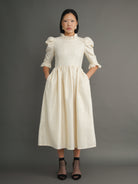 This fully lined midi dress features a fitted bodice with an enclosed zip at the back, a soft ruffled collar, and puffed sleeves that finish with delicate frills. The full gathered skirt drapes elegantly, with side pockets that make it as practical as it is graceful.