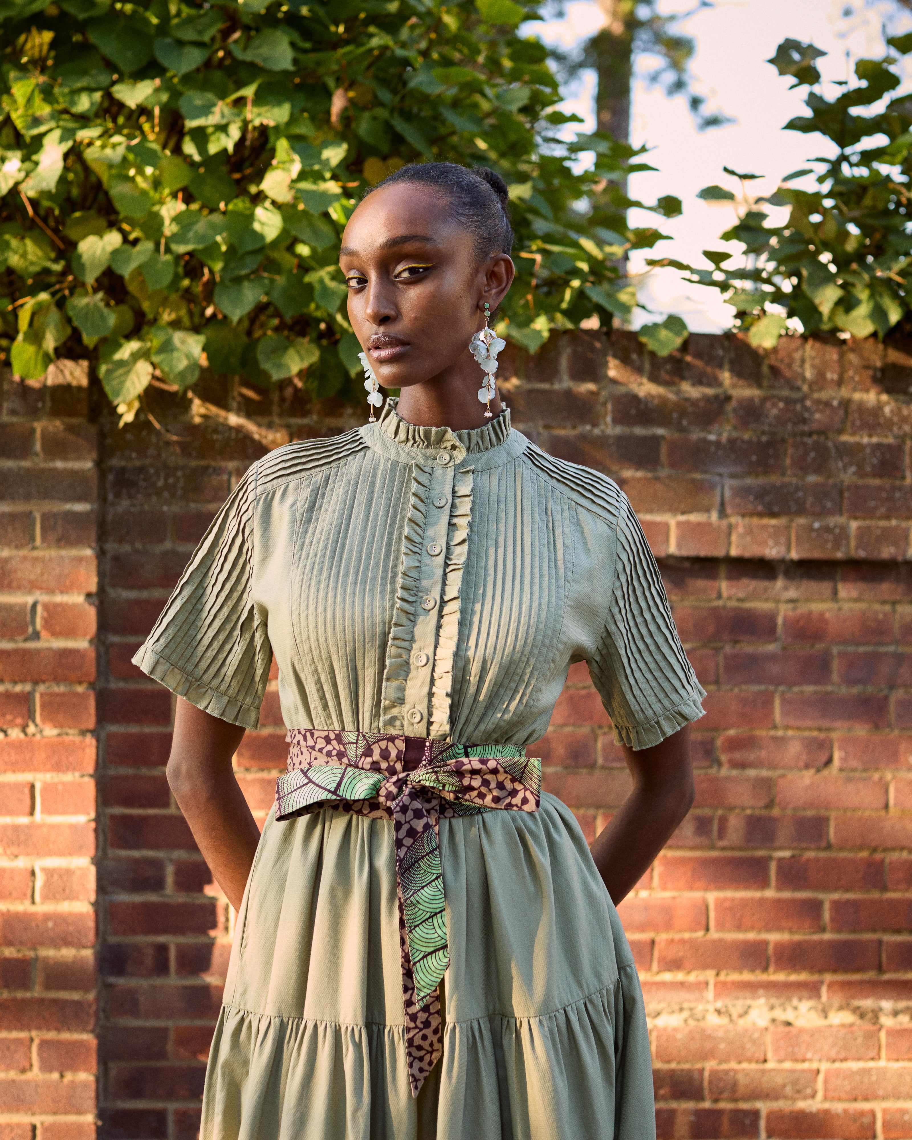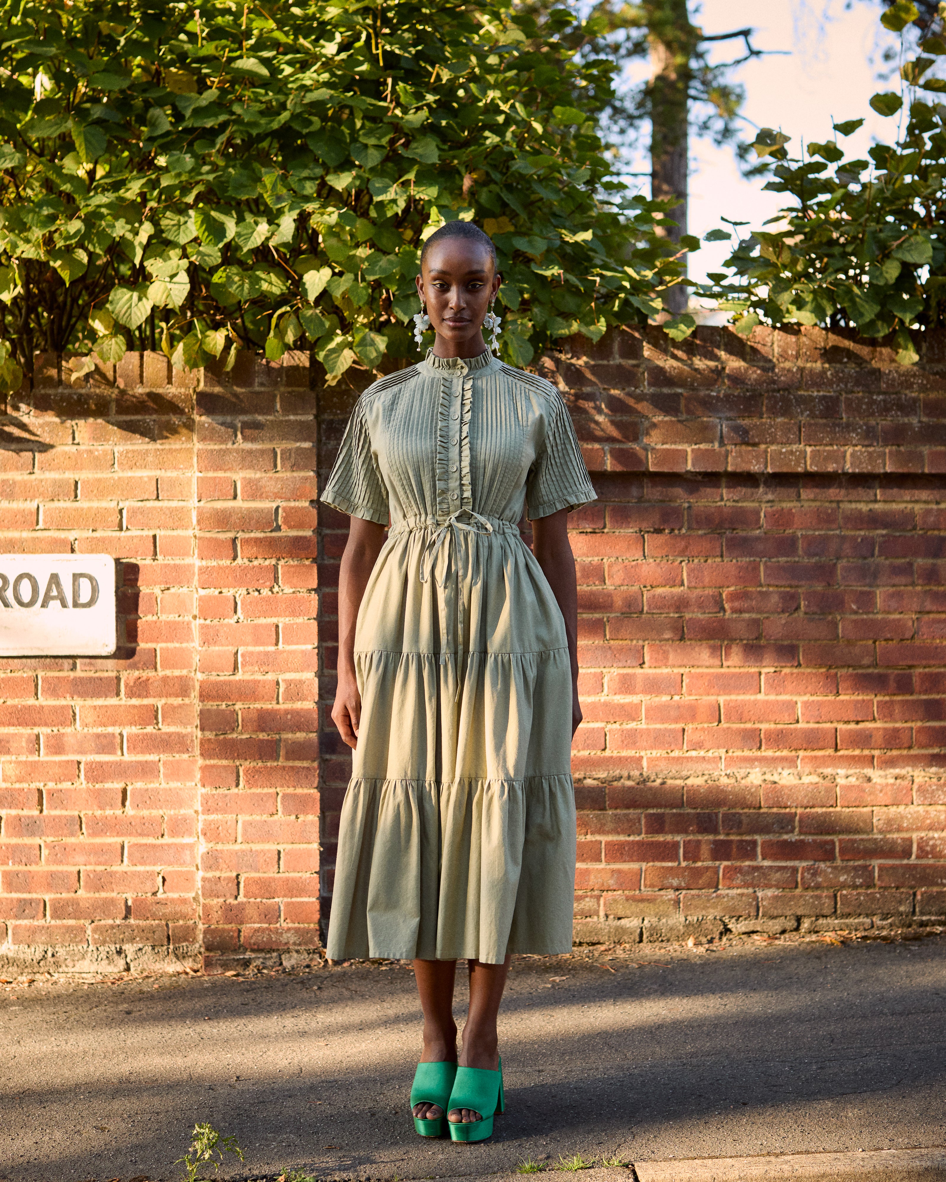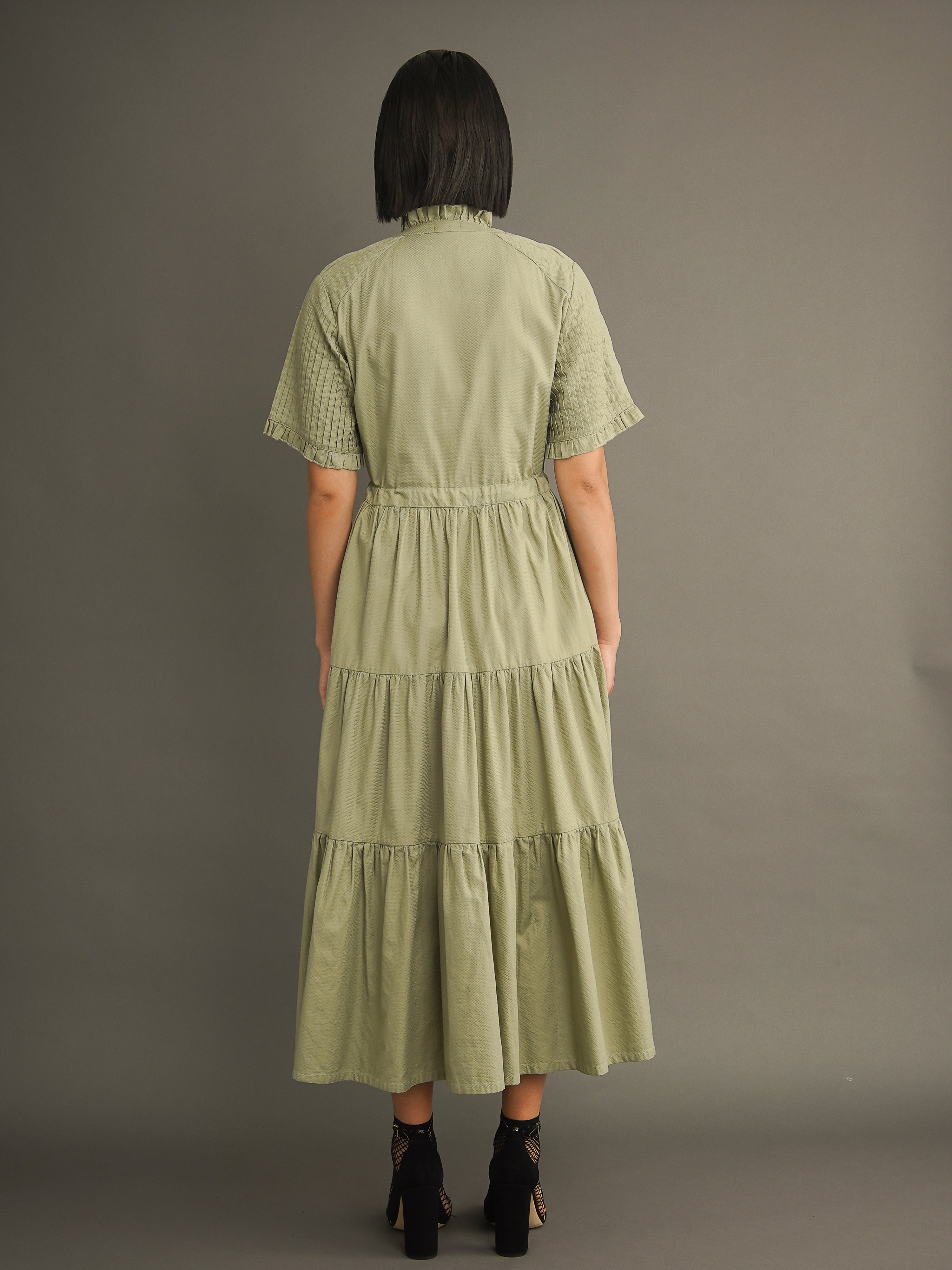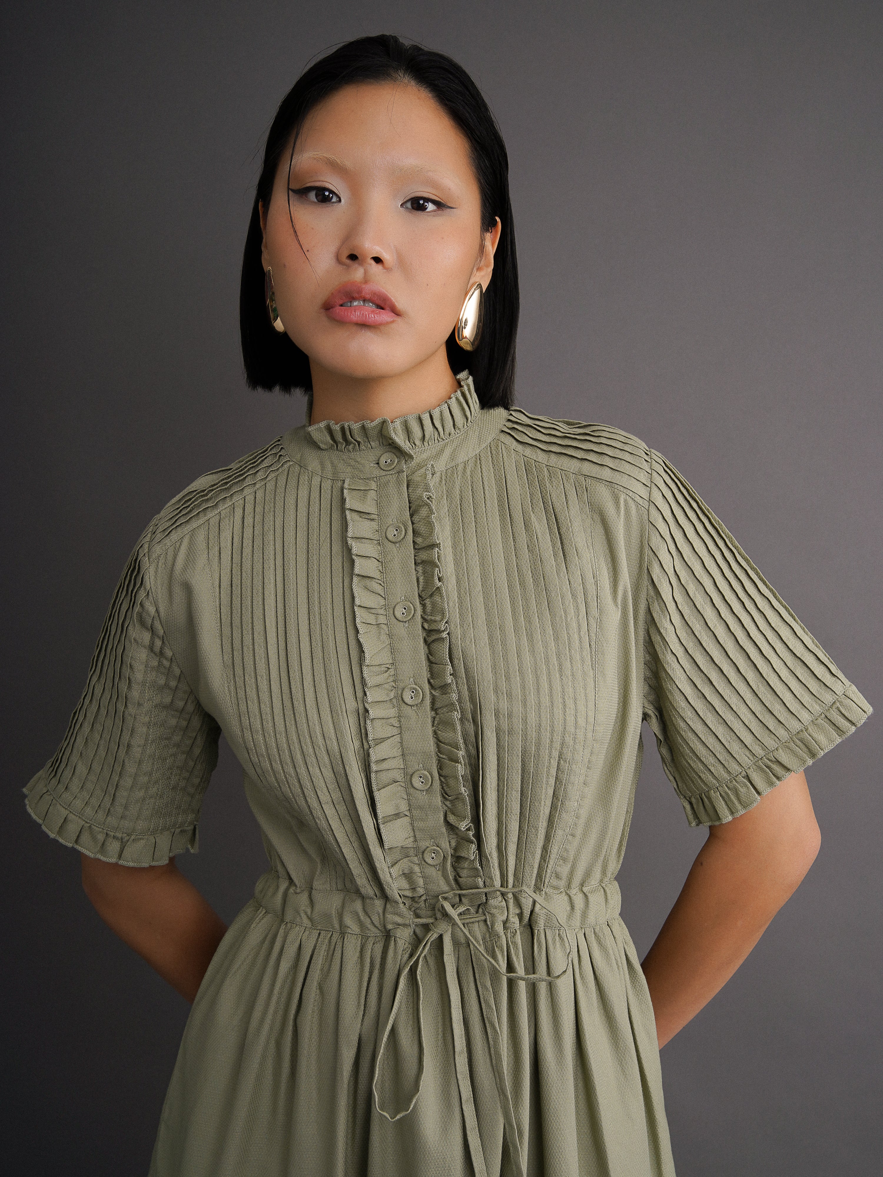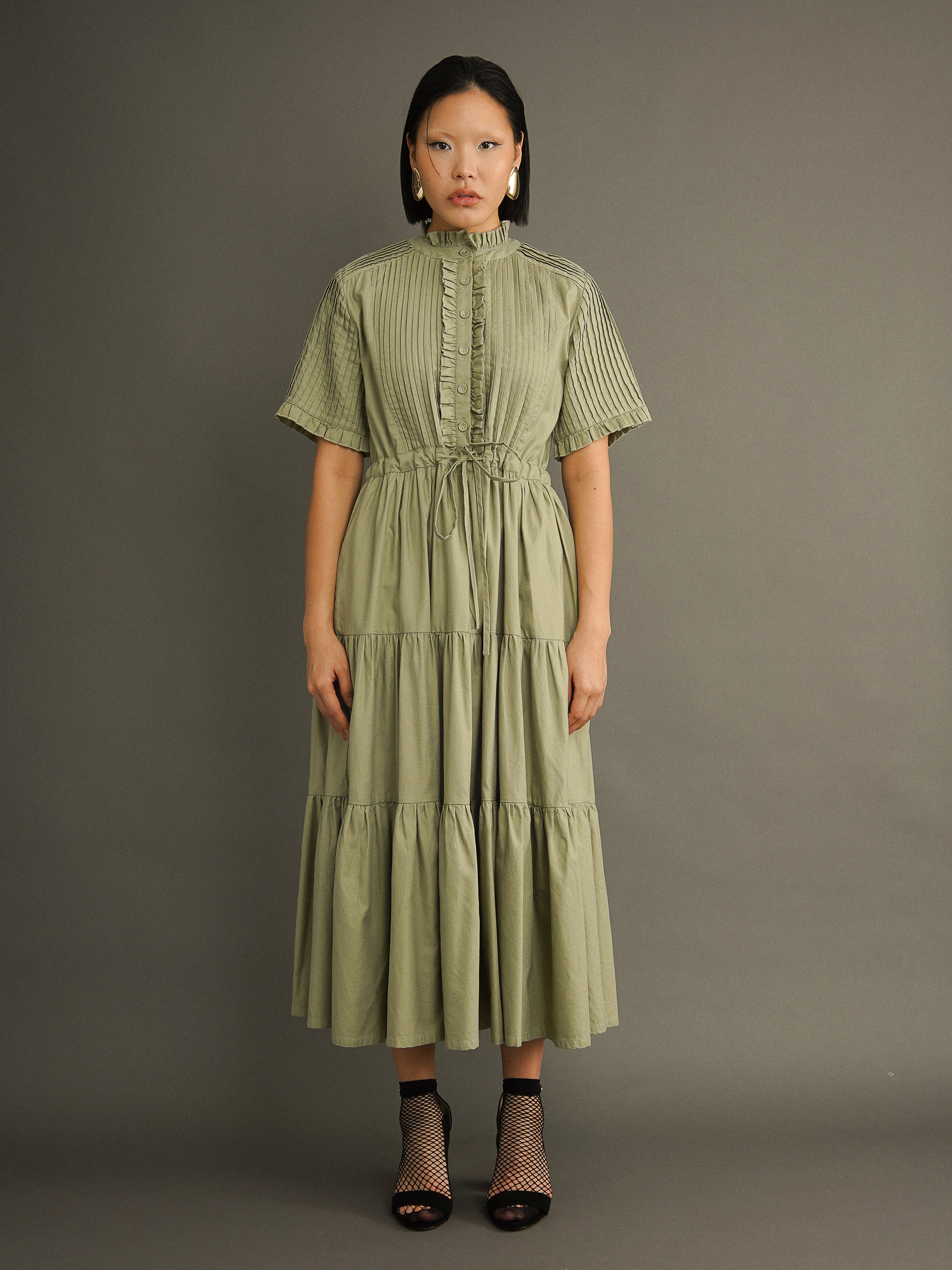 100% heavy Dobby cotton for a textured, structured drape. High-ruffled neckline. Pintuck pleated sleeves. Adjustable drawstring waist. Tiered midi-length skirt. Functional deep pockets.