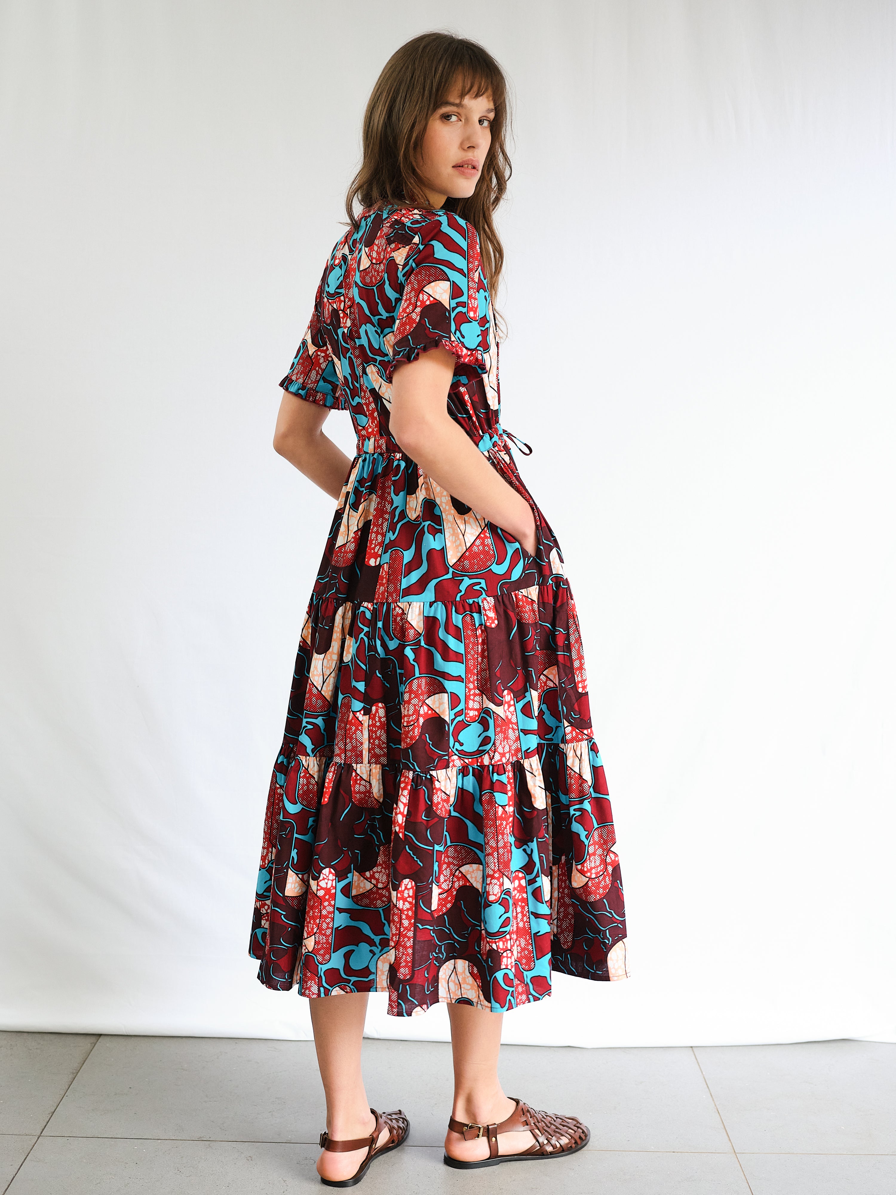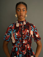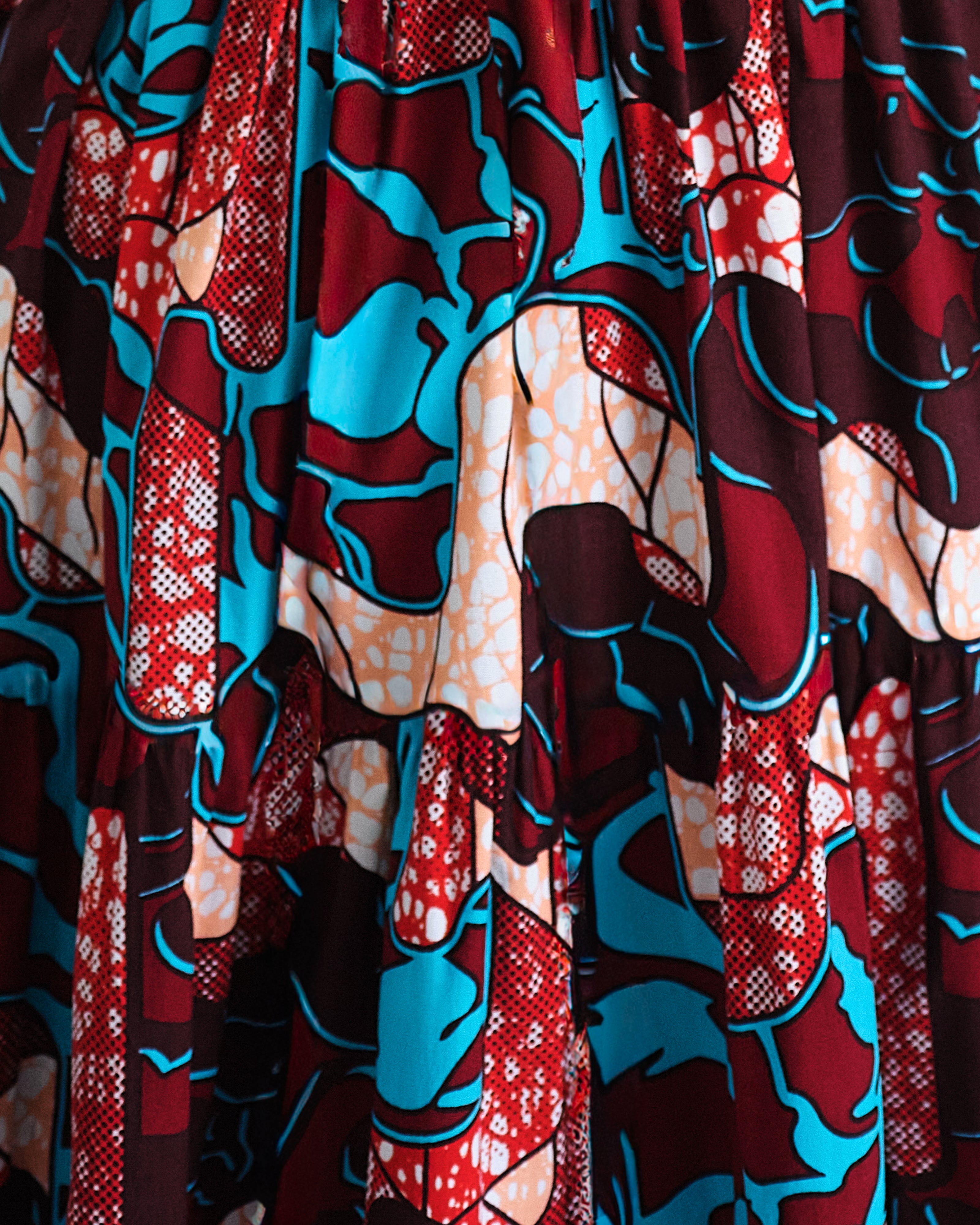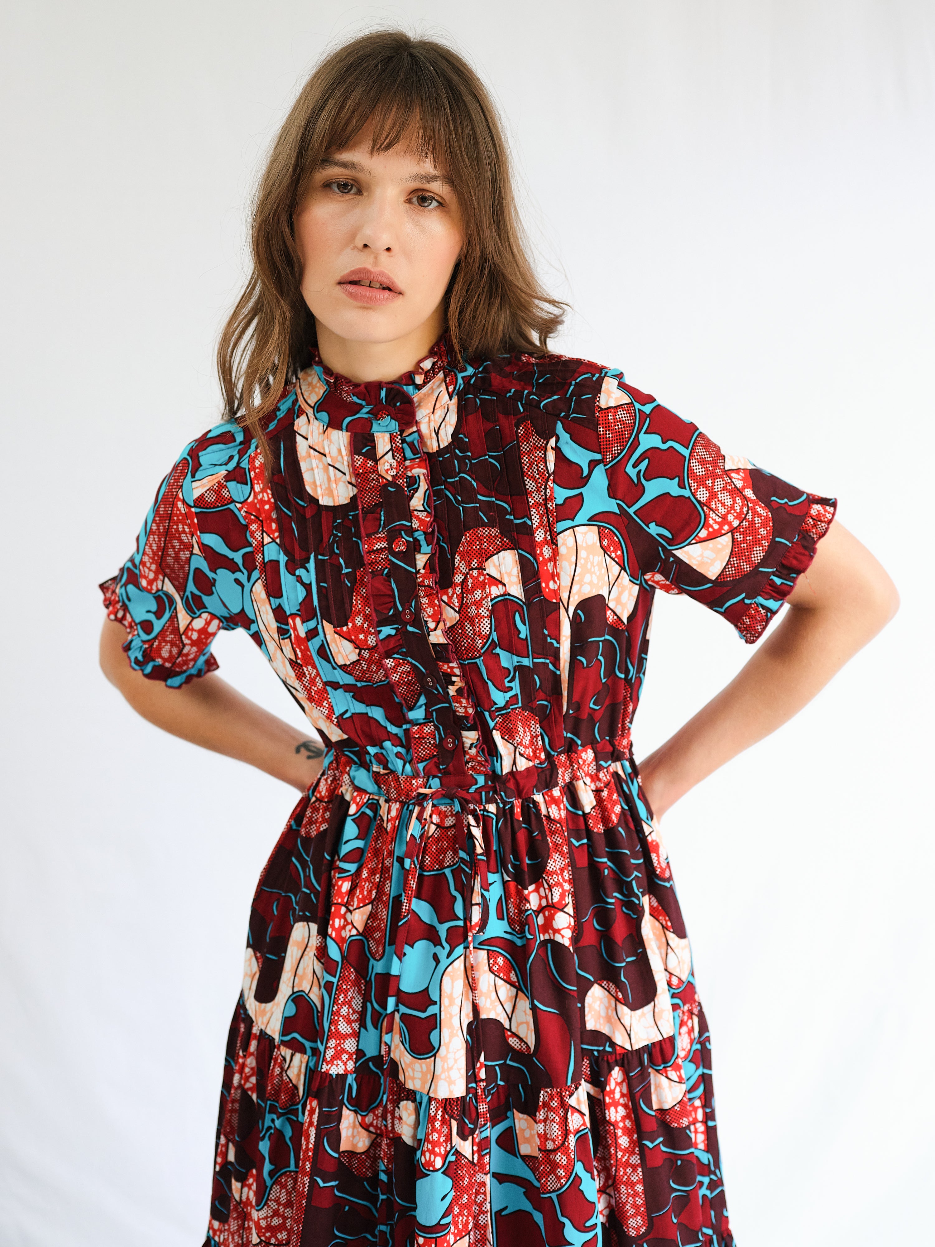 Premium Dutch wax. Structured drape. High-ruffled neckline. Pintuck pleated chest. Adjustable drawstring waist. Tiered midi-length skirt. Functional deep pockets.
