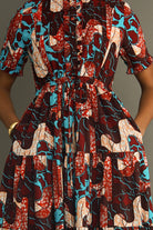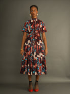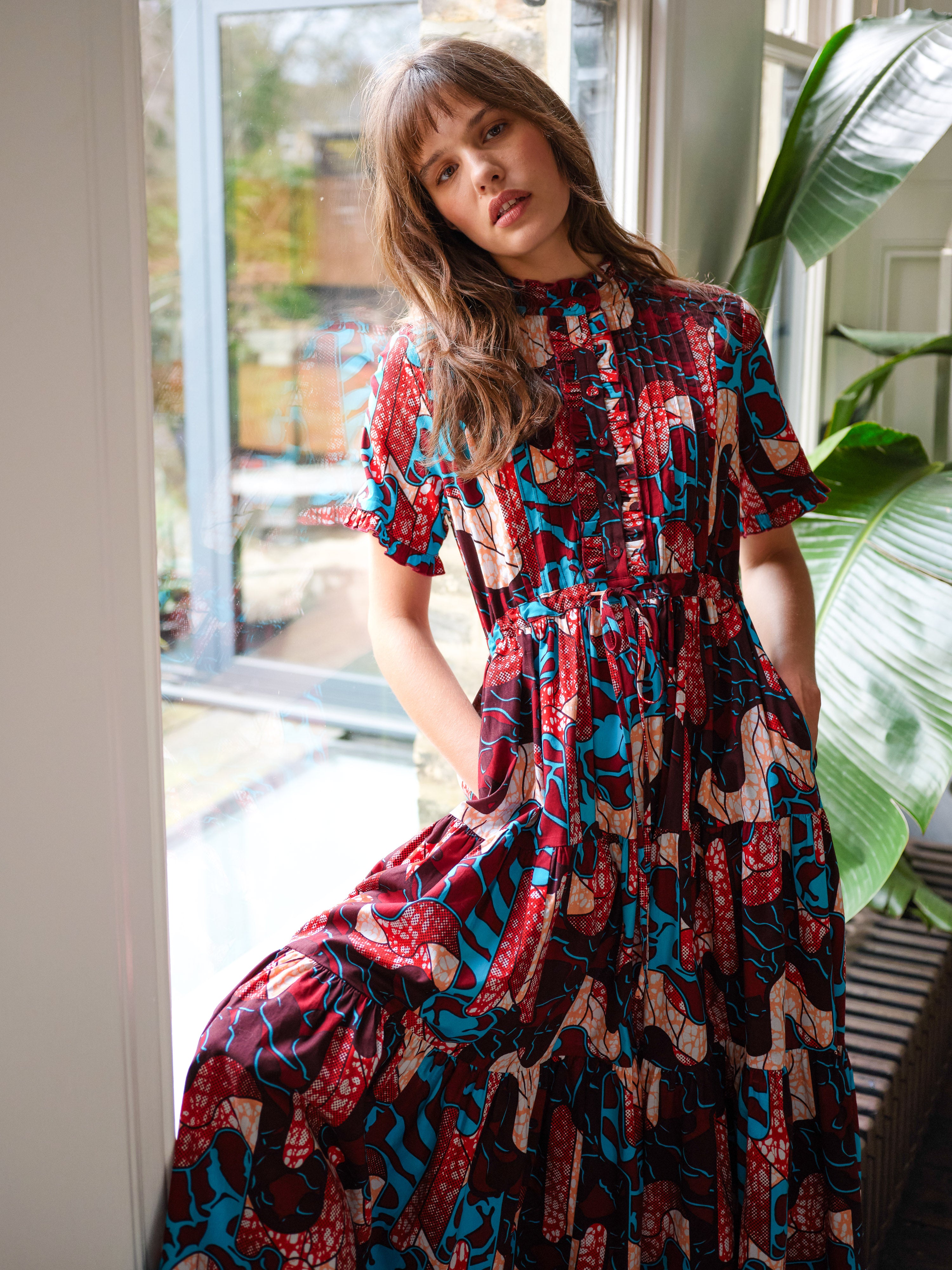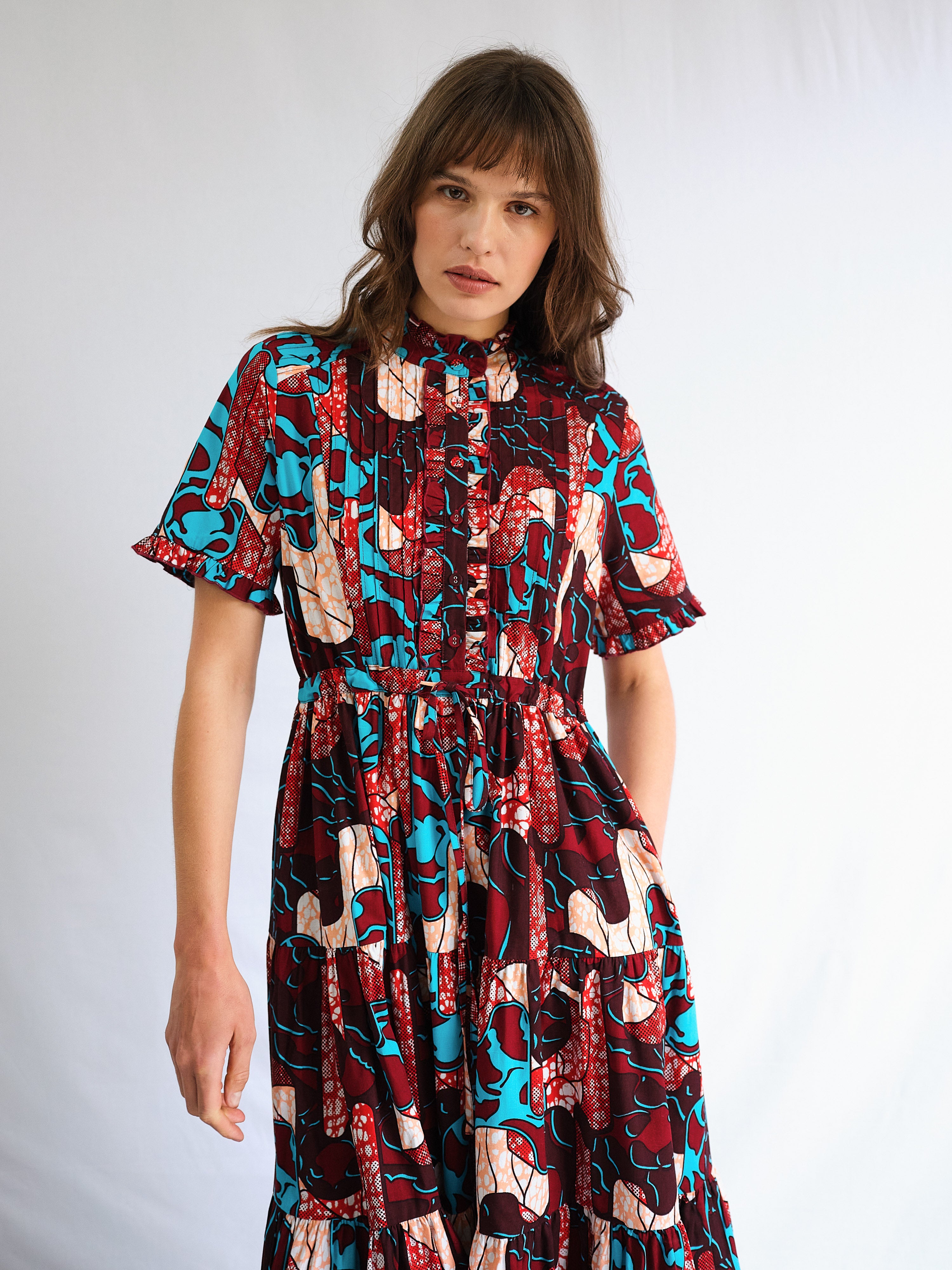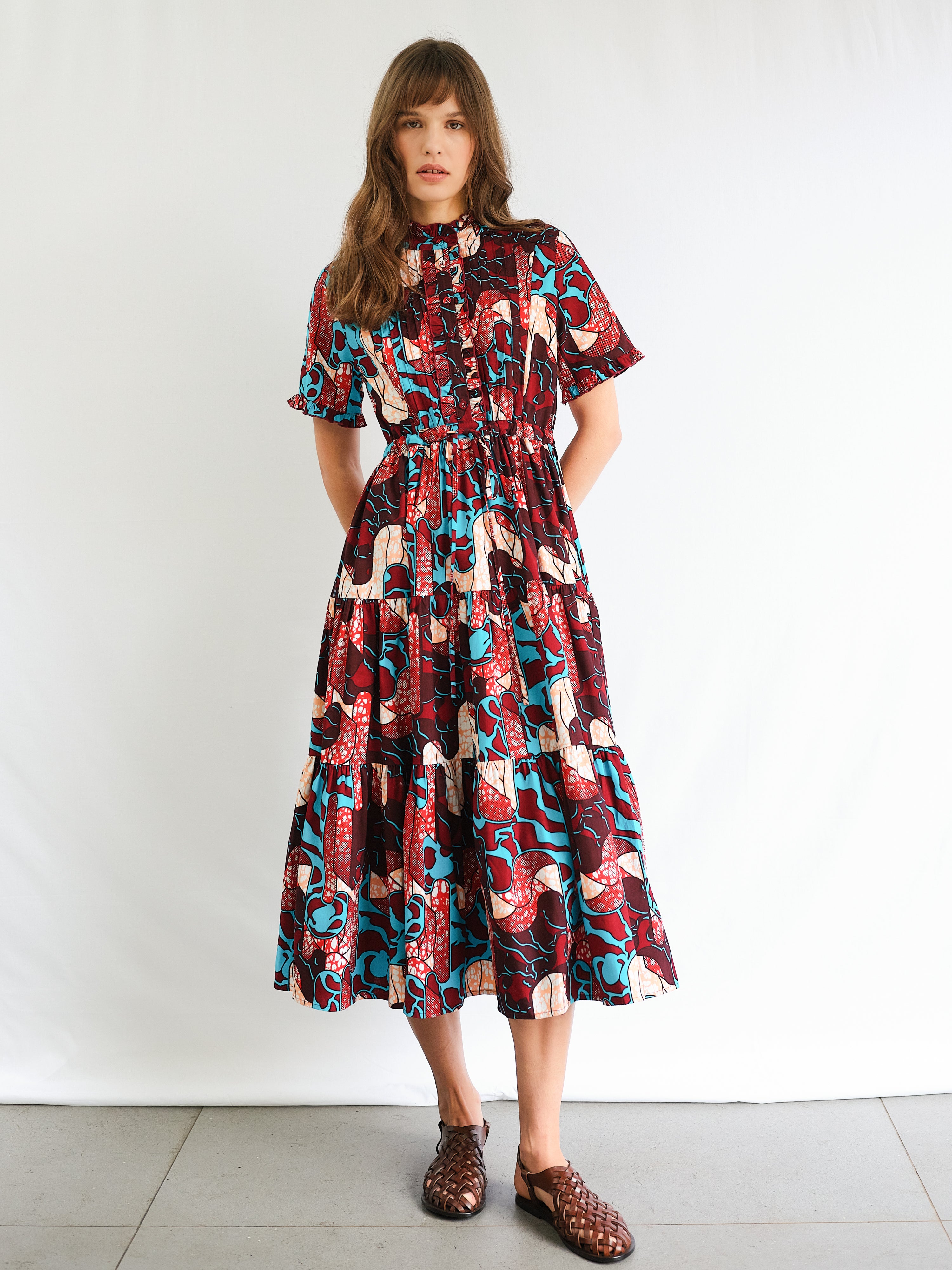 Premium Dutch wax. Structured drape. High-ruffled neckline. Pintuck pleated chest. Adjustable drawstring waist. Tiered midi-length skirt. Functional deep pockets.