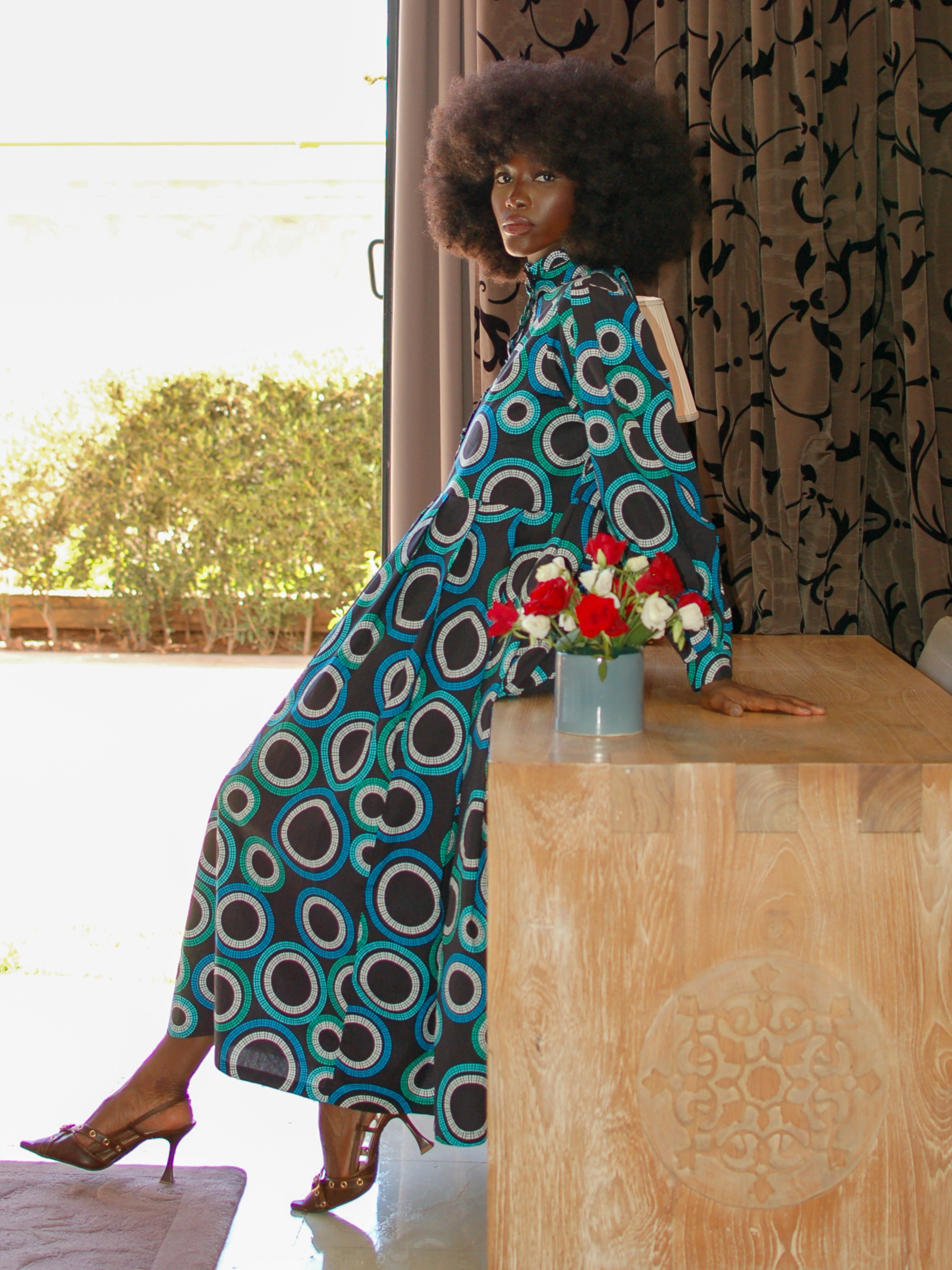 The circular print adds a graphic, modern feel, while the gathered waist and soft pleats create shape without structure. The result is a statement dress that feels as good as it looks.