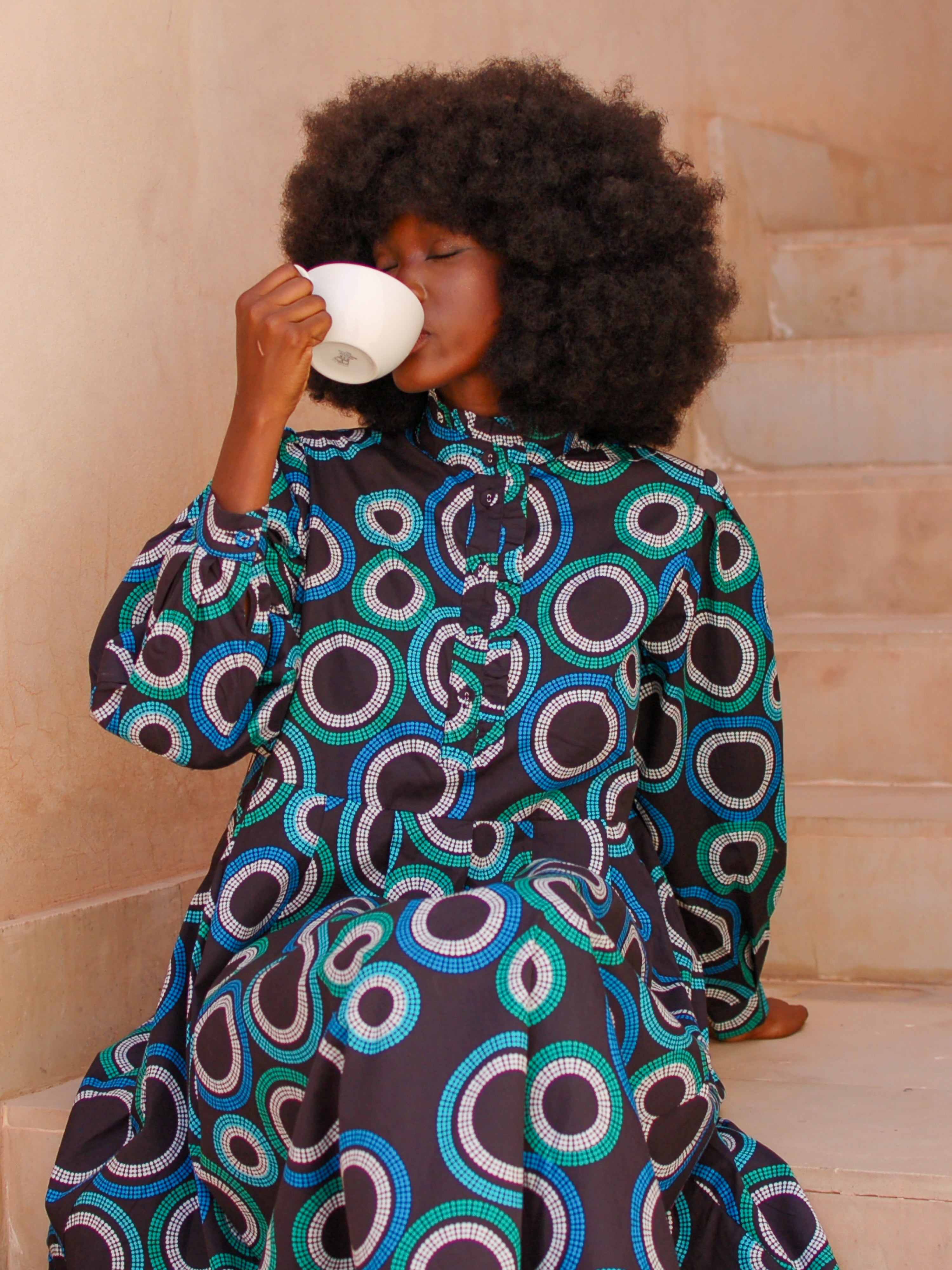 Made from premium 100% poplin cotton, the Circle Dress is a bold, oversized midi dress designed for comfort and ease. It features a high frilled neckline, voluminous long sleeves, and a relaxed silhouette that moves effortlessly with the body.