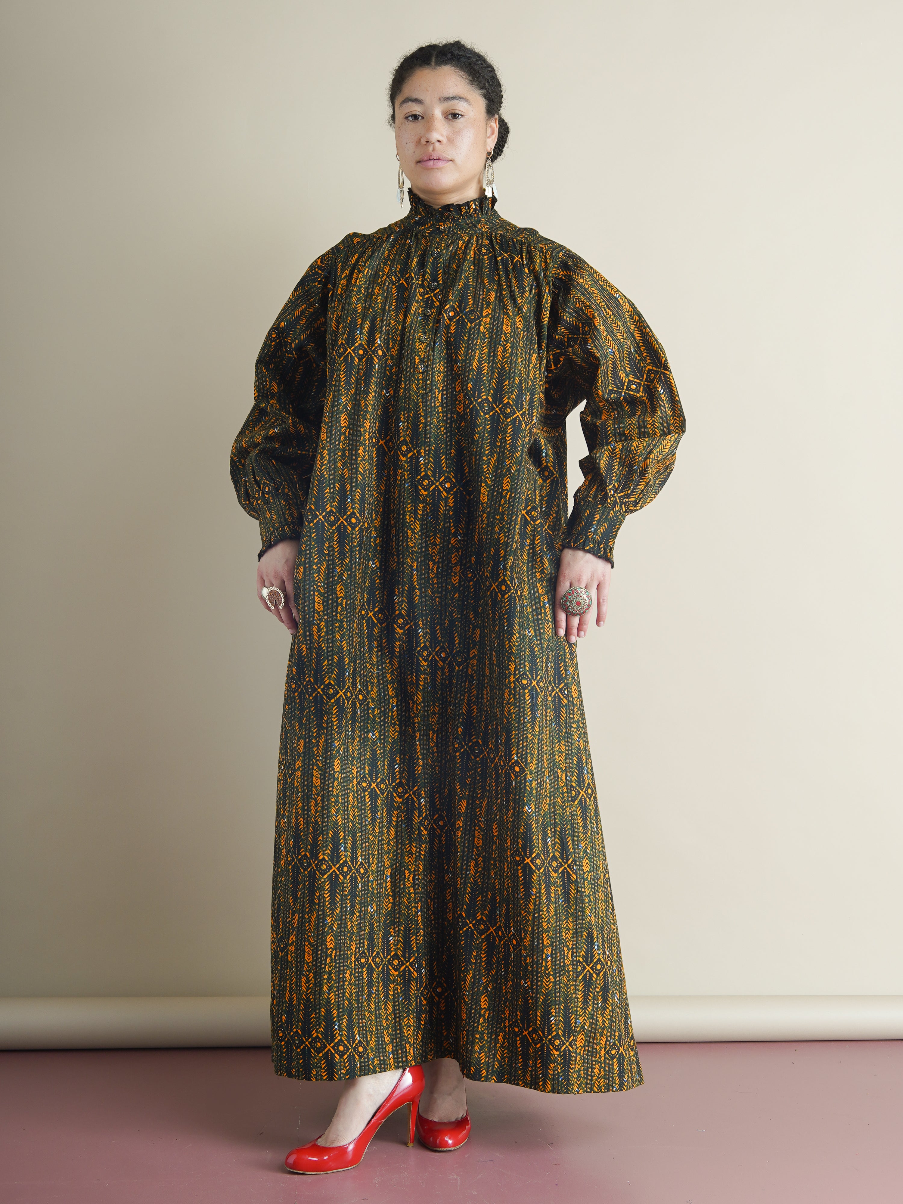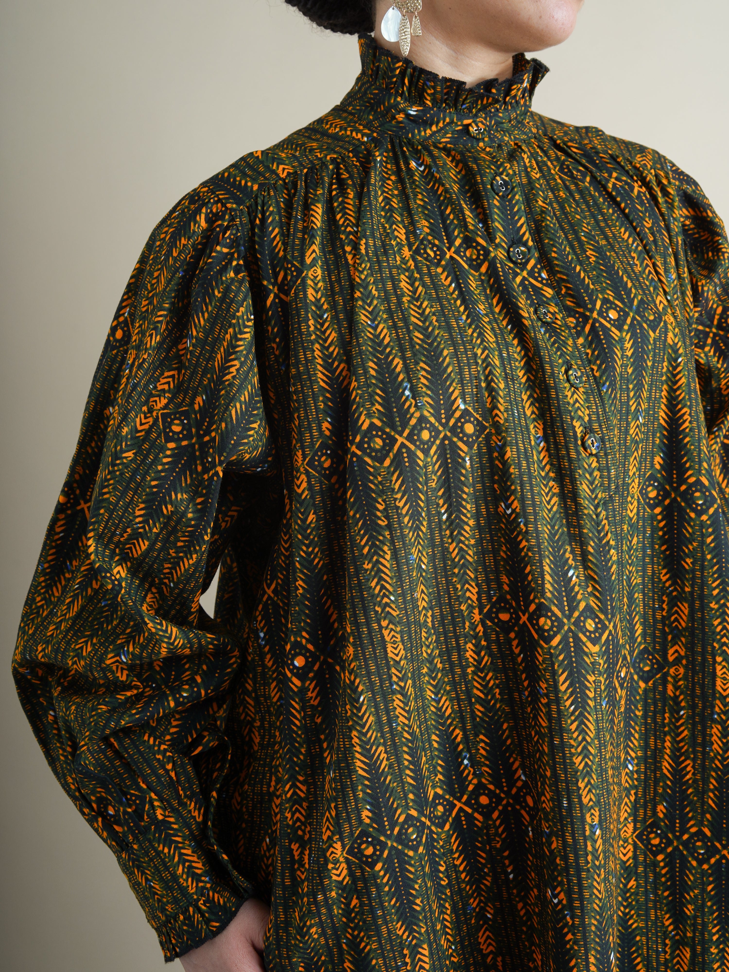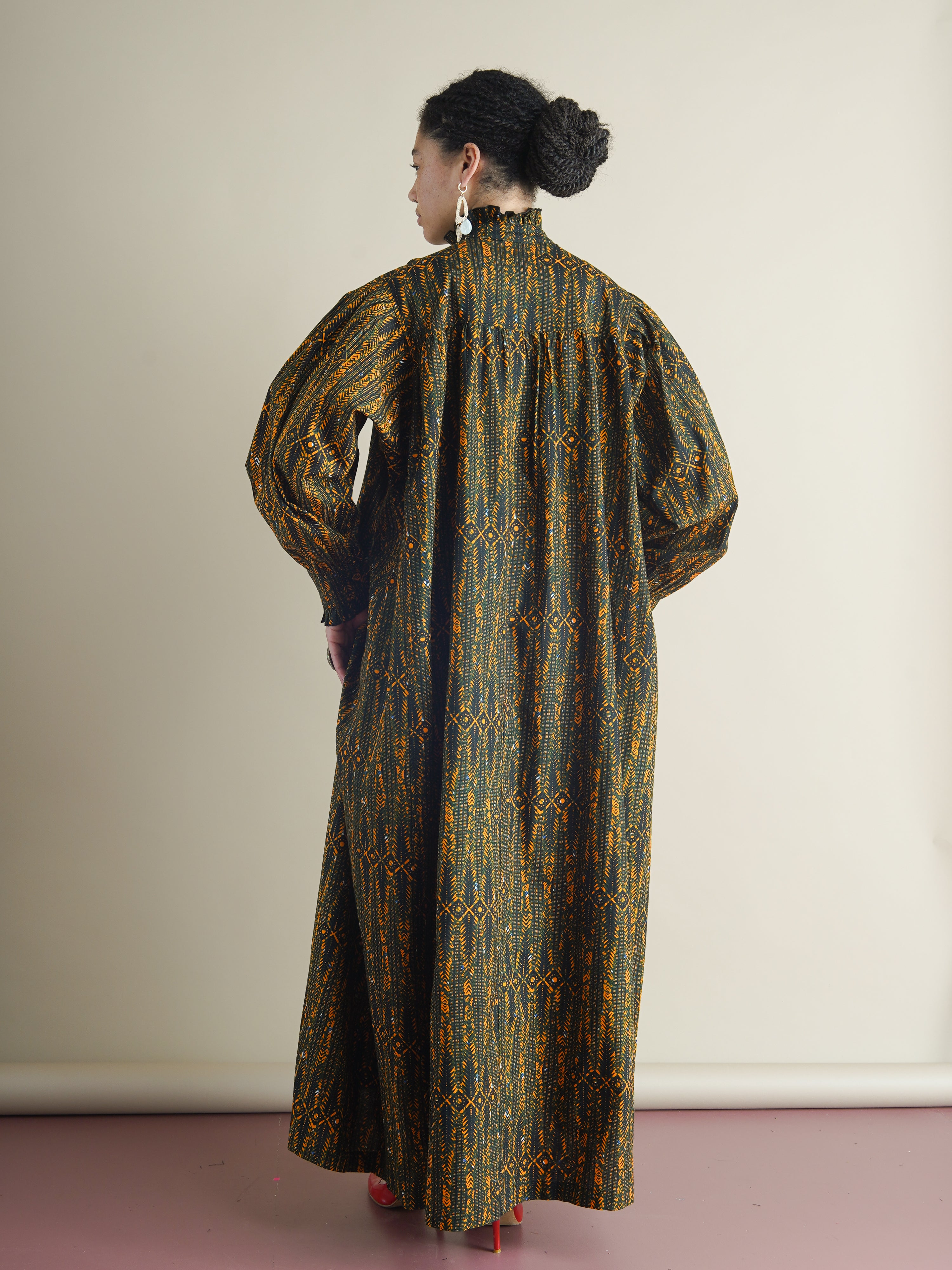 Crafted from 100% mid-weight Dutch wax cotton, this one-of-a-kind piece blends sculptural shape with everyday ease. The vibrant cloth gives structure, allowing the voluminous silhouette to hold its form while still moving with you.