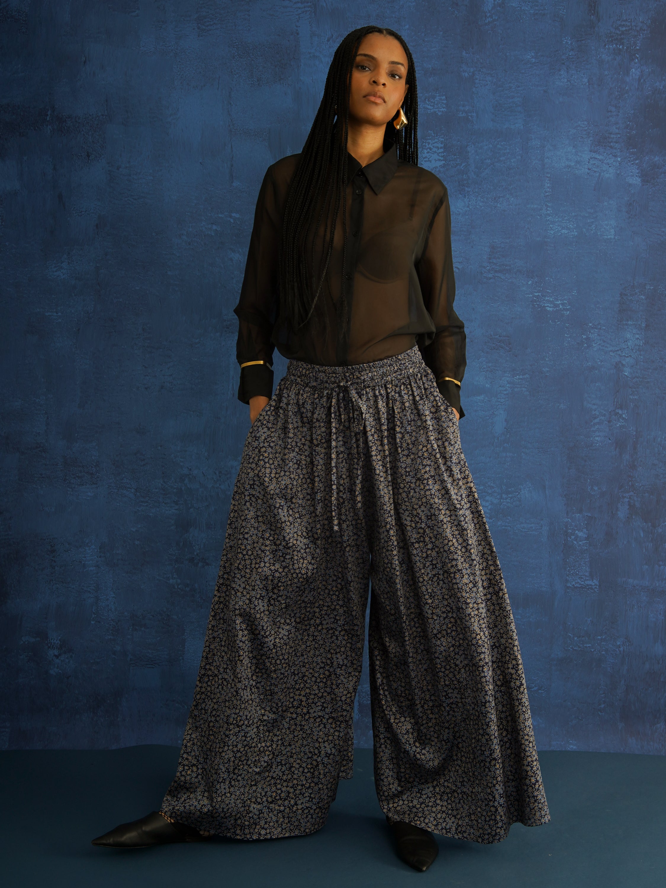 These trousers do not whisper. Cut in a dramatic wide-leg silhouette, these floral palazzo trousers are made from 100% breathable cotton and designed to move with intention.